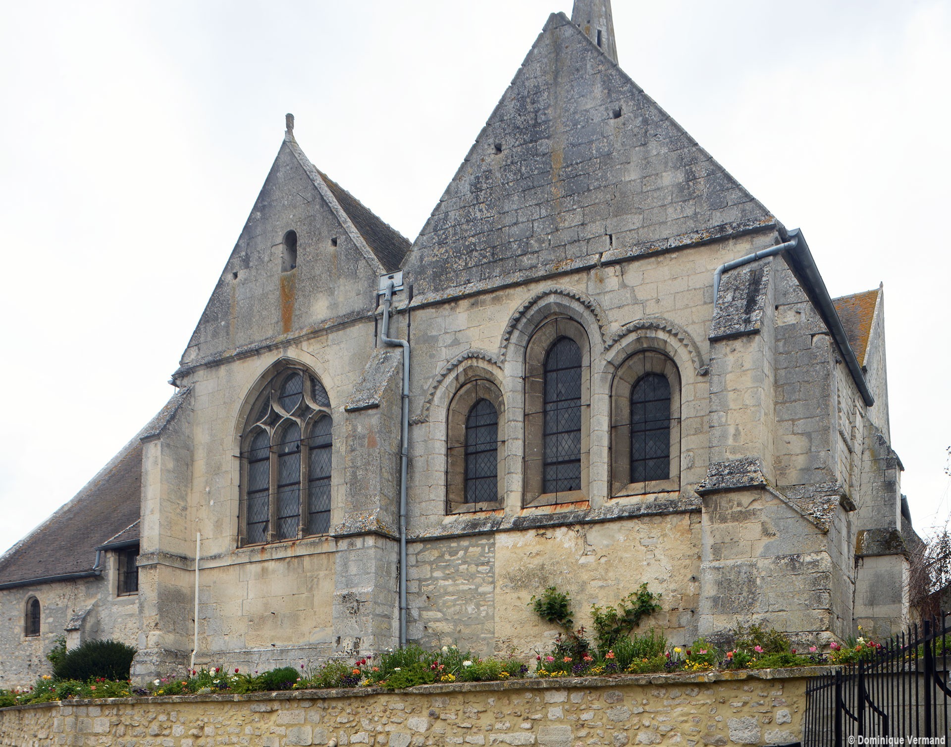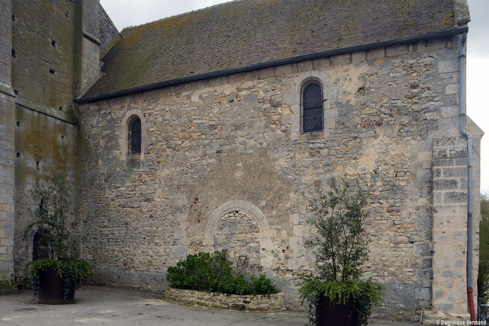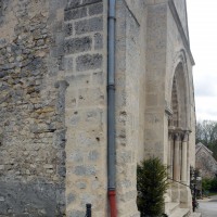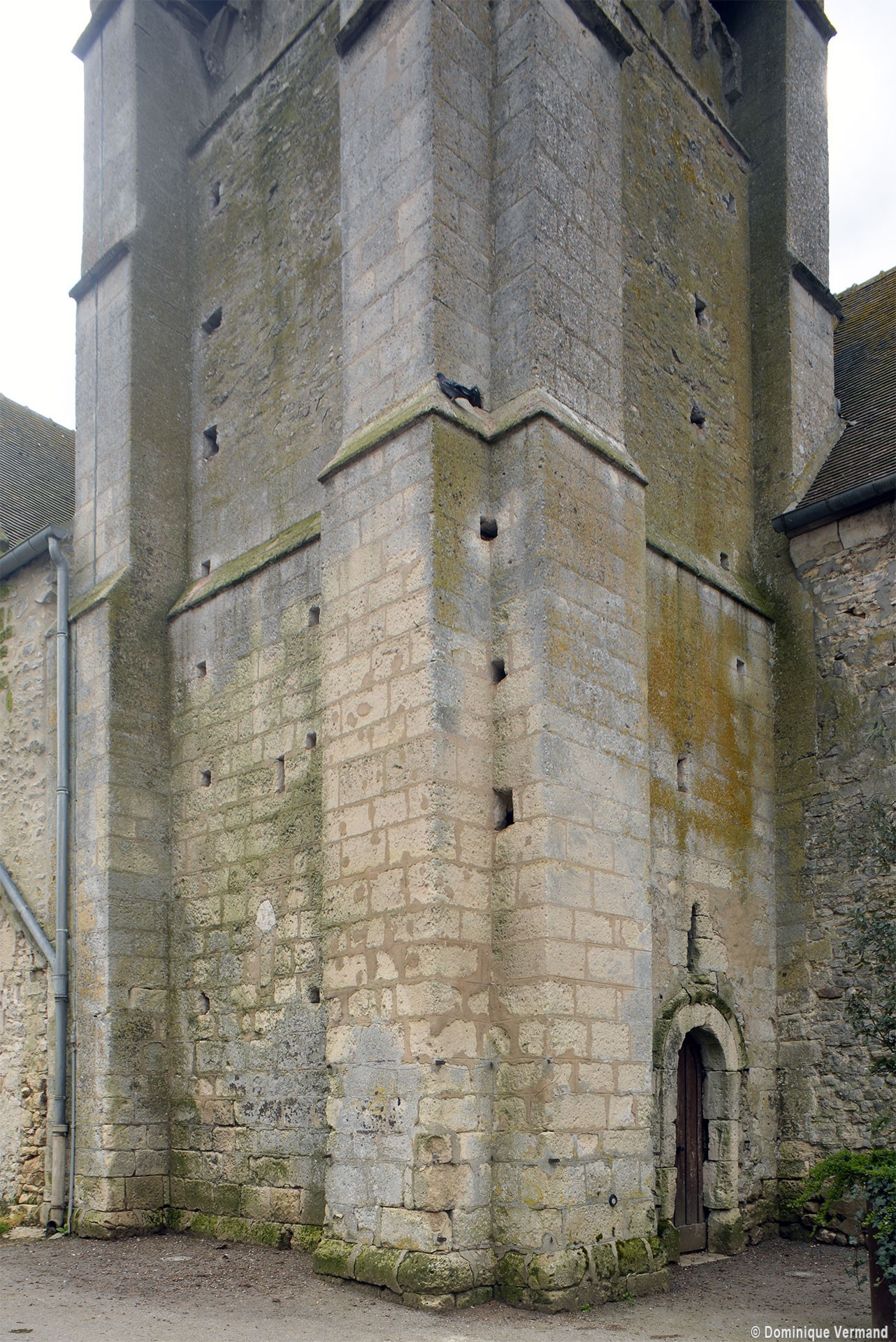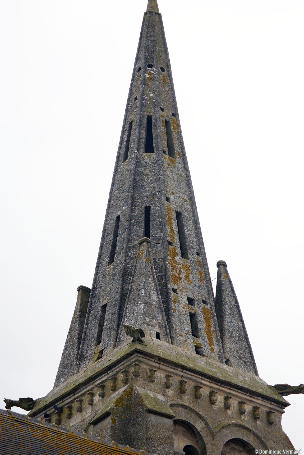 L’église du début du 12ème siècle comprenait une nef sans bas-côtés dont subsistent le mur nord avec une porte en plein cintre aujourd’hui bouchée, un choeur qui a conservé trois chapiteaux à la facture grossière – associés peut-être à l’origine à une voûte d’arêtes – et la partie inférieure du clocher. Son étage de beffroi, ajouré sur chaque face de deux baies géminées recoupées par une colonnette, ne sera édifié qu’un peu plus tard, dans les années 1140. C’est également la date de la flèche octogonale, garnie de petites pyramides d’angle et assez proche de celle de Béthisy-Saint-Martin. En partie haute, les contreforts empiètent d’une manière inesthétique sur les baies, résultat de travaux de renforcements réalisés au 16ème siècle et rendus nécessaires afin assurer une bonne stabilité à la flèche.