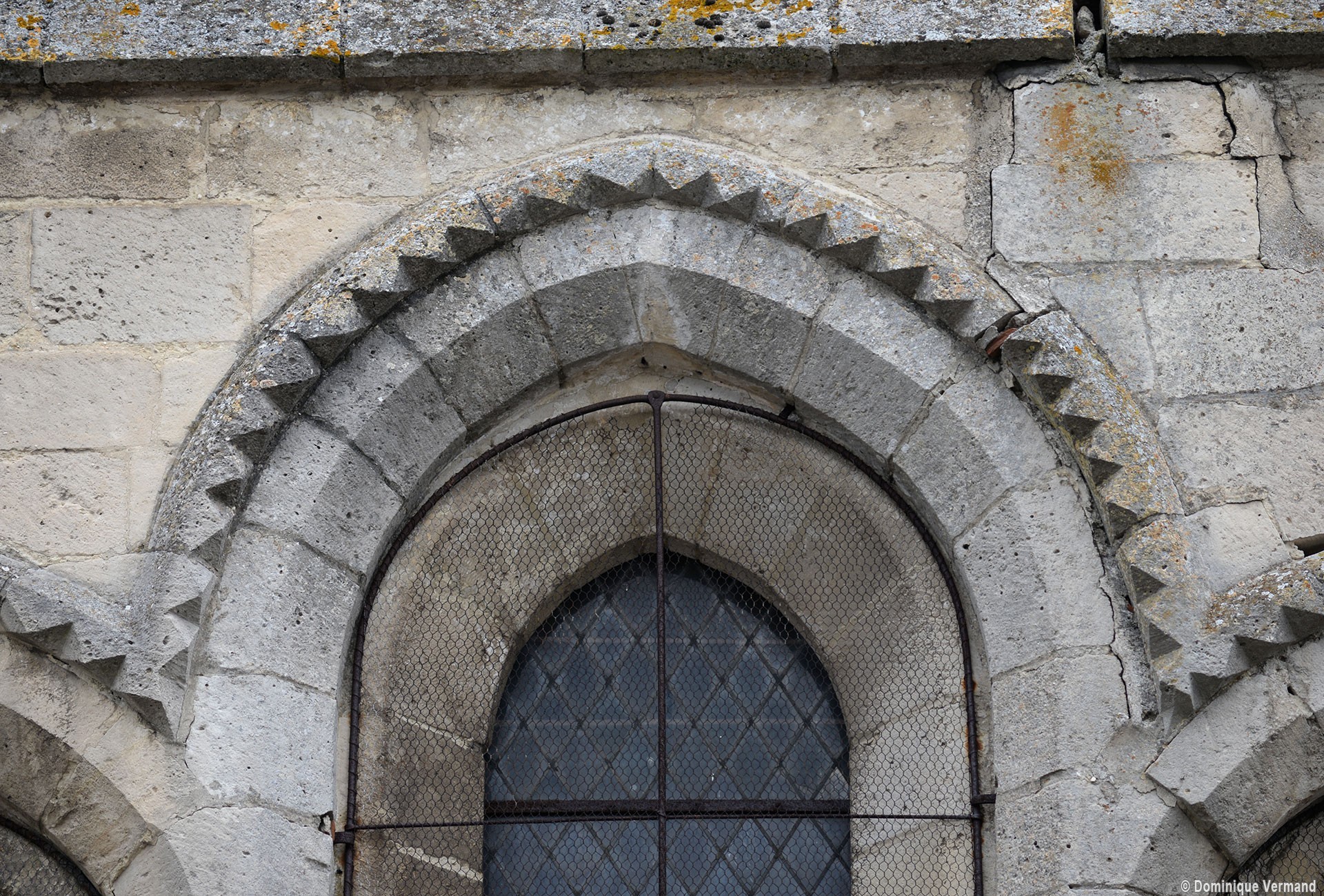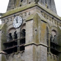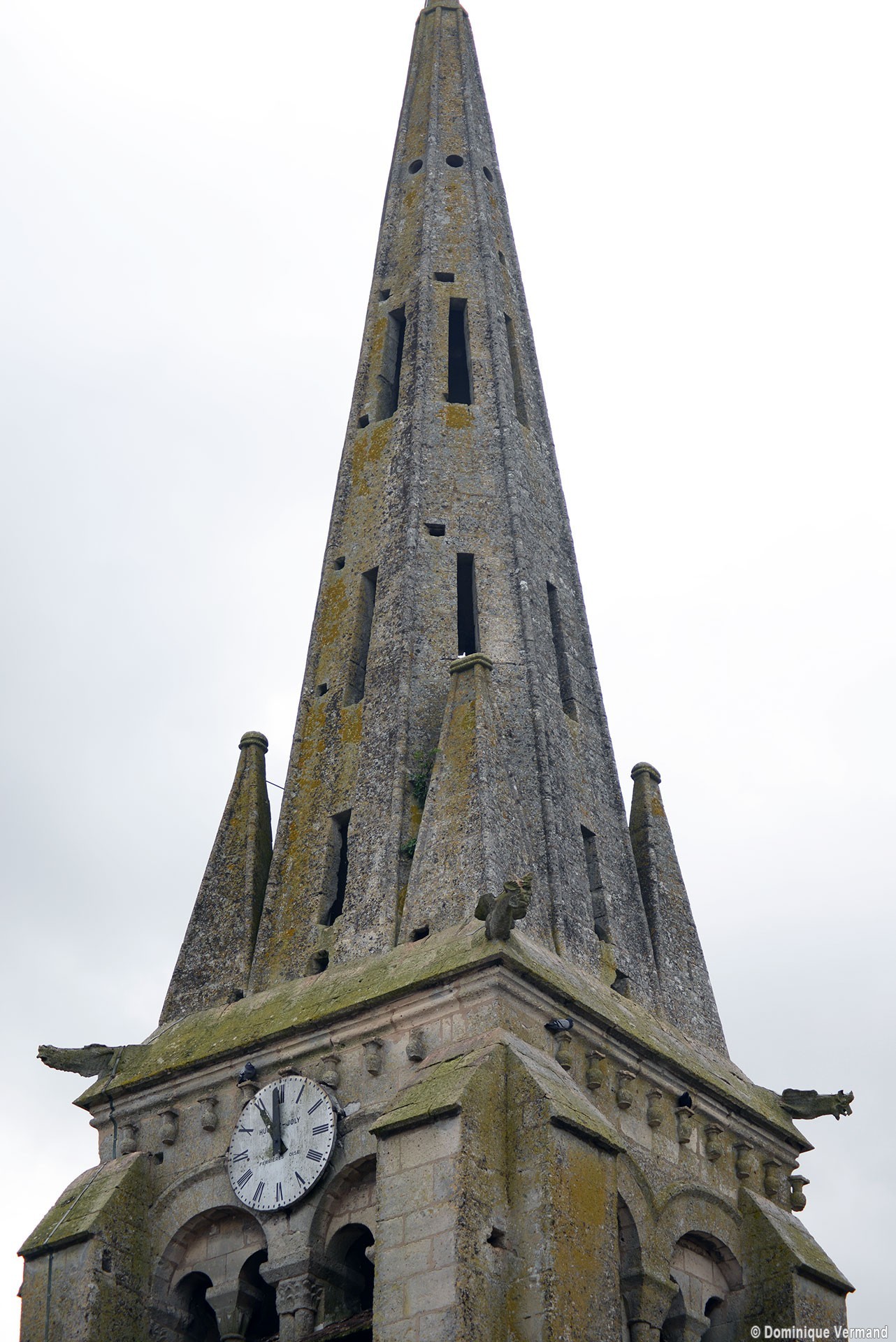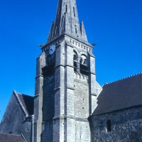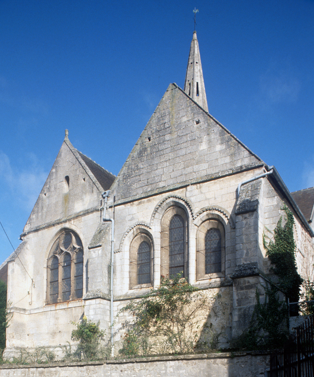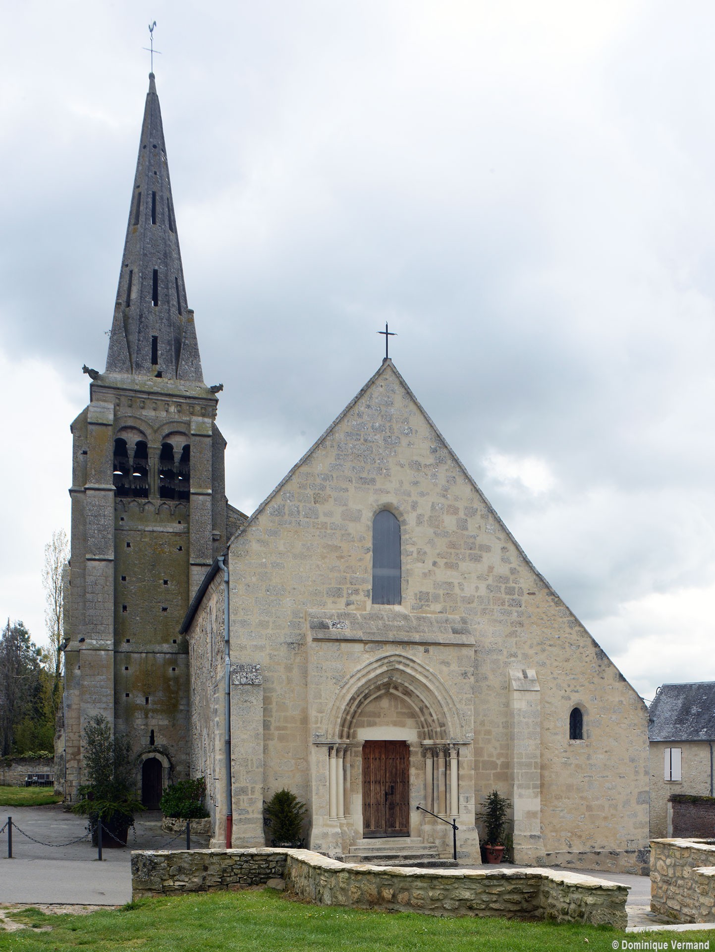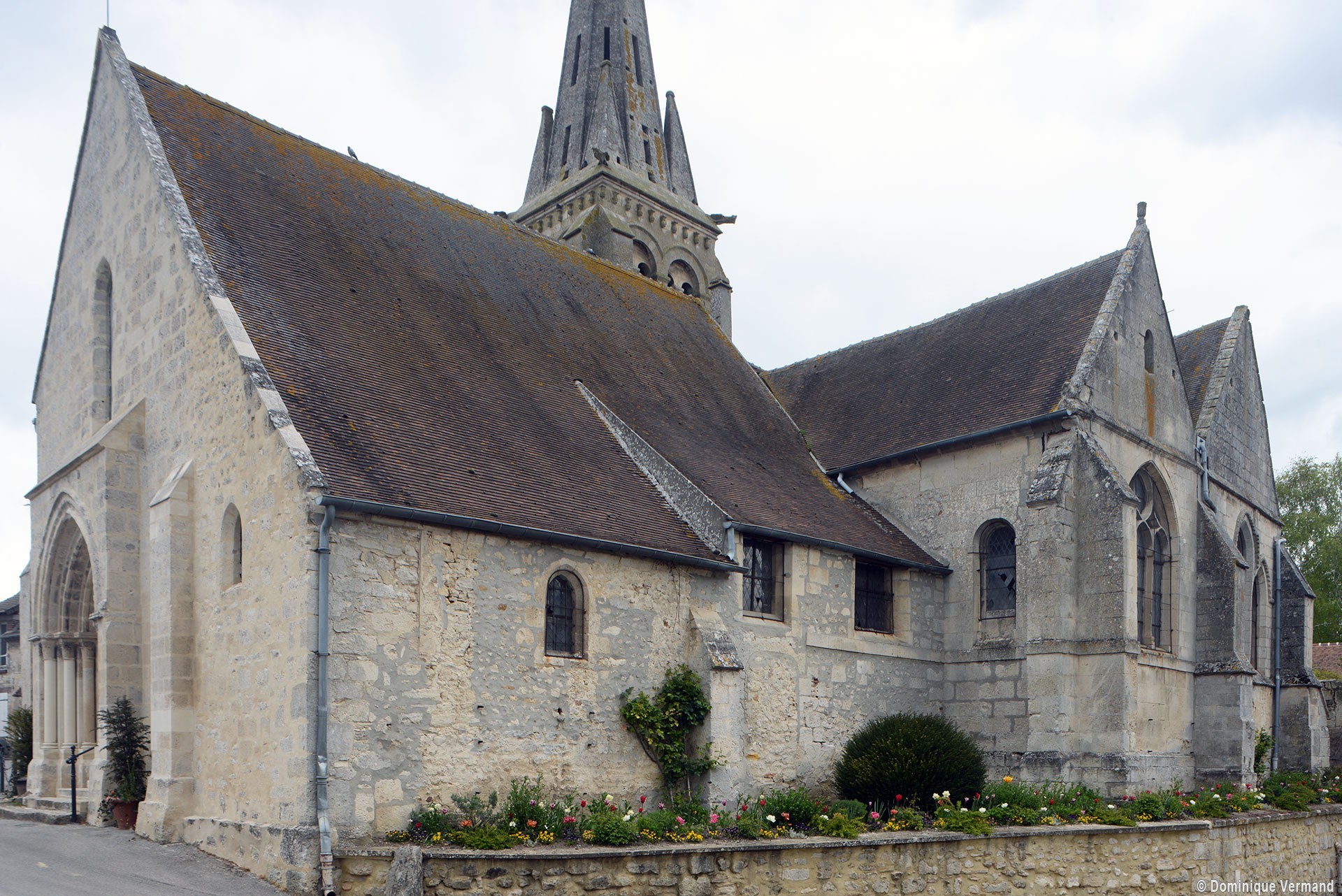 L’église du début du 12ème siècle comprenait une nef sans bas-côtés dont subsistent le mur nord avec une porte en plein cintre aujourd’hui bouchée, un choeur qui a conservé trois chapiteaux à la facture grossière – associés peut-être à l’origine à une voûte d’arêtes – et la partie inférieure du clocher. Son étage de beffroi, ajouré sur chaque face de deux baies géminées recoupées par une colonnette, ne sera édifié qu’un peu plus tard, dans les années 1140. C’est également la date de la flèche octogonale, garnie de petites pyramides d’angle et assez proche de celle de Béthisy-Saint-Martin. En partie haute, les contreforts empiètent d’une manière inesthétique sur les baies, résultat de travaux de renforcements réalisés au 16ème siècle et rendus nécessaires afin assurer une bonne stabilité à la flèche.