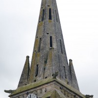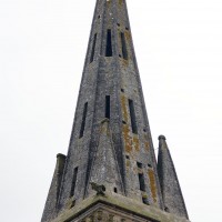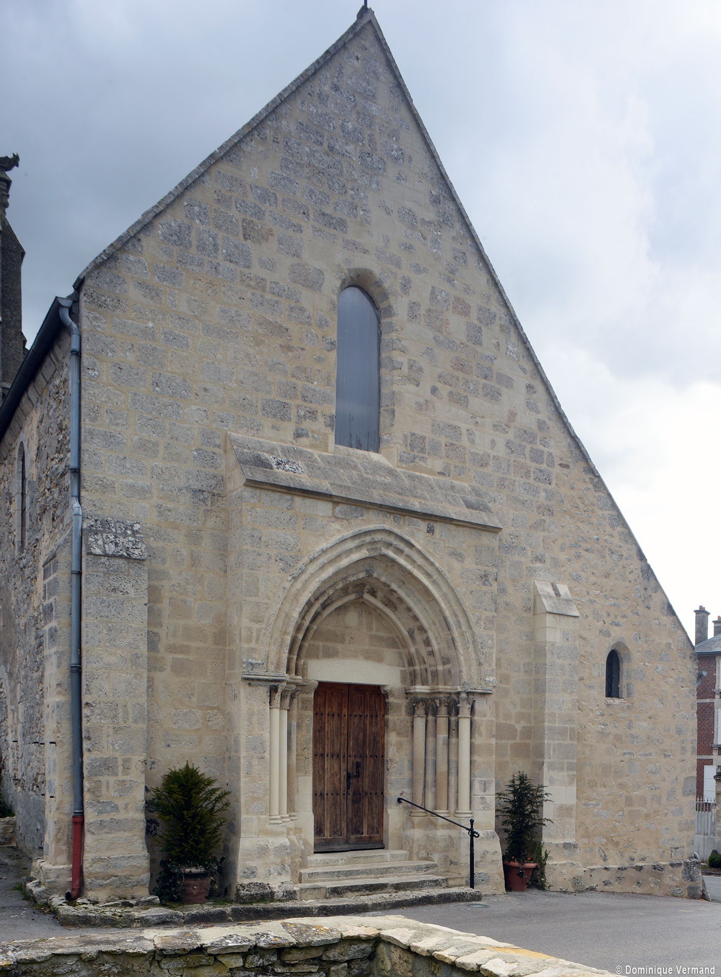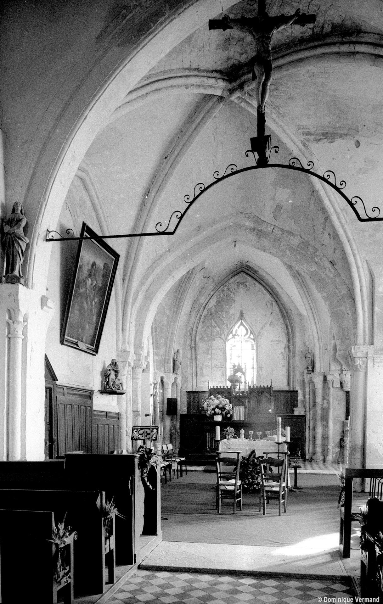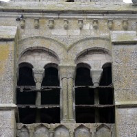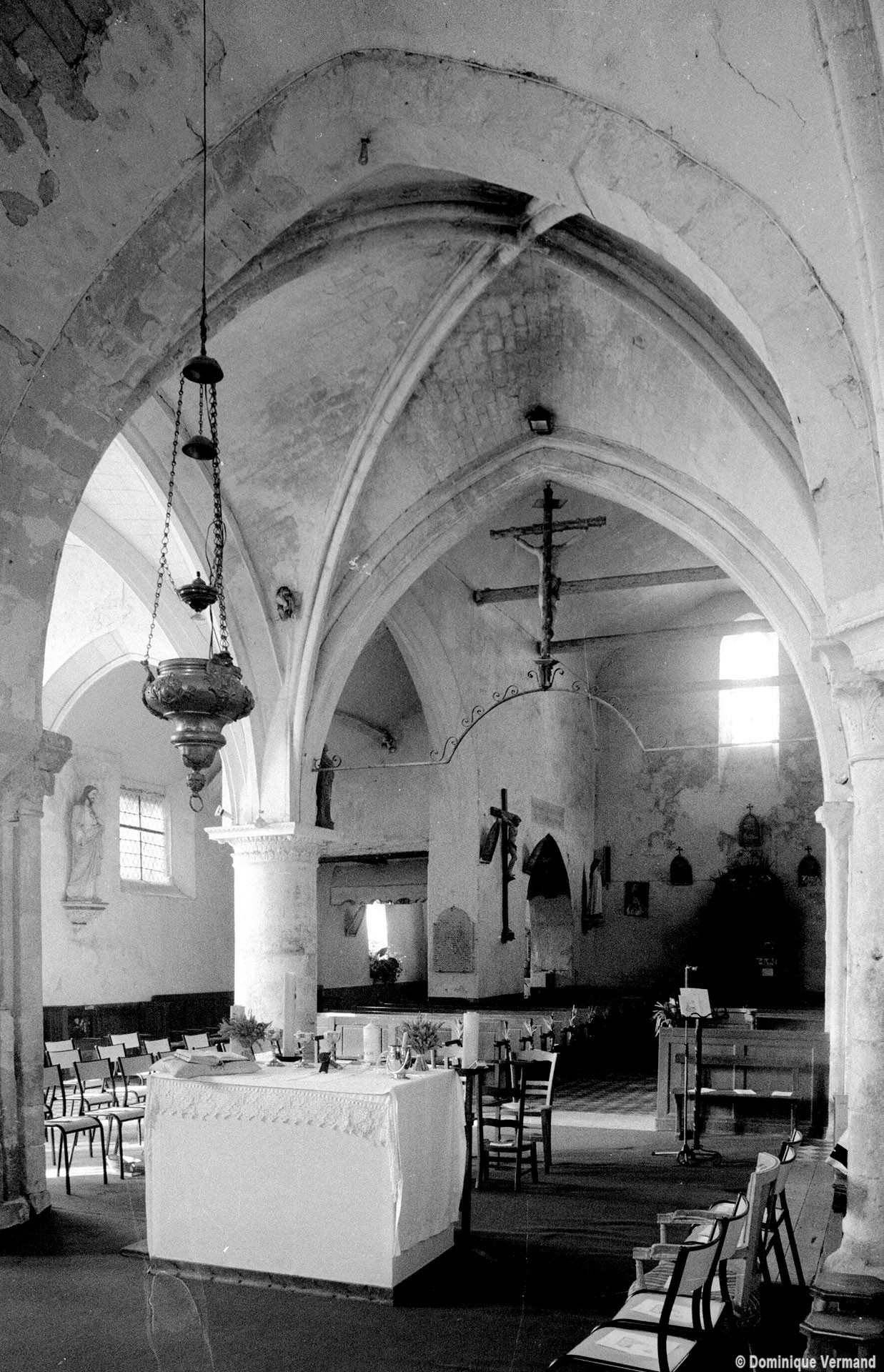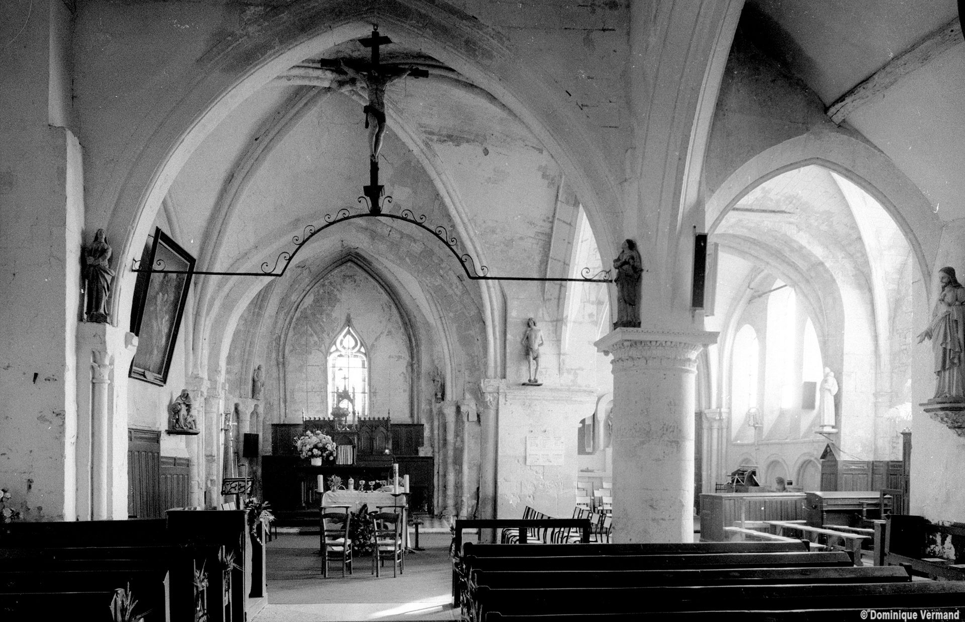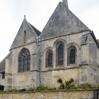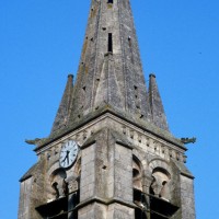 L’église du début du 12ème siècle comprenait une nef sans bas-côtés dont subsistent le mur nord avec une porte en plein cintre aujourd’hui bouchée, un choeur qui a conservé trois chapiteaux à la facture grossière – associés peut-être à l’origine à une voûte d’arêtes – et la partie inférieure du clocher. Son étage de beffroi, ajouré sur chaque face de deux baies géminées recoupées par une colonnette, ne sera édifié qu’un peu plus tard, dans les années 1140. C’est également la date de la flèche octogonale, garnie de petites pyramides d’angle et assez proche de celle de Béthisy-Saint-Martin. En partie haute, les contreforts empiètent d’une manière inesthétique sur les baies, résultat de travaux de renforcements réalisés au 16ème siècle et rendus nécessaires afin assurer une bonne stabilité à la flèche.