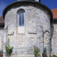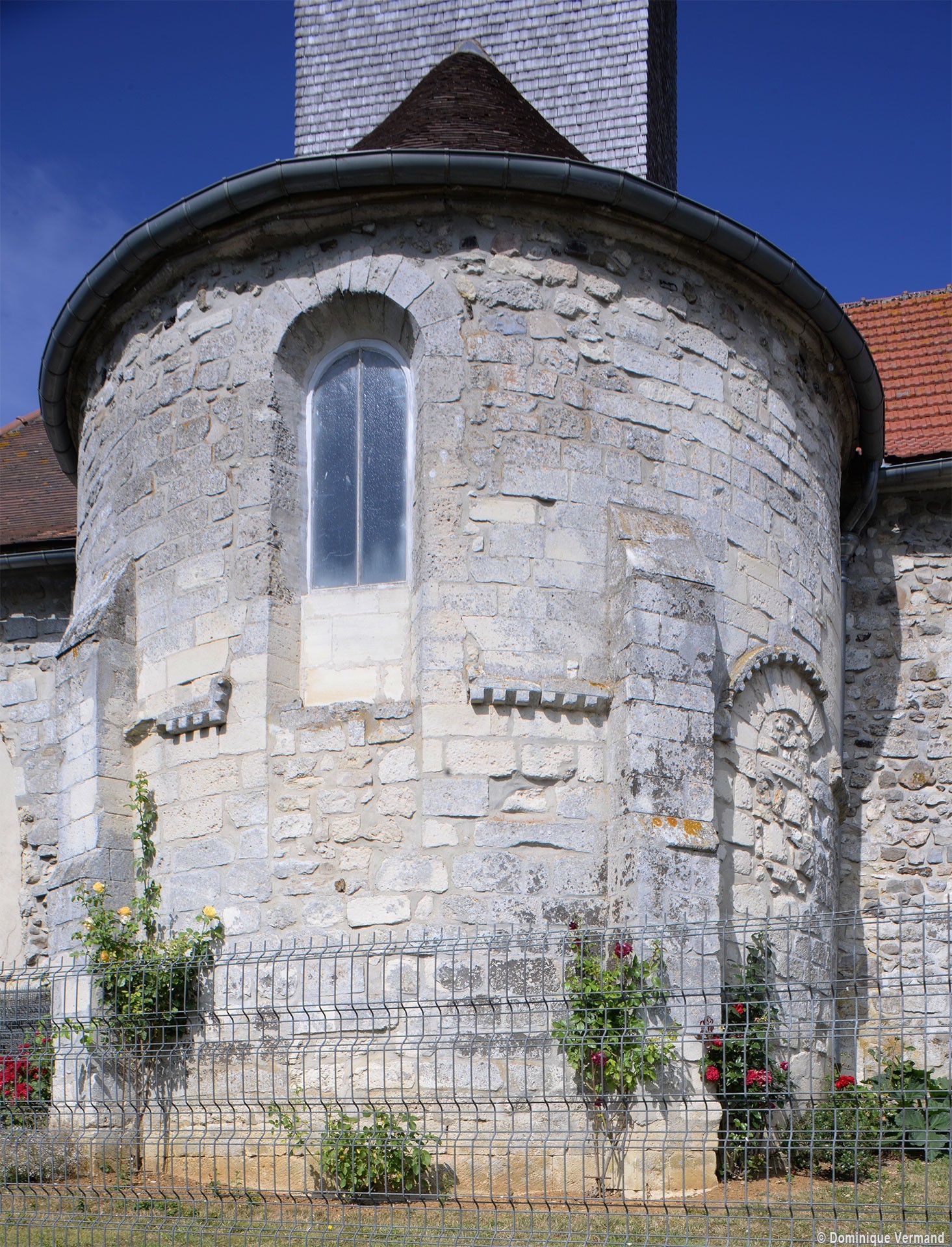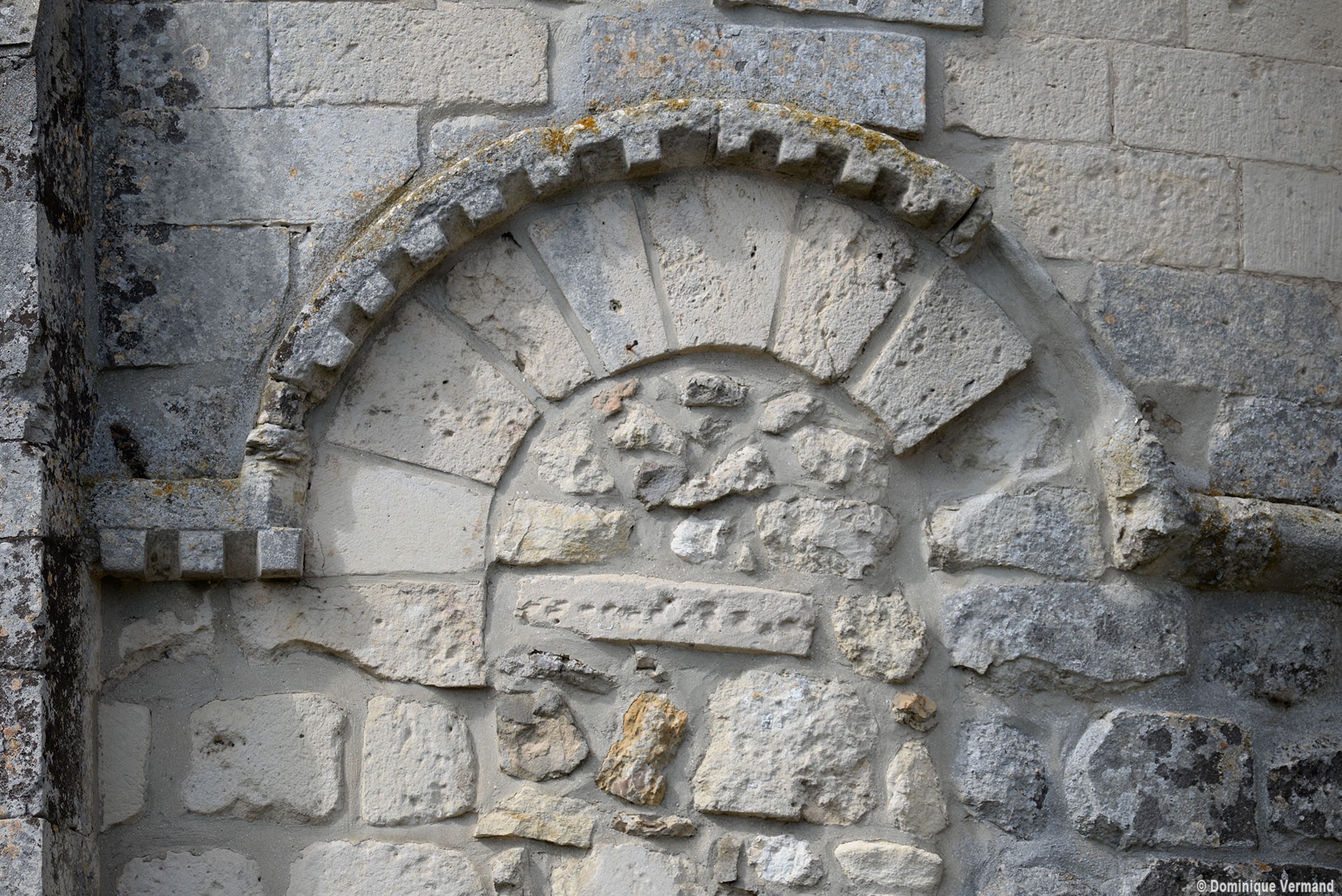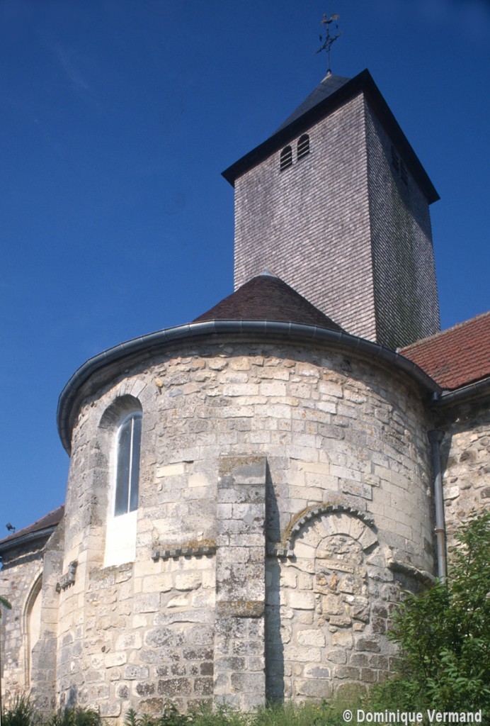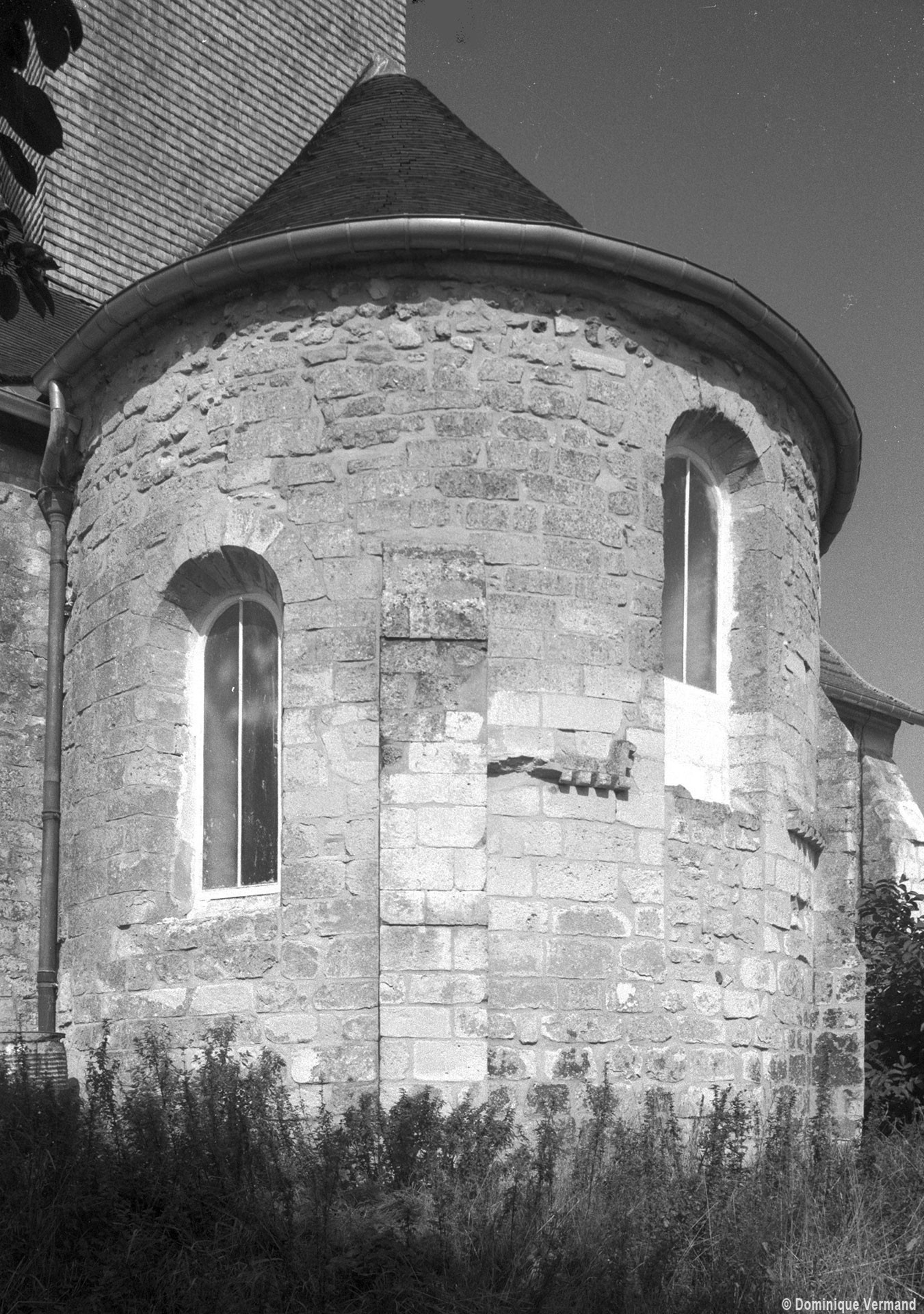 C’est un édifice maintes fois remanié, dont la partie la plus ancienne est l’abside en hémicycle qu’une fenêtre avec décor de billettes et deux contreforts plats permettent de dater de la fin du 11ème siècle. Un cul-de-four aujourd’hui disparu la couvrait selon toute vraisemblance à l’origine. Une simple nef sans bas-côtés lui était certainement associée mais des travaux importants intervinrent peu après le milieu du 12ème siècle avec la construction d’un petit transept et d’une nouvelle nef de trois travées avec bas-côtés. Il en reste le croisillon nord ainsi que le mur gouttereau attenant, avec ses trois arcades brisées, aujourd’hui bouchées par suite de la démolition du bas-côté. C’est à la même époque que l’abside fut surélevée et que deux de ses trois fenêtres primitives furent allongées.