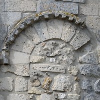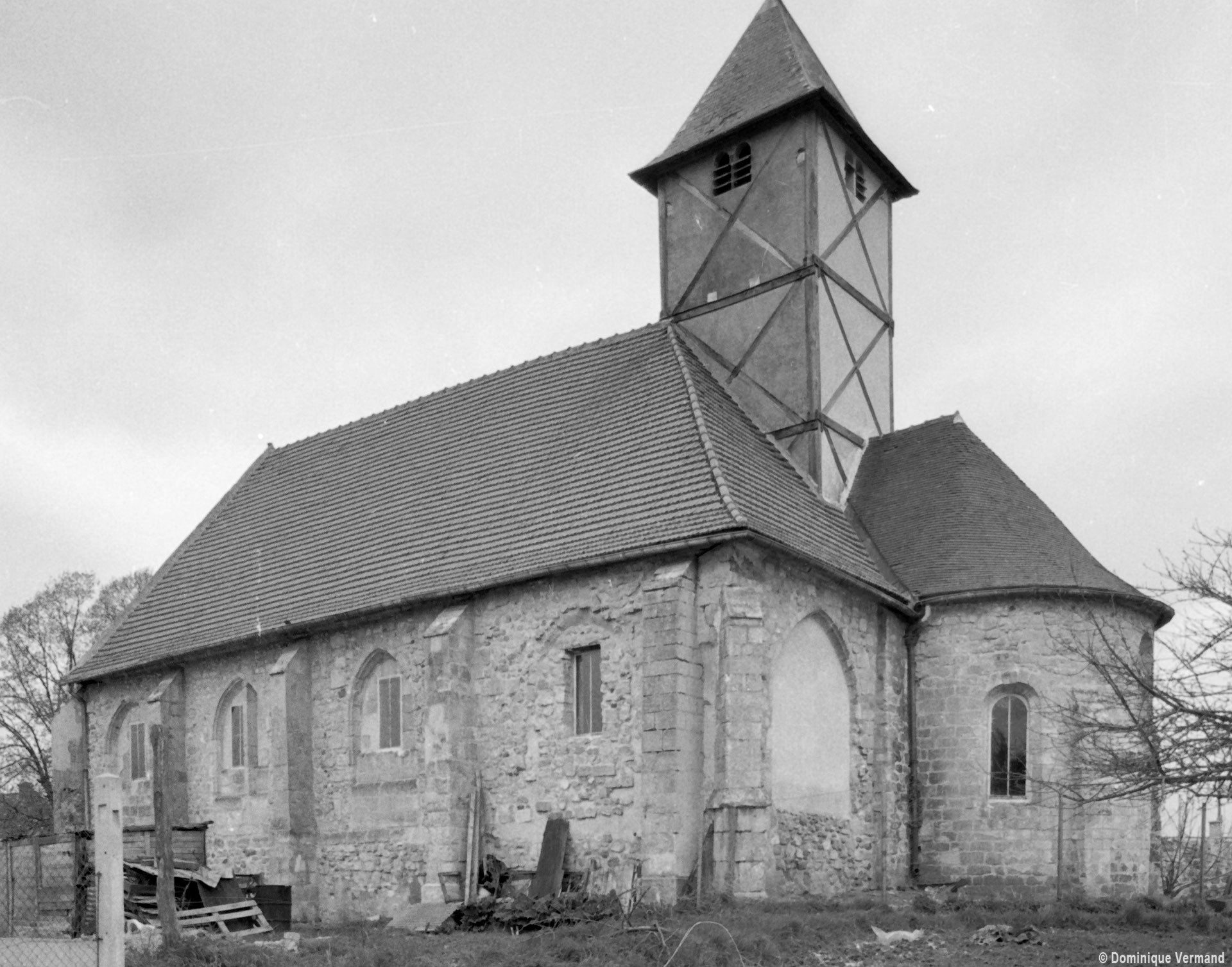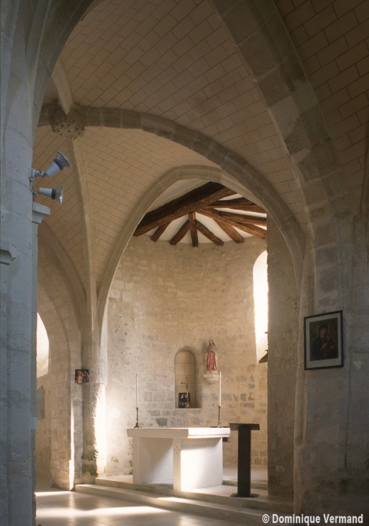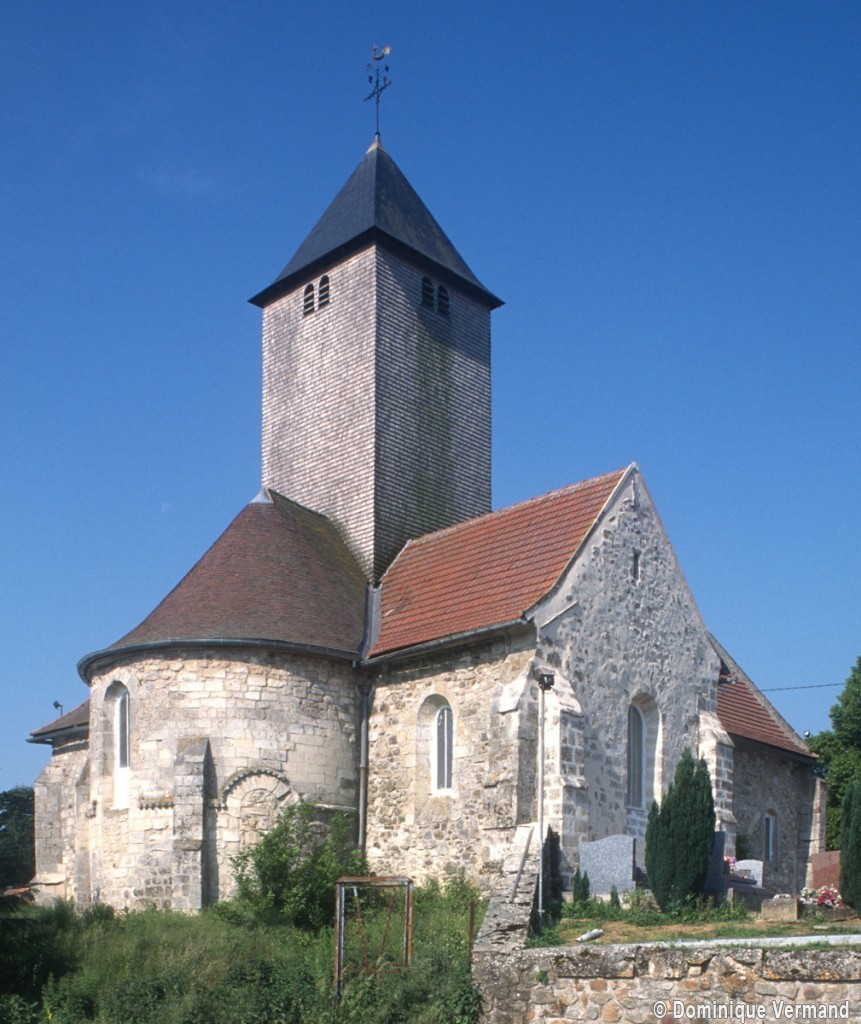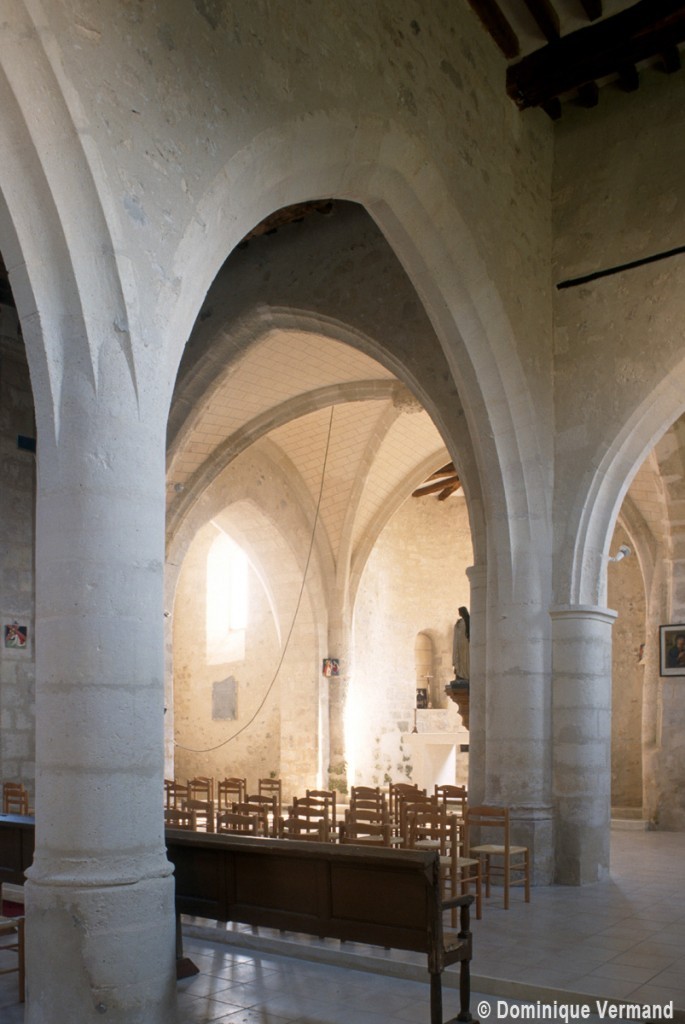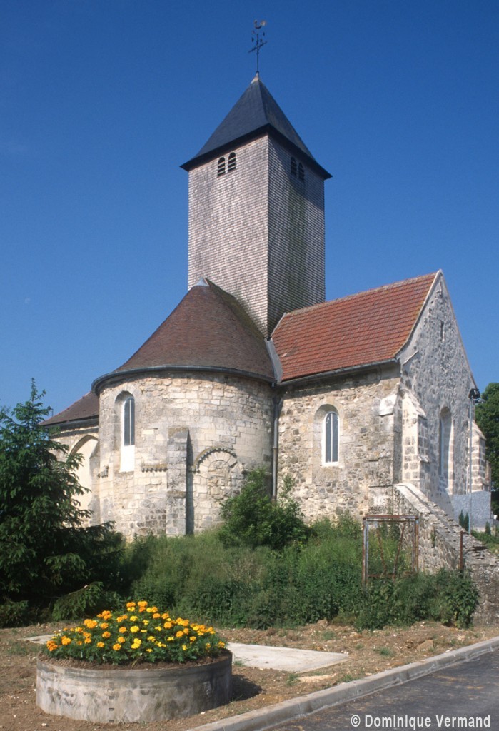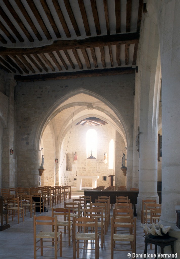 C’est un édifice maintes fois remanié, dont la partie la plus ancienne est l’abside en hémicycle qu’une fenêtre avec décor de billettes et deux contreforts plats permettent de dater de la fin du 11ème siècle. Un cul-de-four aujourd’hui disparu la couvrait selon toute vraisemblance à l’origine. Une simple nef sans bas-côtés lui était certainement associée mais des travaux importants intervinrent peu après le milieu du 12ème siècle avec la construction d’un petit transept et d’une nouvelle nef de trois travées avec bas-côtés. Il en reste le croisillon nord ainsi que le mur gouttereau attenant, avec ses trois arcades brisées, aujourd’hui bouchées par suite de la démolition du bas-côté. C’est à la même époque que l’abside fut surélevée et que deux de ses trois fenêtres primitives furent allongées.