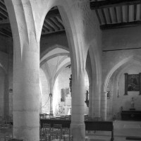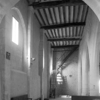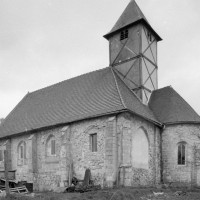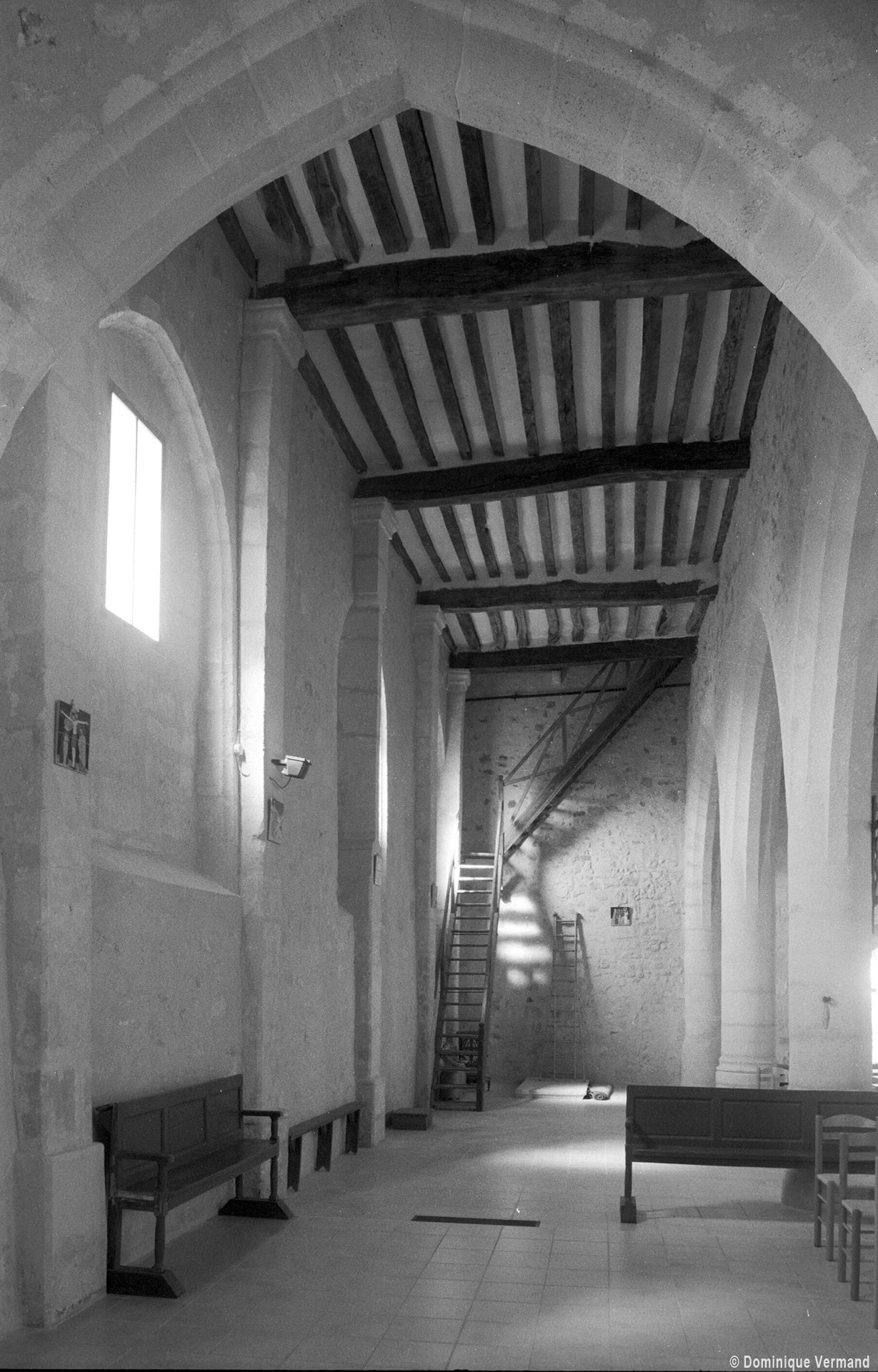 Comme pour beaucoup d’autres édifices de la région, d’importants travaux, sans doute consécutifs à l’époque troublée que l’on venait de traverser, affectèrent l’église au 16ème siècle avec la reprise de la croisée et la reconstruction totale des parties sud : croisillon, mur gouttereau et bas-côté de la nef. C’est au 17ème siècle qu’il appartenait de conclure cette longue suite de travaux avec la pose d’un plafond à solives apparentes – très bien remis en valeur par les restaurations achevées en 1997 – sur la nef et le bas-côté sud. Pour le soutenir, des pilastres furent lancés sur le mur gouttereau nord de la nef – condamnant ainsi les arcades du 12ème siècle – et sur celui du bas-côté sud, obstruant les fenêtres du 16ème siècle. C’est à cette campagne qu’il faut aussi attribuer la façade de l’église et le petit clocher couvert d’ardoises (1997).