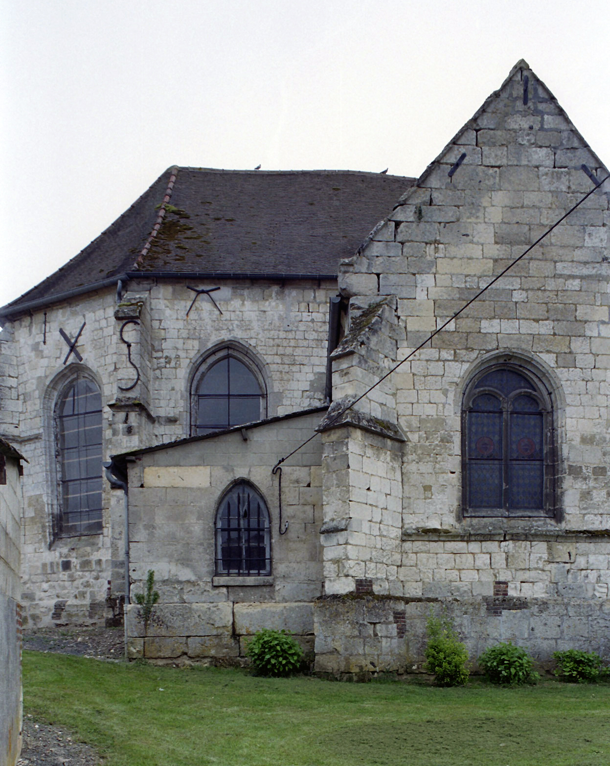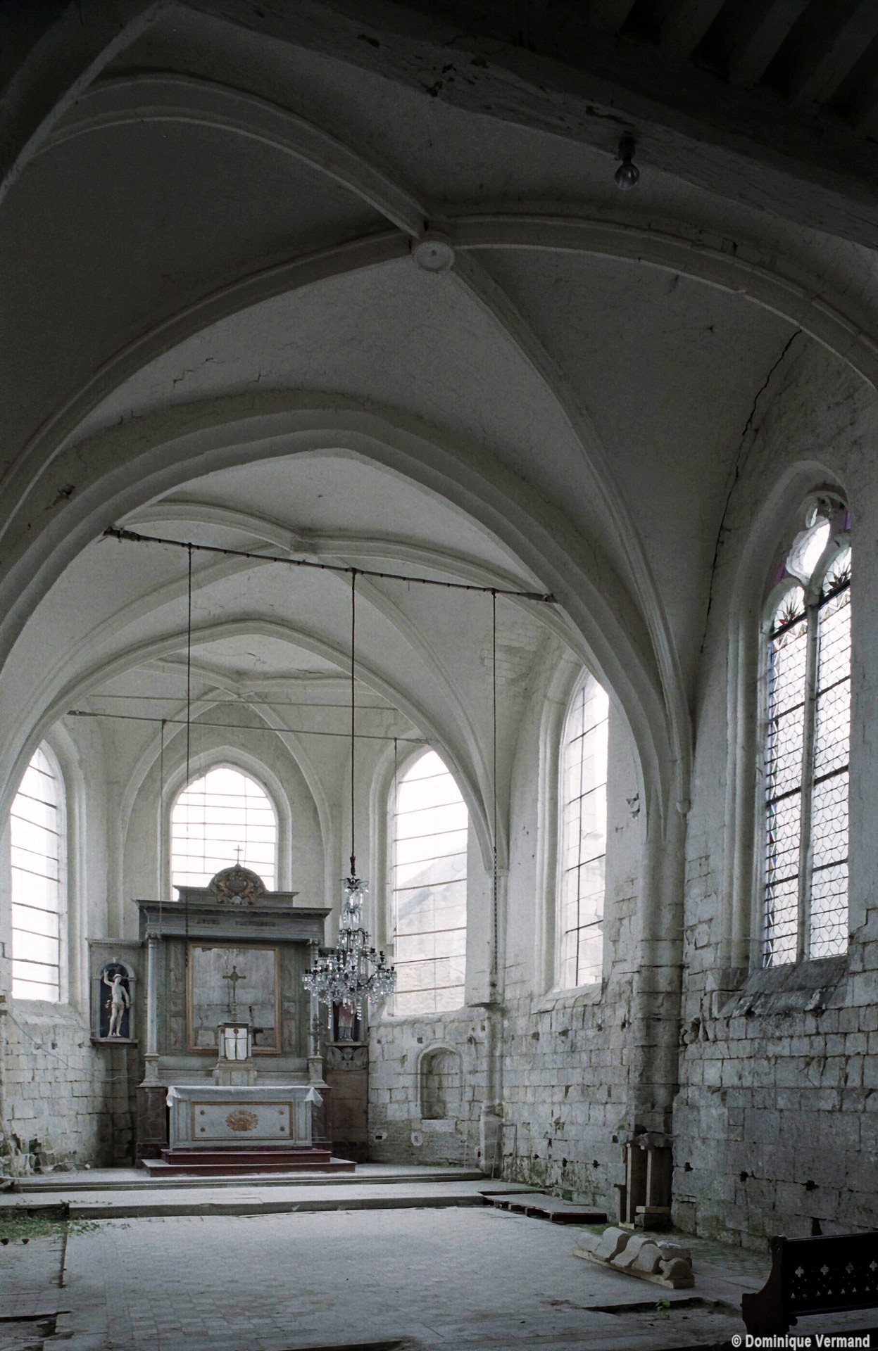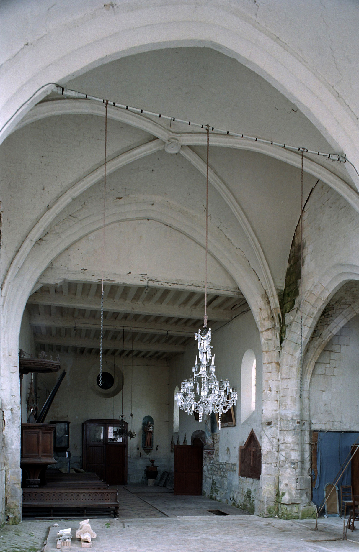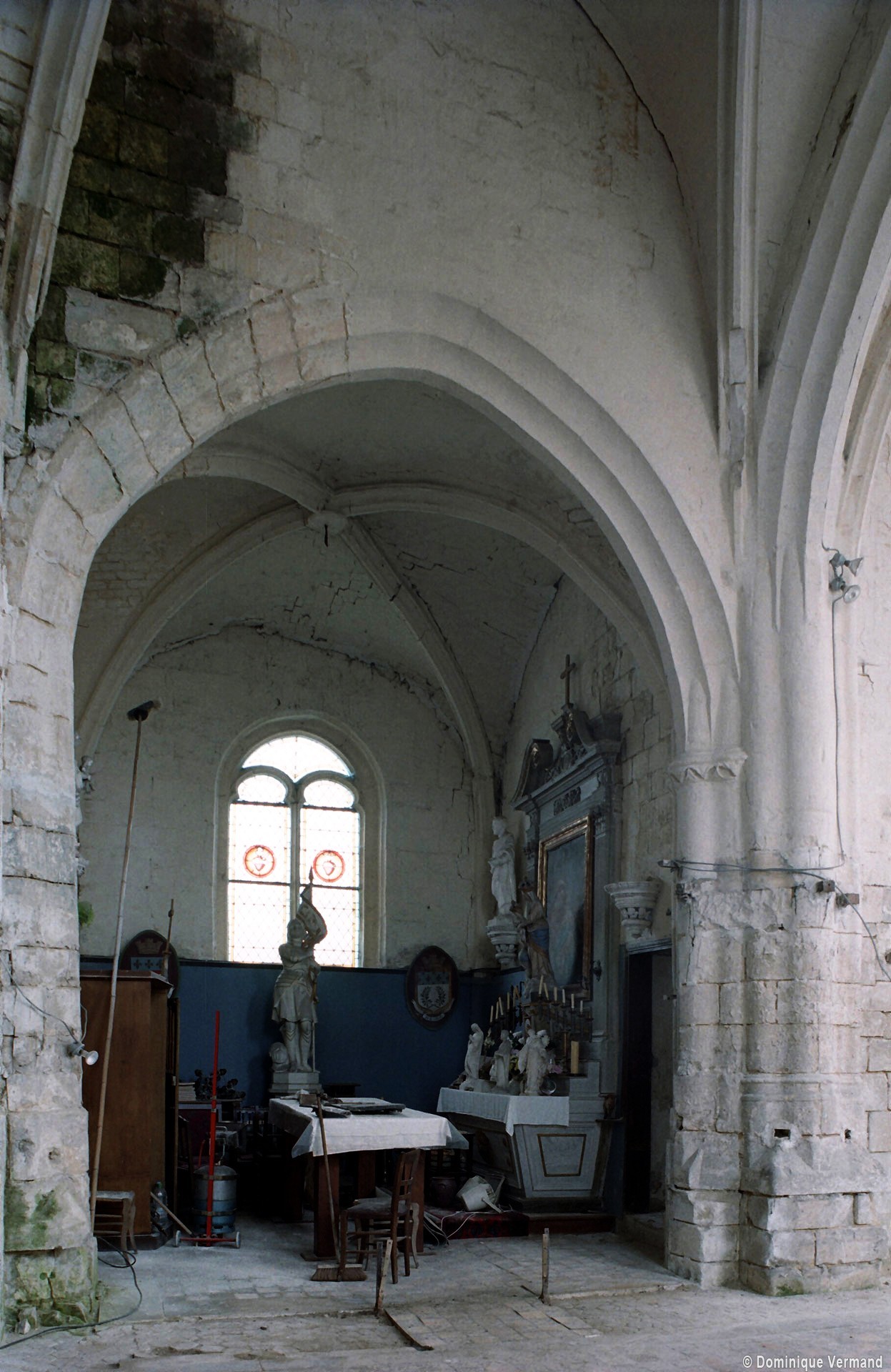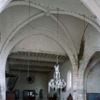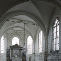 Les nervures des voûtes adoptent un profil prismatique et retombent sur des colonnettes engagées au tracé ondulé, éléments caractéristiques du gothique tardif. Au sud, un curieux dispositif de contrebutement évoquant des arcs-boutants montre que les voûtes ont très vite connu des problèmes de stabilité. Trois remarquables verrières du premier quart du 16ème siècle consacrées à la Vierge des litanies, au Calvaire et à la Dormition de la Vierge attendent leur réinstallation dans l’abside (2008).