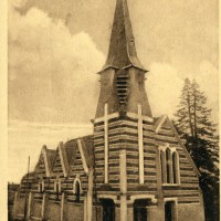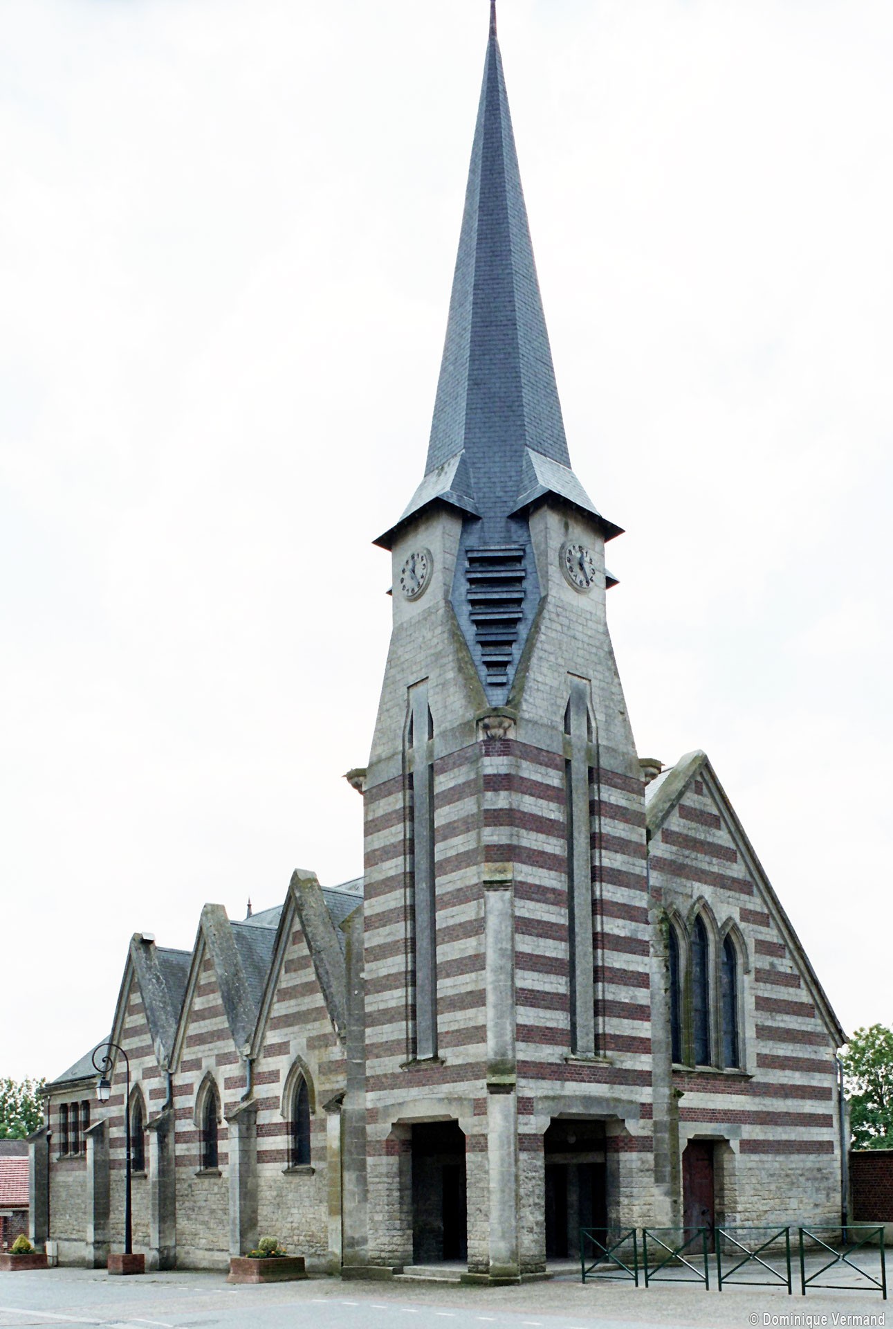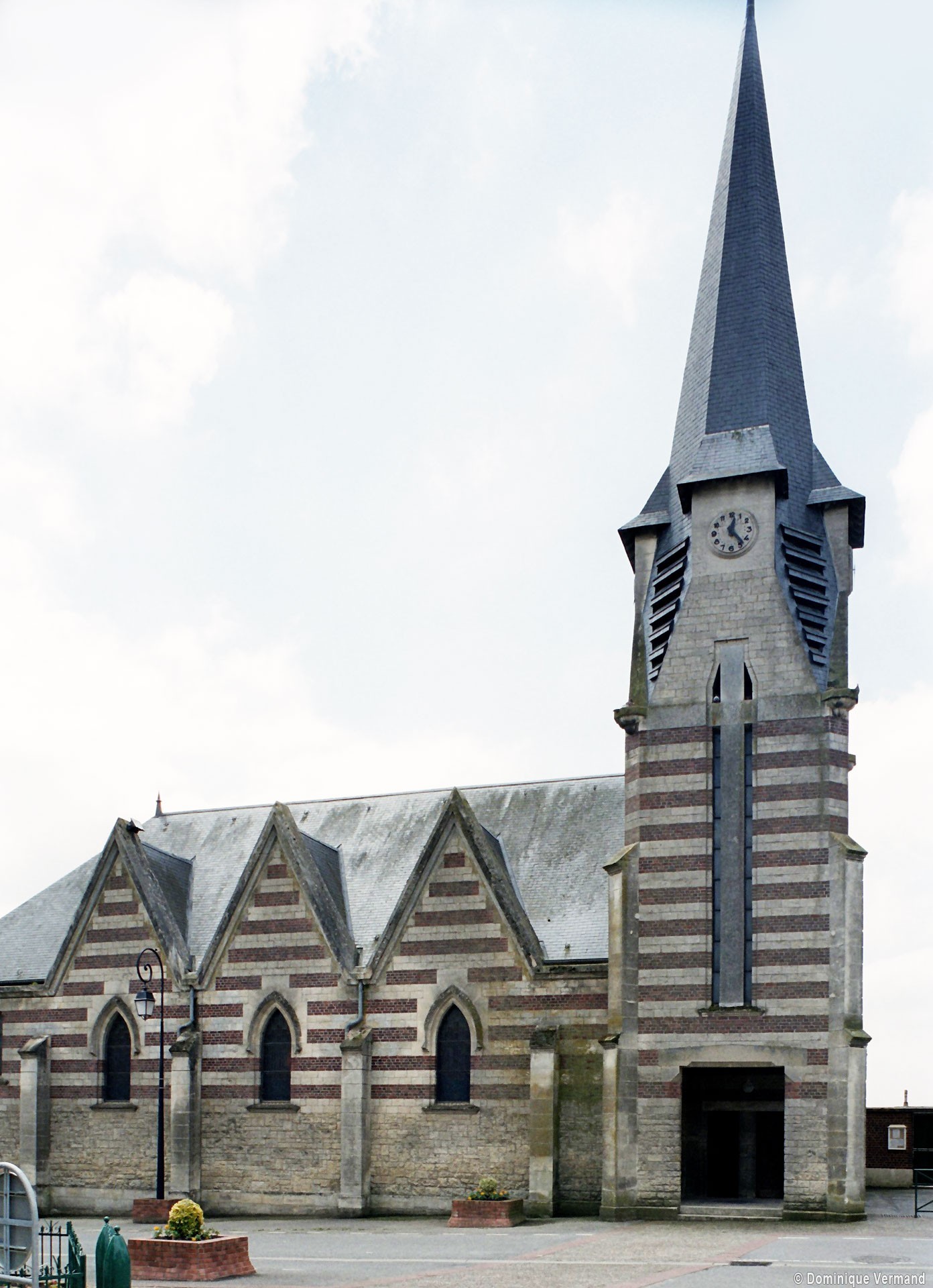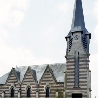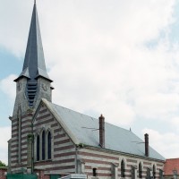Reprenant le plan rectangulaire de la construction précédente, l’église est bâtie en assises alternées de briques et de pierre et vaut surtout pour son haut clocher art déco formant porche. Carrée au départ, la tour passe progressivement au plan octogonal en alternant, au niveau du beffroi, des pans en pierre et en ardoises, ces derniers se continuant directement dans la flèche. Au nord, les trois travées de la nef sont marquées par des pignons indépendants. L’intérieur n’a pas de caractère particulier, mais on y remarque le spectaculaire baldaquin sauvé de la précédente église (2008).