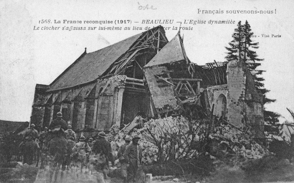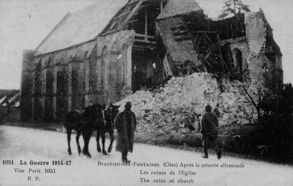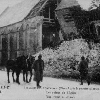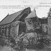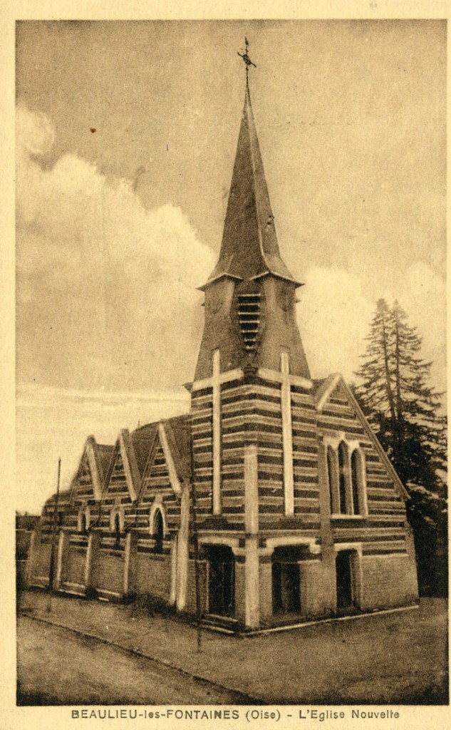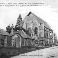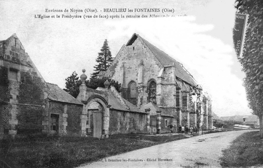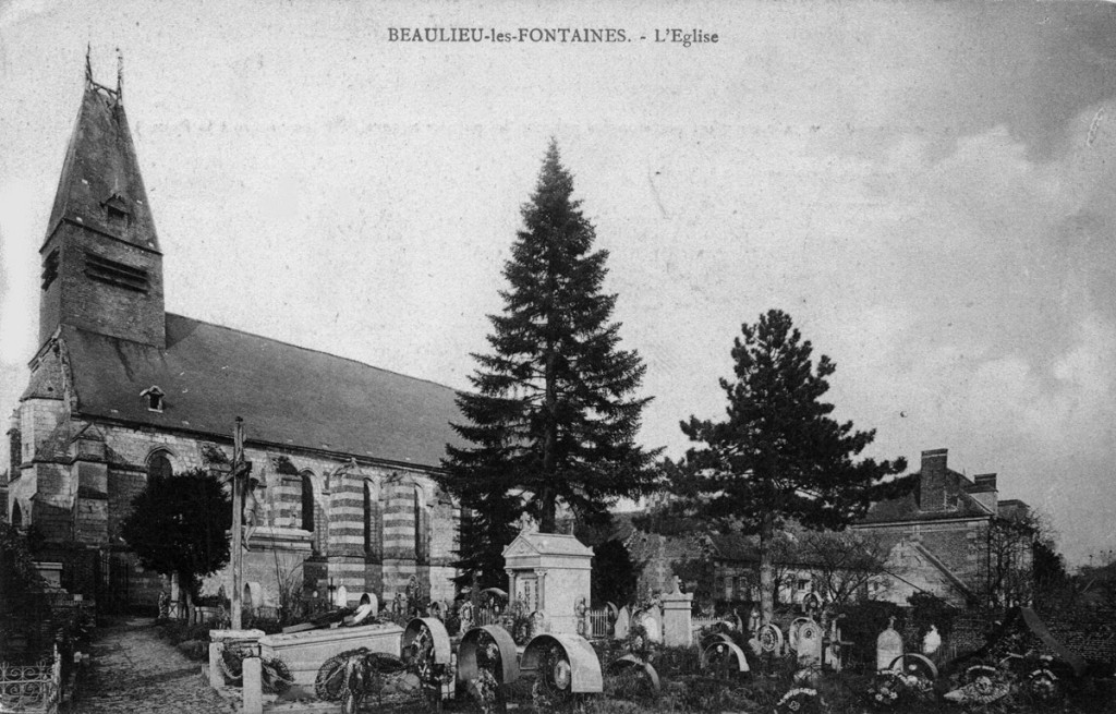 Bourg autrefois important défendu par un puissant château fort, Beaulieu-les-Fontaines a souvent payé un lourd tribut aux nombreux conflits qui, depuis le moyen âge, ont jalonné l’histoire de la région. L’église, dont le clocher fut dynamité par les Allemands en mars 1917, n’a pas fait exception. Il est regrettable que les parties subsistantes, qui étaient de qualité et dataient de la fin du 12ème siècle, aient été détruites pour faire place à l’édifice actuel, réalisé en 1928-29 sur les plans de l’architecte compiégnois Jean Stra.