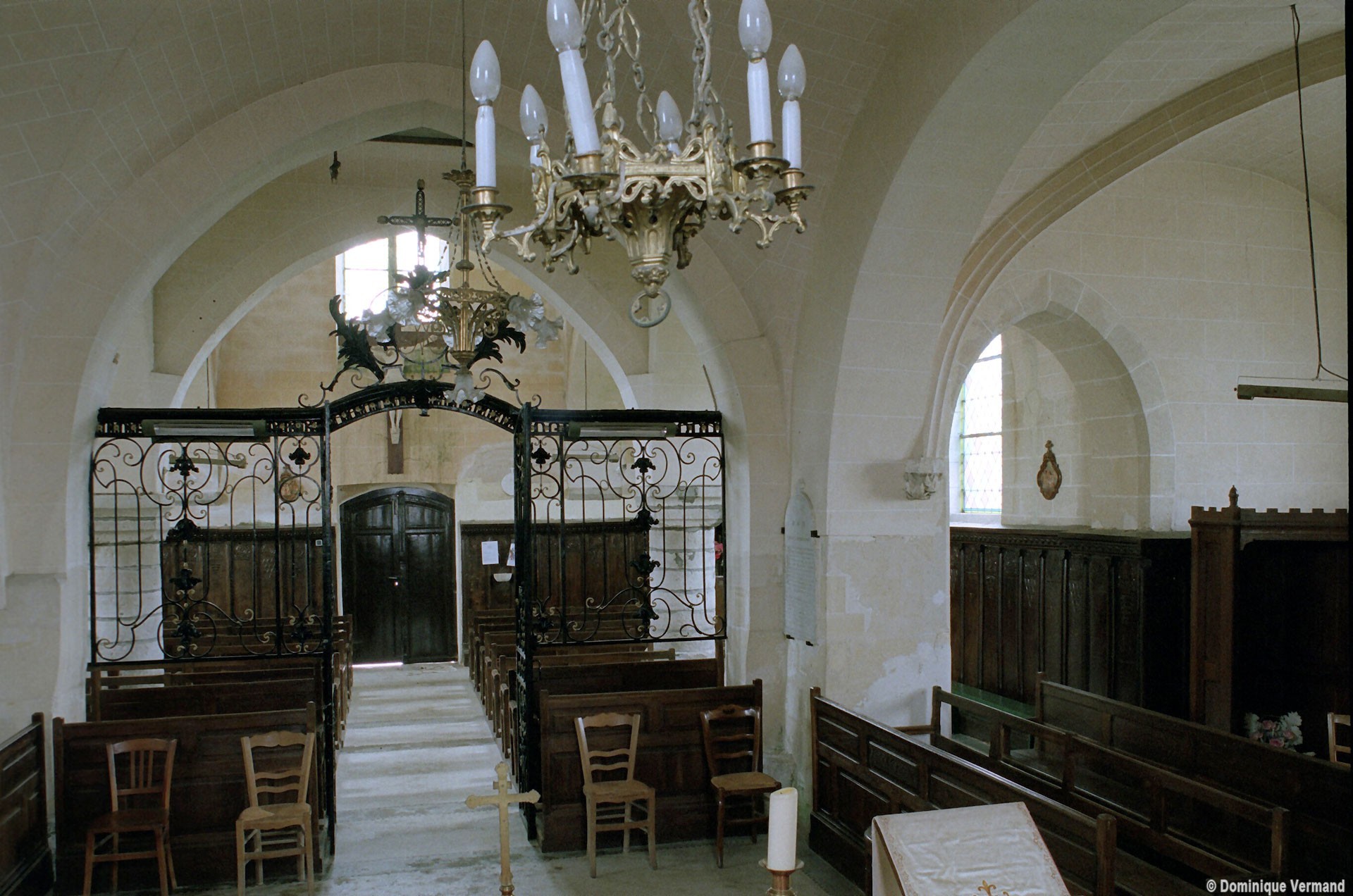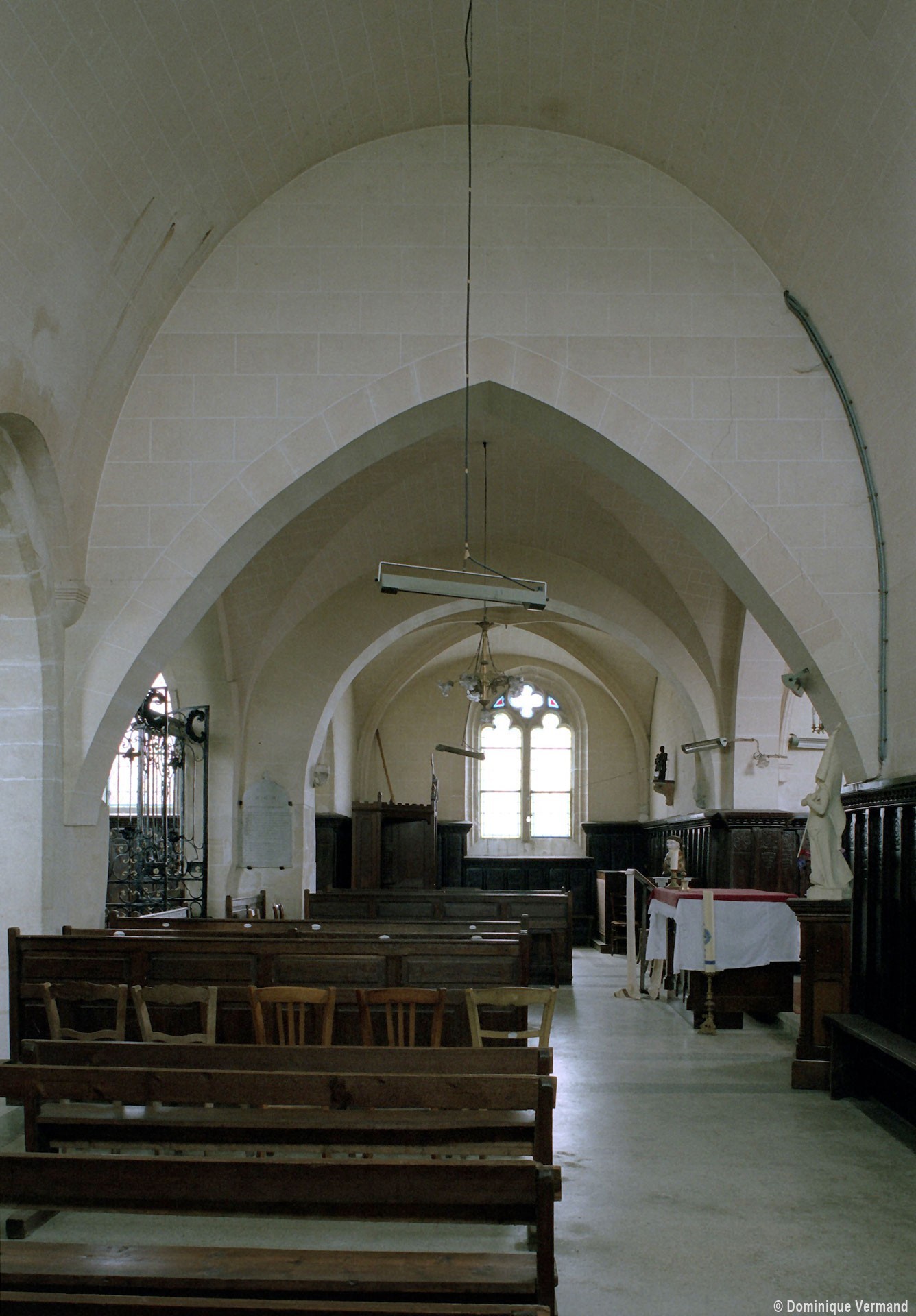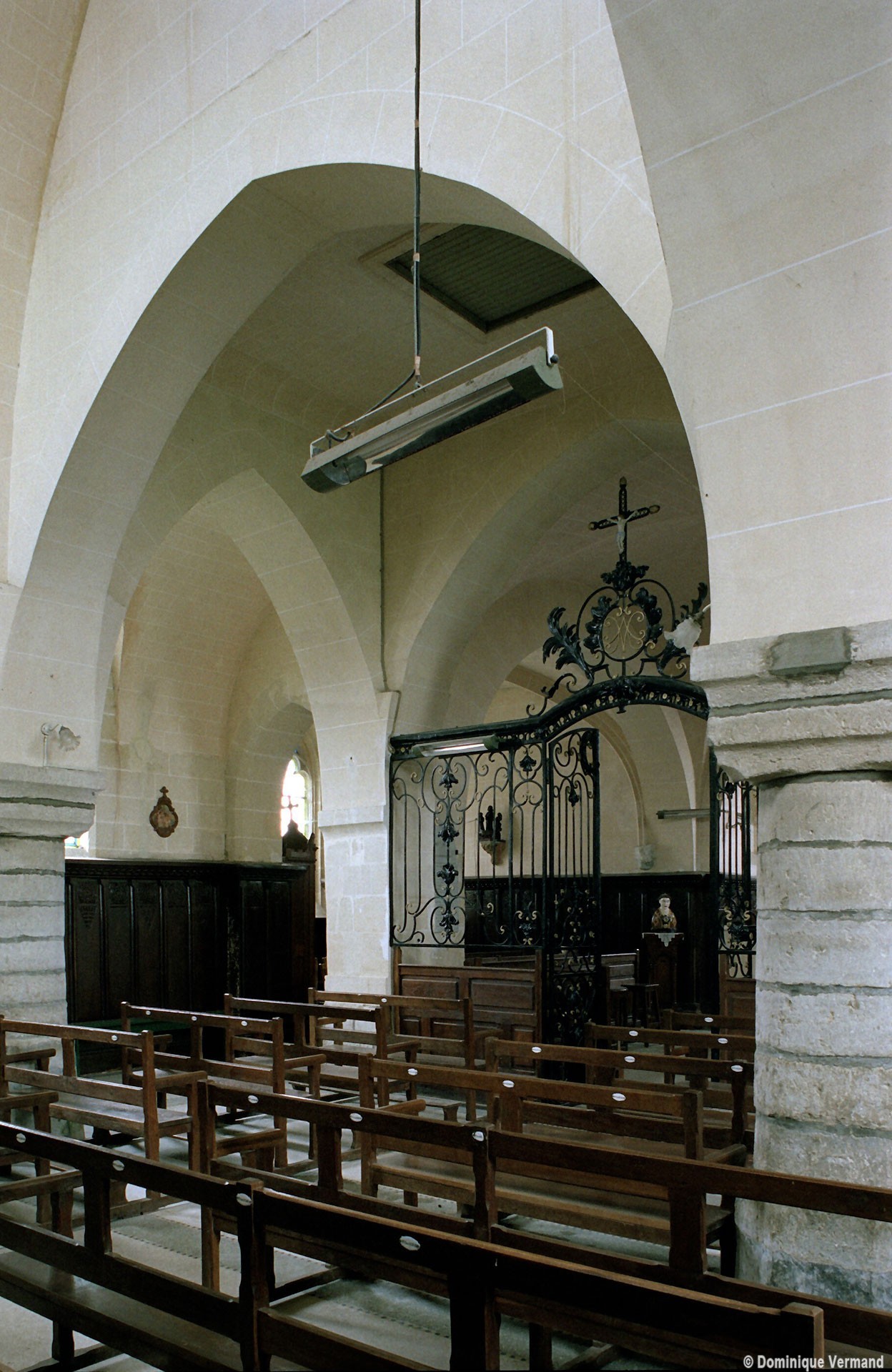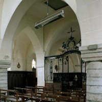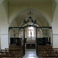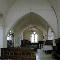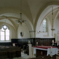 A l’intérieur, les deux piles circulaires recevant les arcades de la nef supportent également un arc diaphragme dont il est difficile de se prononcer sur l’ancienneté. Le croisillon nord est couvert d’une voûte d’ogives et, à l’extérieur, comporte une tourelle d’escalier à l’angle nord-ouest. Le choeur, dépourvu de contreforts et éclairé par des fenêtres en plein cintre, a probablement été reconstruit au 17ème siècle sur les fondations de celui du siècle précédent. Sa voûte est moderne.