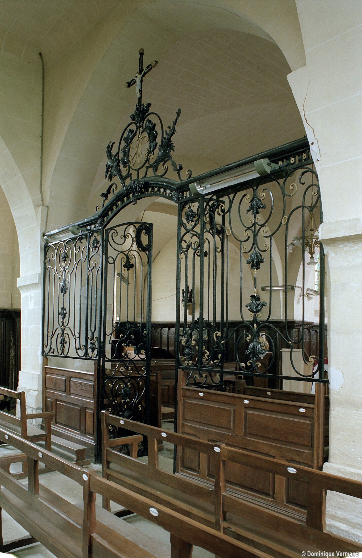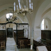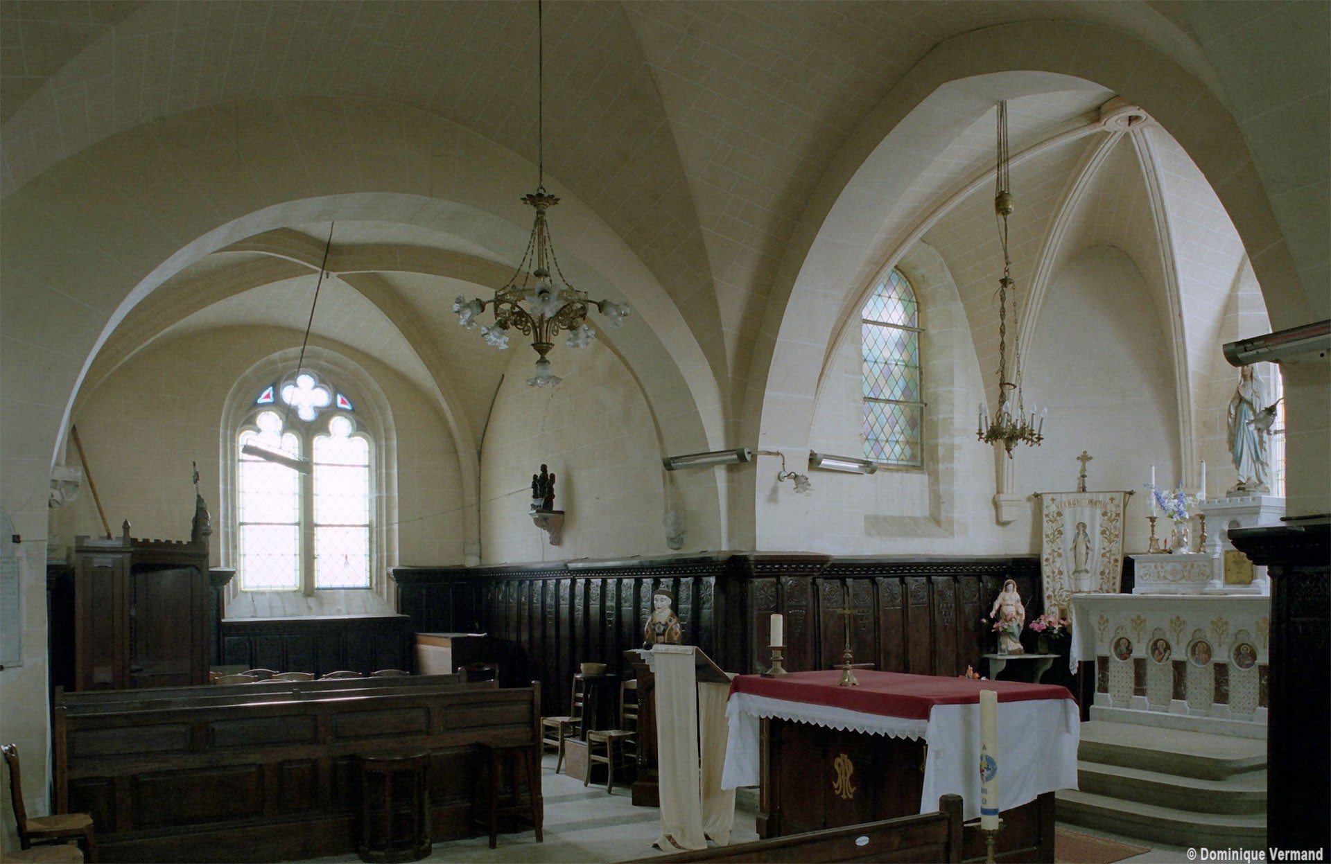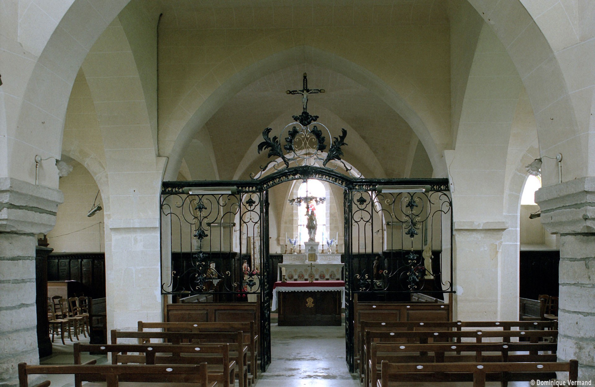 A l’intérieur, les deux piles circulaires recevant les arcades de la nef supportent également un arc diaphragme dont il est difficile de se prononcer sur l’ancienneté. Le croisillon nord est couvert d’une voûte d’ogives et, à l’extérieur, comporte une tourelle d’escalier à l’angle nord-ouest. Le choeur, dépourvu de contreforts et éclairé par des fenêtres en plein cintre, a probablement été reconstruit au 17ème siècle sur les fondations de celui du siècle précédent. Sa voûte est moderne.