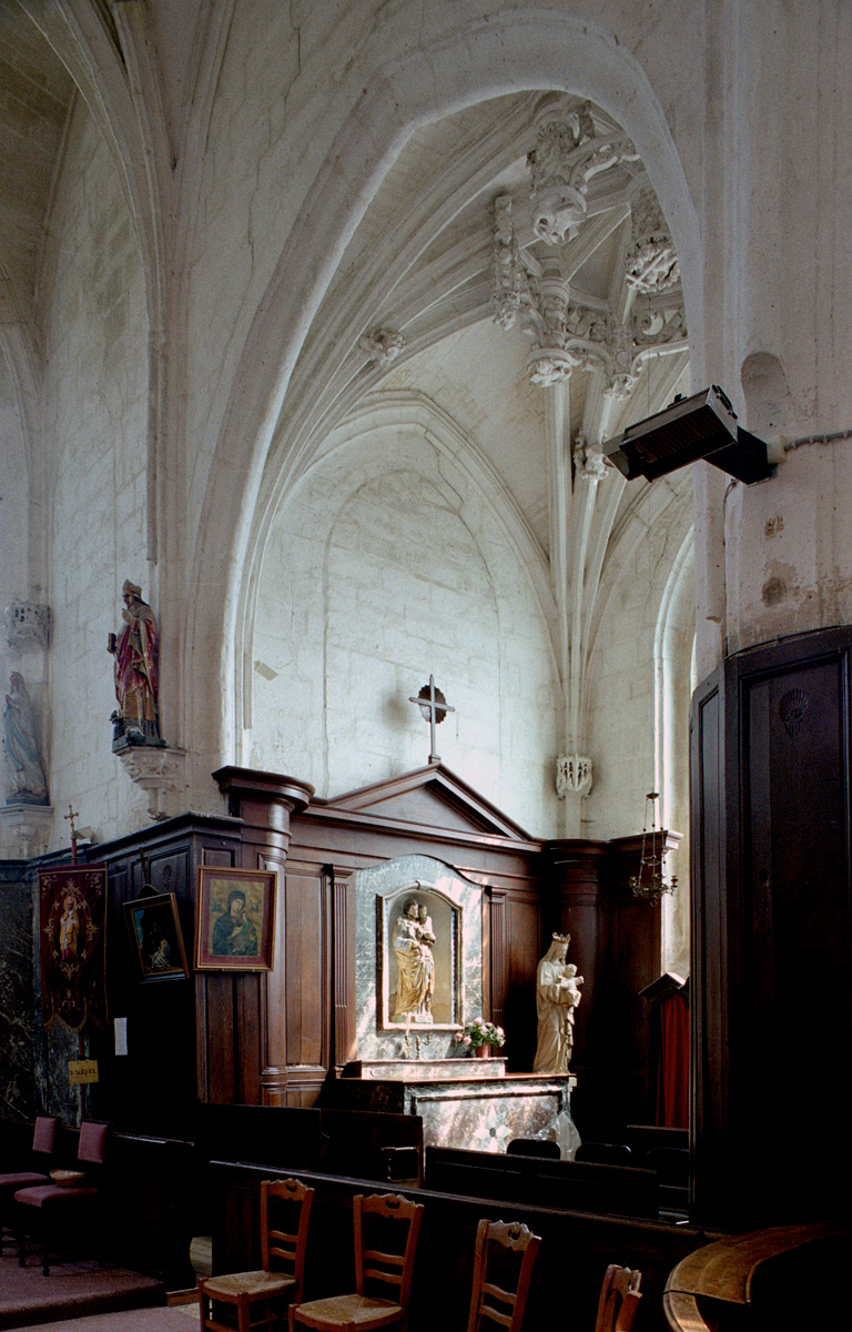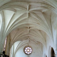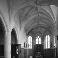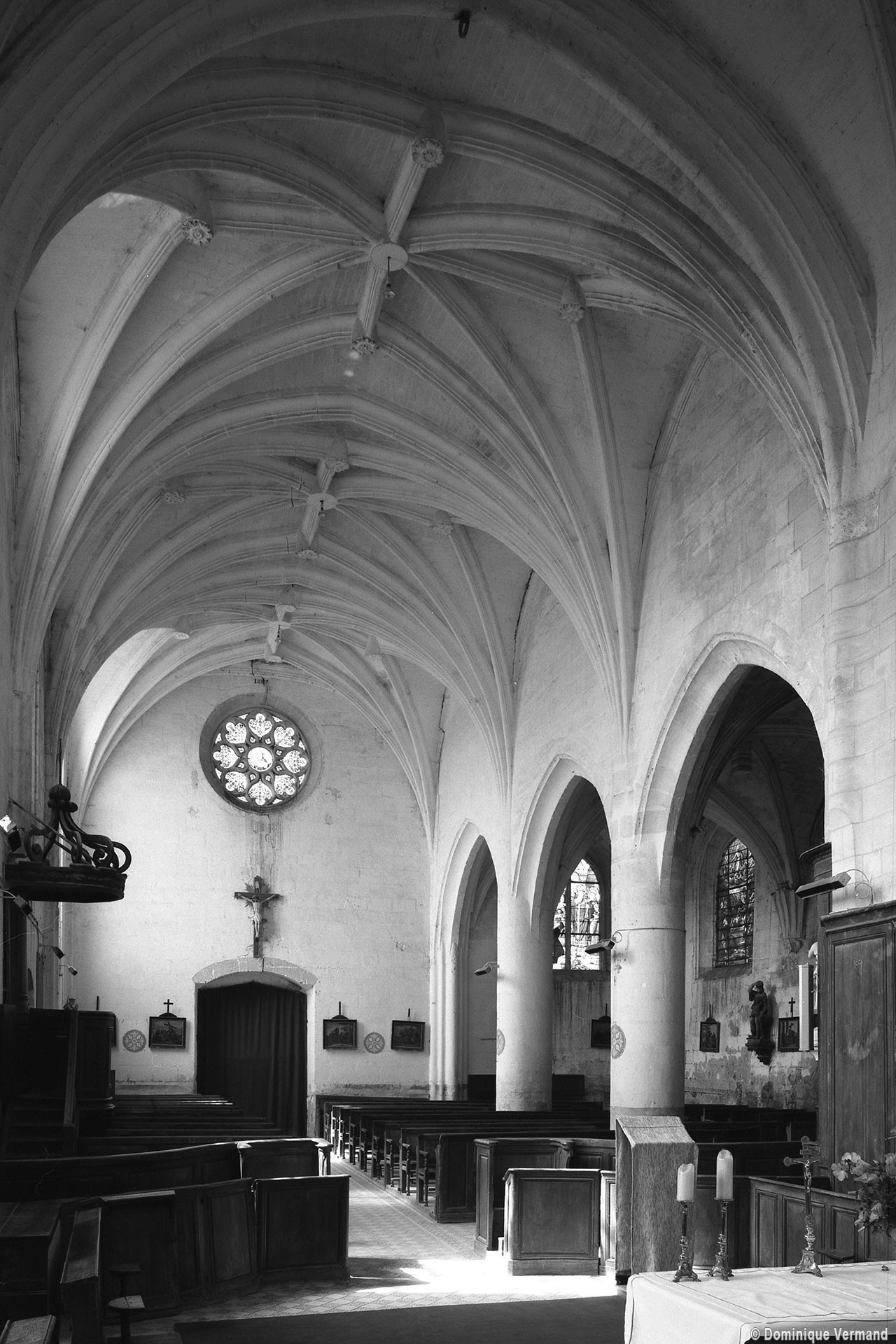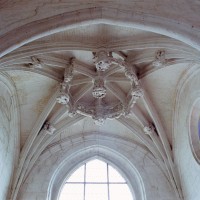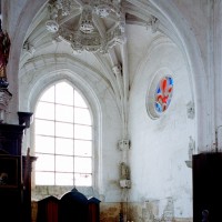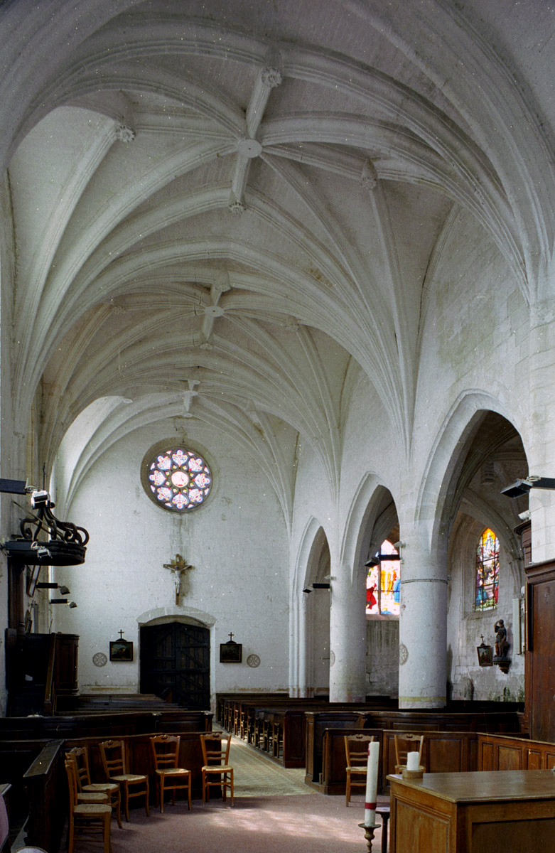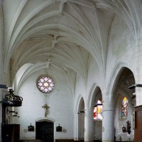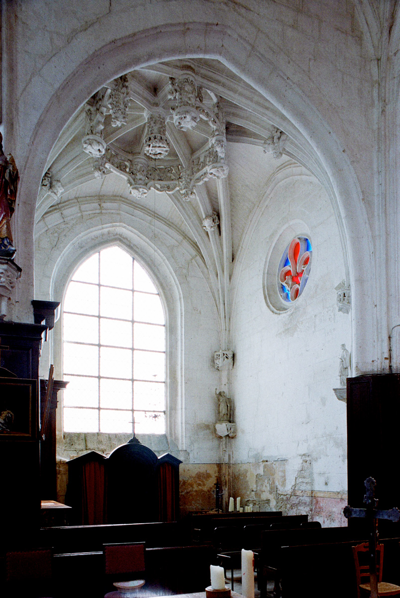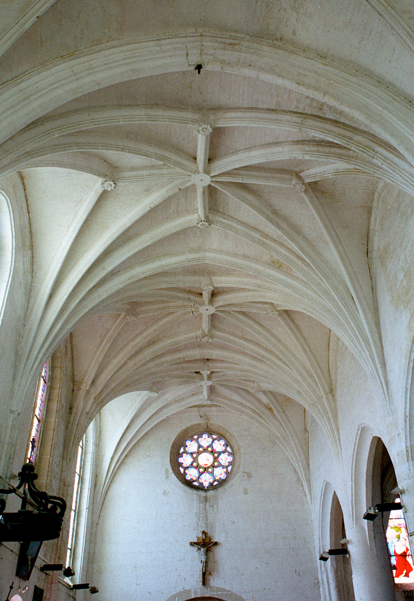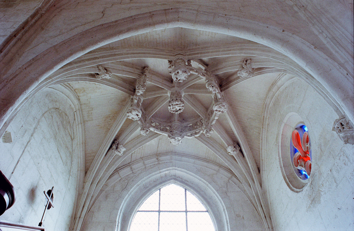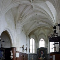La nef est couverte de voûtes avec liernes et tiercerons tandis que le bas-côté et la travée droite du chœur reçoivent de simples voûtes quadripartites. Mais l’élément le plus remarquable est sans conteste l’exceptionnelle voûte de la chapelle seigneuriale, dont le réseau en forme d’étoile comporte de nombreuses clefs pendantes très ouvragées, reliées entre elles pour former une couronne.
