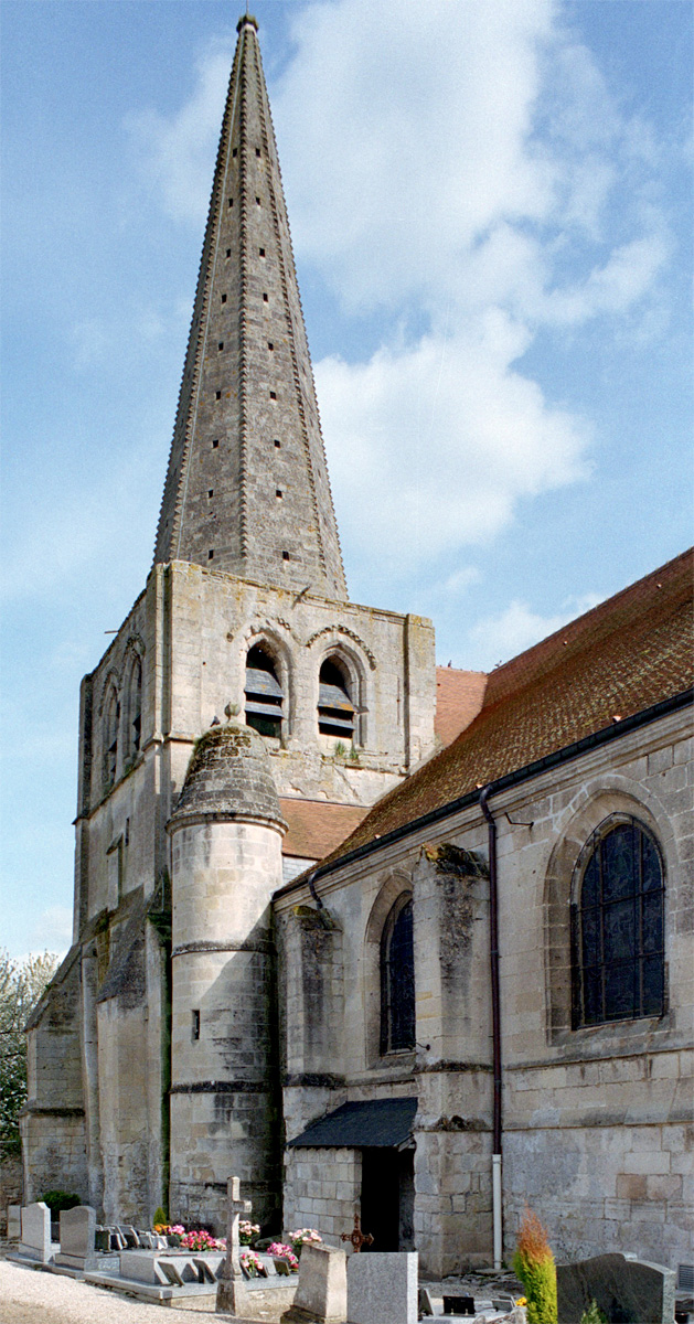A la fin du 12ème siècle, ce chœur est considérablement renforcé pour recevoir le clocher actuel, remarquable par sa flèche octogonale en pierre dont les arêtes sont décorées d’étoiles. Contrairement à un usage pourtant très répandu, il ne comporte pas de petites pyramides d’angle.