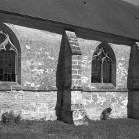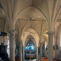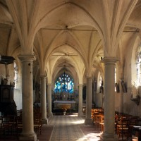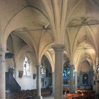 Les éléments porteurs des voûtes (ogives et doubleaux) ont la même importance et adoptent un profil prismatique identique, renforçant ainsi l’unité spatiale intérieure. Ils sont reçus sur des chapiteaux doriques qui portent la marque de la Renaissance tandis que les fenêtres adoptent encore le réseau flamboyant du gothique tardif, preuve que le passage d’un style à l’autre s’est fait sans rupture et souvent sur une longue période. Plus large que les autres et découpée par un réseau au riche dessin, la fenêtre du chevet est encadrée par deux consoles décorées d’angelots. En façade, un petit porche abrite un portail orné de coquilles que surmonte une belle Piéta en pierre.