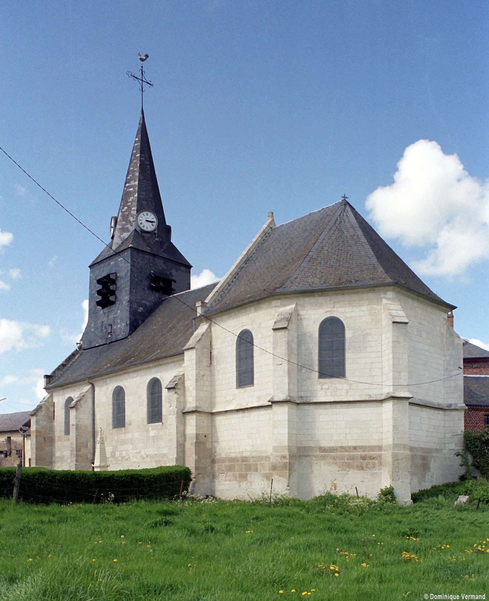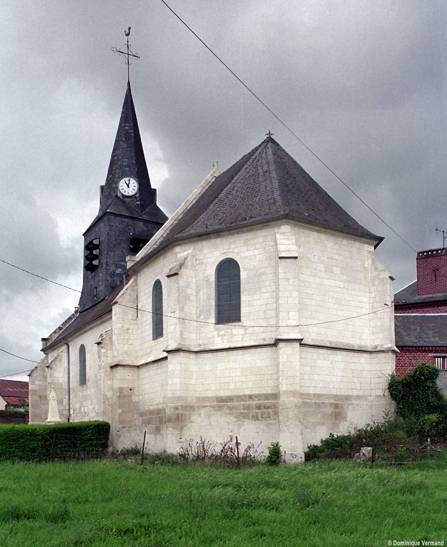 Bâtie dans une pierre crayeuse d’excellente qualité – plusieurs carrières à ciel ouvert sont encore visibles autour du village – l’église Saint-Rémi est un édifice d’apparence homogène composé d’une simple nef, avec clocher en charpente au-dessus de l’entrée, et d’un chœur pentagonal. L’absence d’éléments décoratifs bien caractérisés rend difficile une datation précise. Si le chœur, tant par son allure générale que par certains détails (plan pentagonal, arc triomphal au tracé brisé, contreforts à doubles larmiers) est encore dans la tradition du 16ème siècle, il est plus vraisemblable de l’attribuer au siècle suivant. Comme parfois à cette époque, le pan central de l’abside n’a pas de fenêtre car un autel retable – aujourd’hui disparu – devait s’y appuyer dès l’origine. Le choeur de Saint-Rémi est un excellent exemple du conservatisme architectural, au profit du gothique, qui marquera bien des édifices picards jusqu’à la fin de l’Ancien Régime.