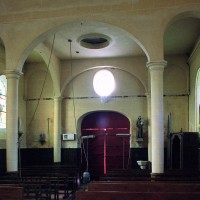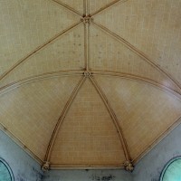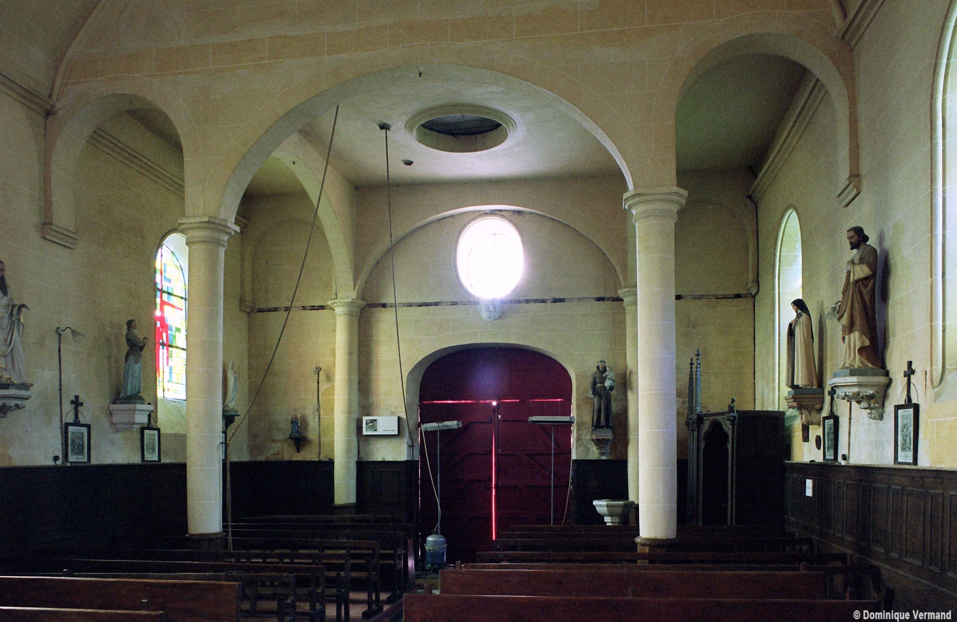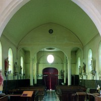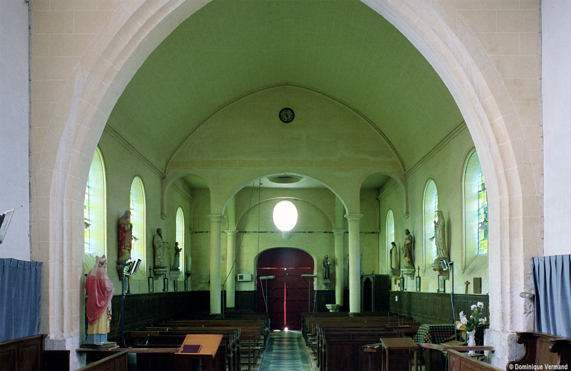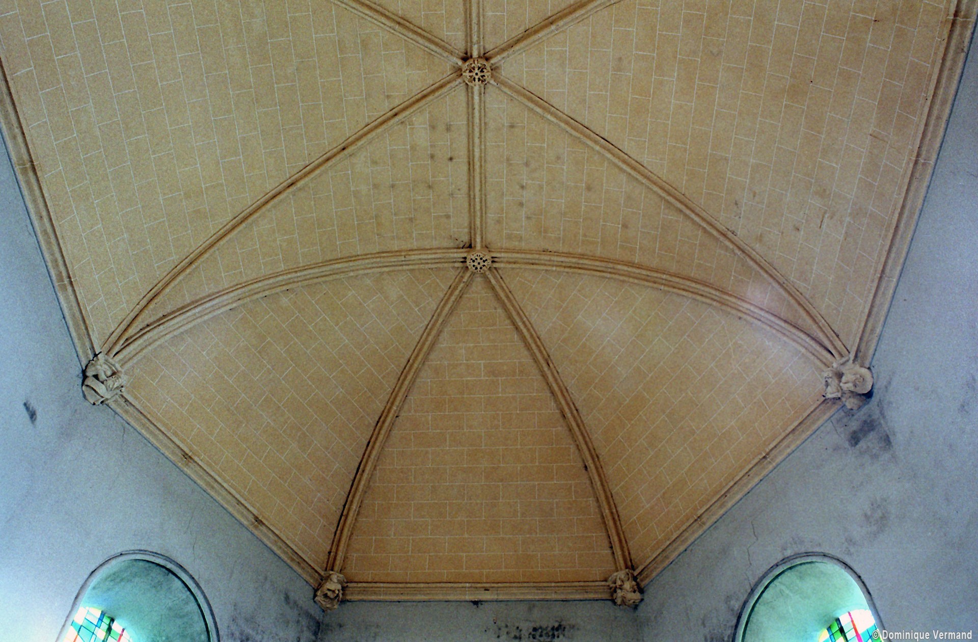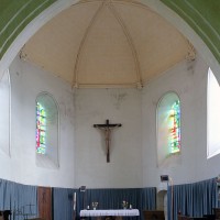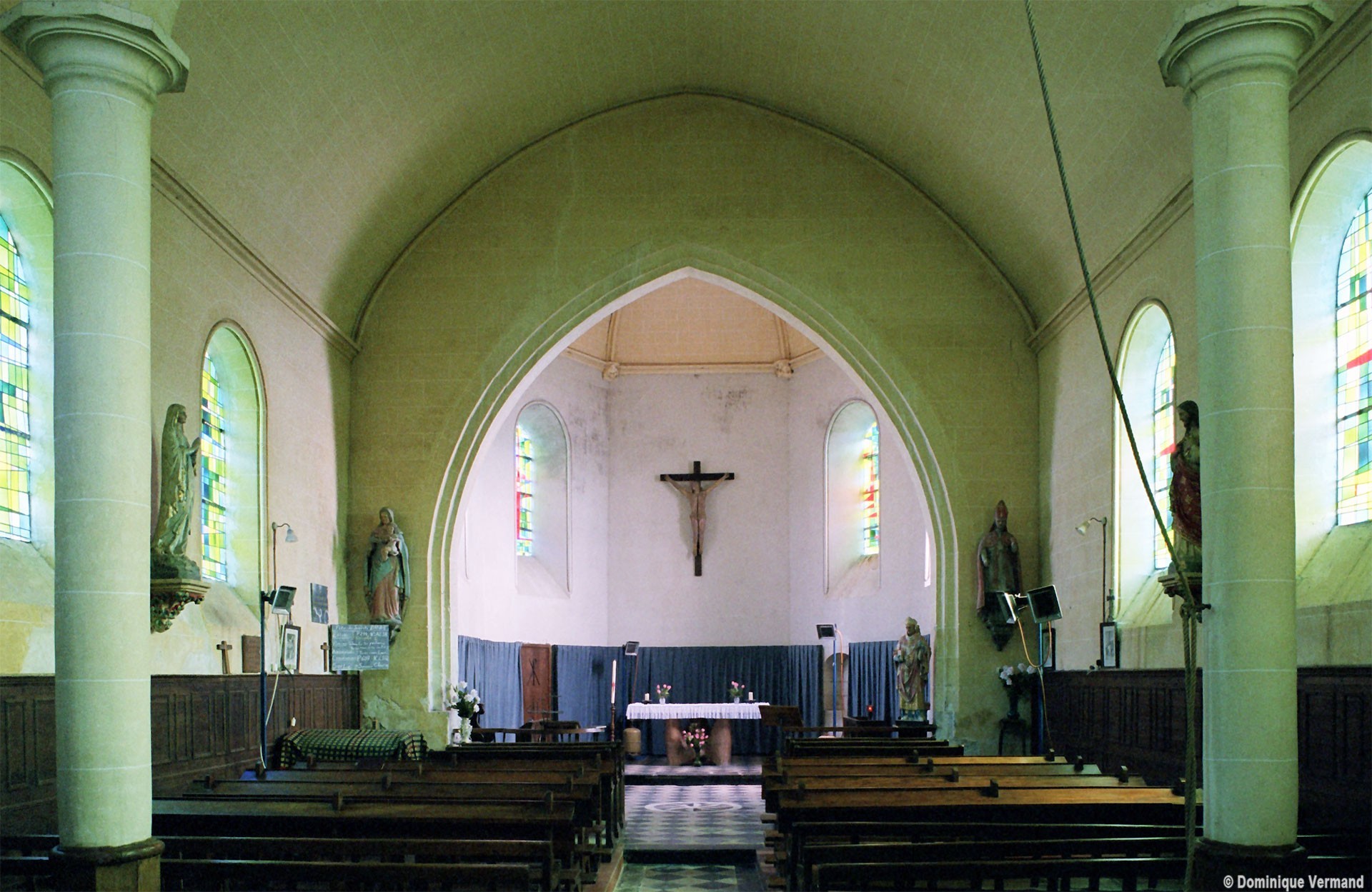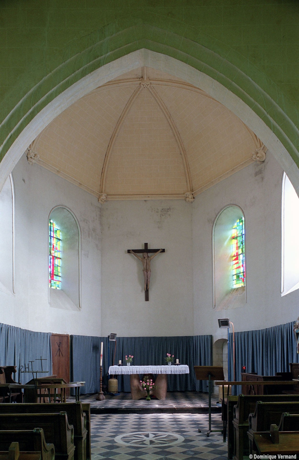 Peut-être légèrement plus tardive – un collage se remarque à la jonction avec le chœur – la nef est cependant dotée des mêmes fenêtres et contreforts que le chœur et comporte dans sa partie antérieure un élégant dispositif d’arcades et de piles supportant le clocher dont le style appartient clairement au 17ème, voir 18ème siècle. Cet ensemble est bien contemporain du reste de la nef car il est épaulé, au nord comme au sud, par deux contreforts absolument identiques aux autres. En revanche, la voûte du chœur ne doit pas tromper car il s’agit d’une réalisation en bois recouvert de plâtre comme il s’en est fait beaucoup au 19ème siècle dans le style de la fin du gothique (2005, révisé 2015).