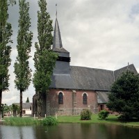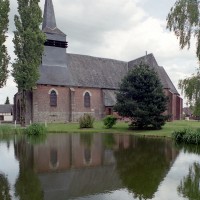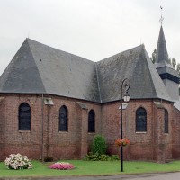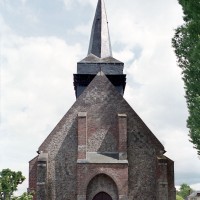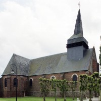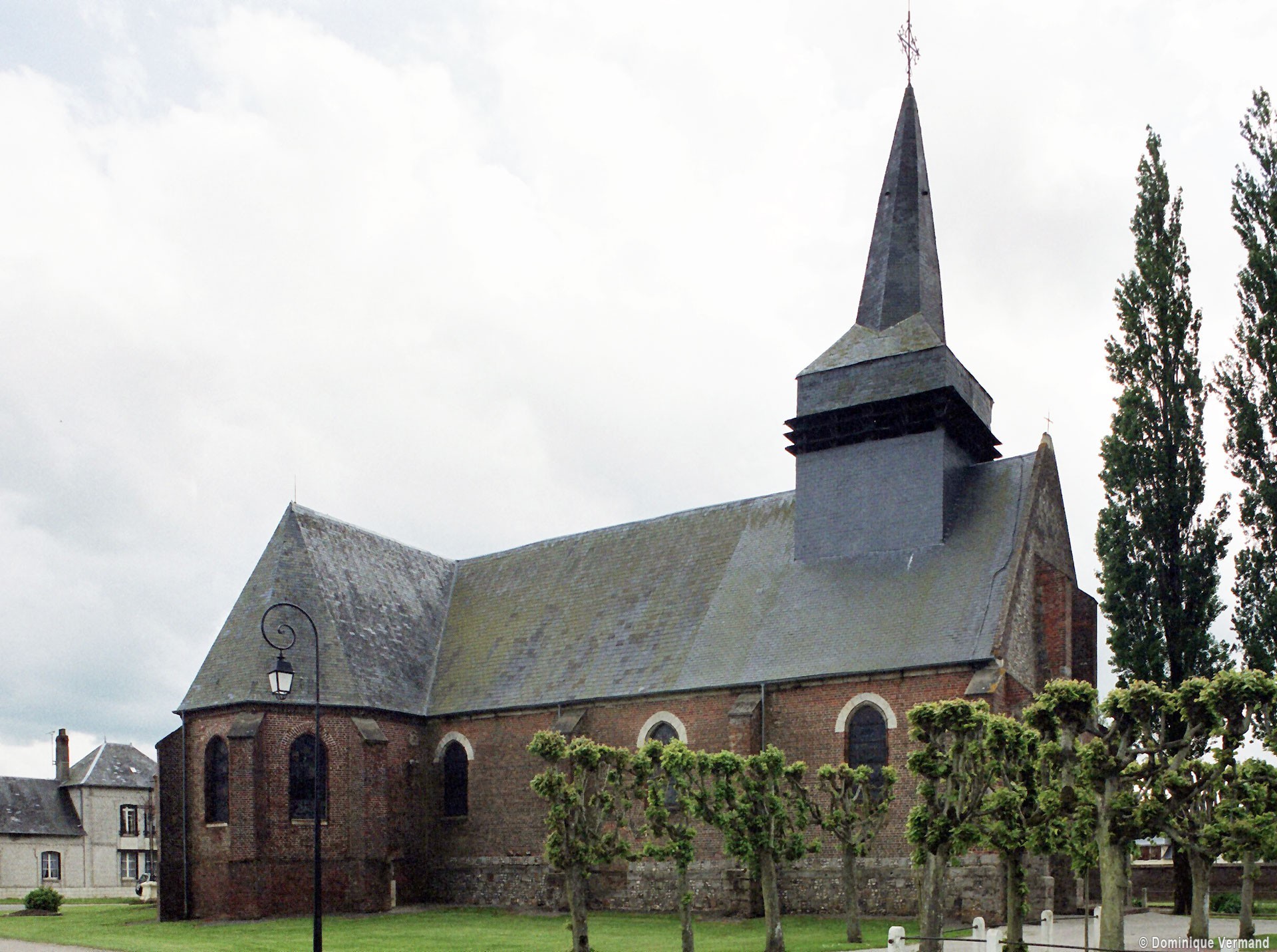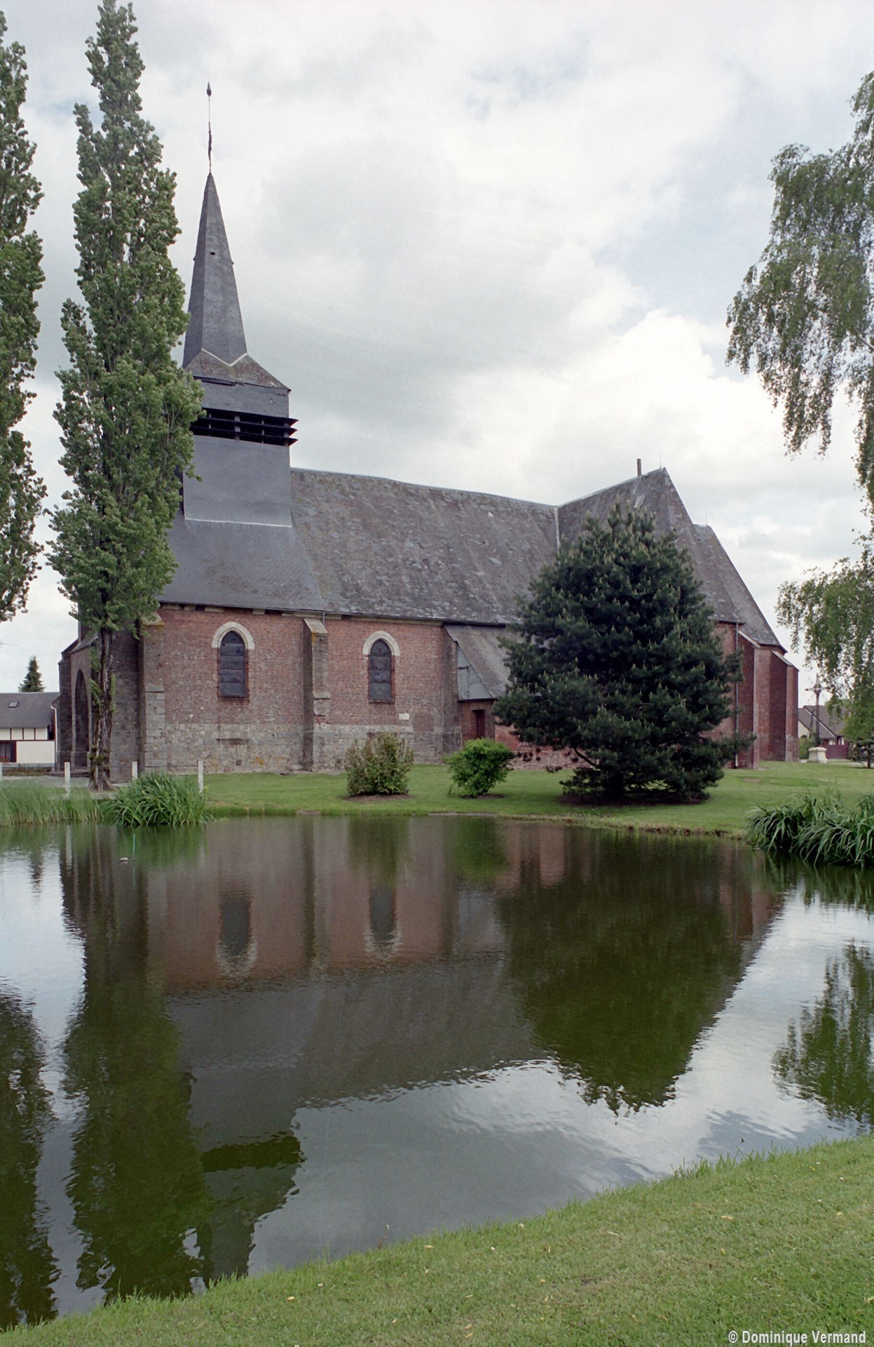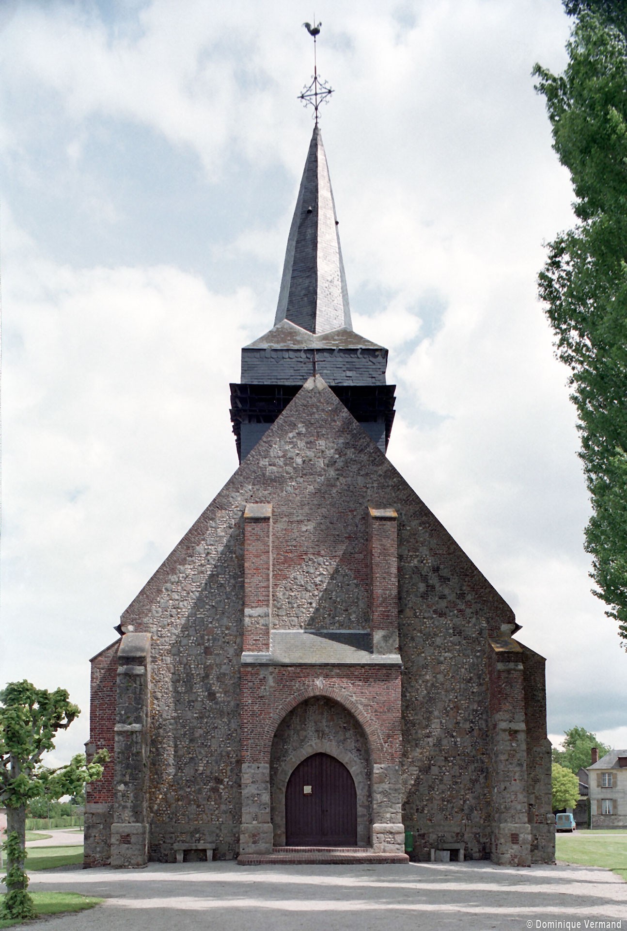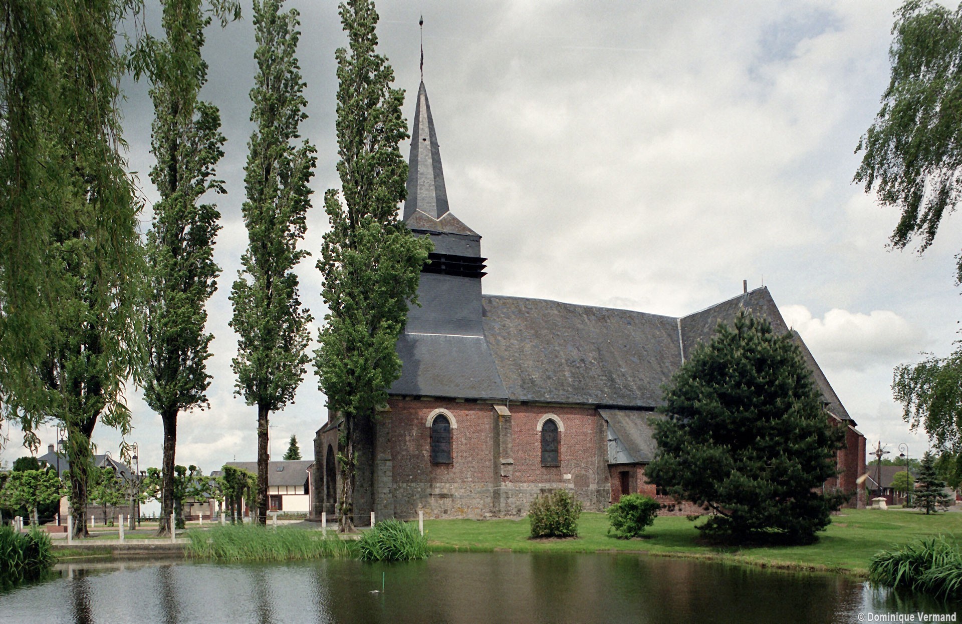 Se reflétant dans la mare toute proche, Saint-Martin est un édifice assez vaste appartenant aux 16ème (nef) et 19ème siècles (transept et choeur). La large nef, construite en briques sur soubassement en damier de silex et briques, est éclairée de chaque côté par trois fenêtres en forme de simples lancettes. La façade, également en damier de silex et briques, est épaulée par quatre contreforts, les deux du centre étant en relation avec le clocher en charpente et ardoises. Ils sont reliés par un arc brisé qui, encadrant le portail, forme comme un porche peu profond donnant, avec des moyens simples, un aspect monumental à l’entrée de l’édifice. C’est une disposition que l’on retrouve à Briot. L’intérieur est couvert par une belle charpente en carène de la même époque avec blochets sculptés.