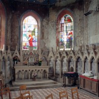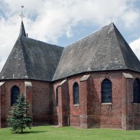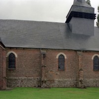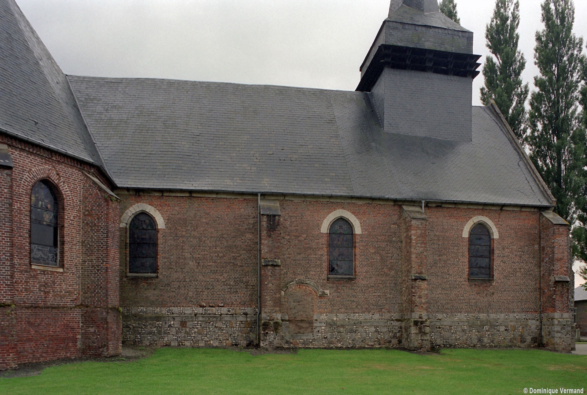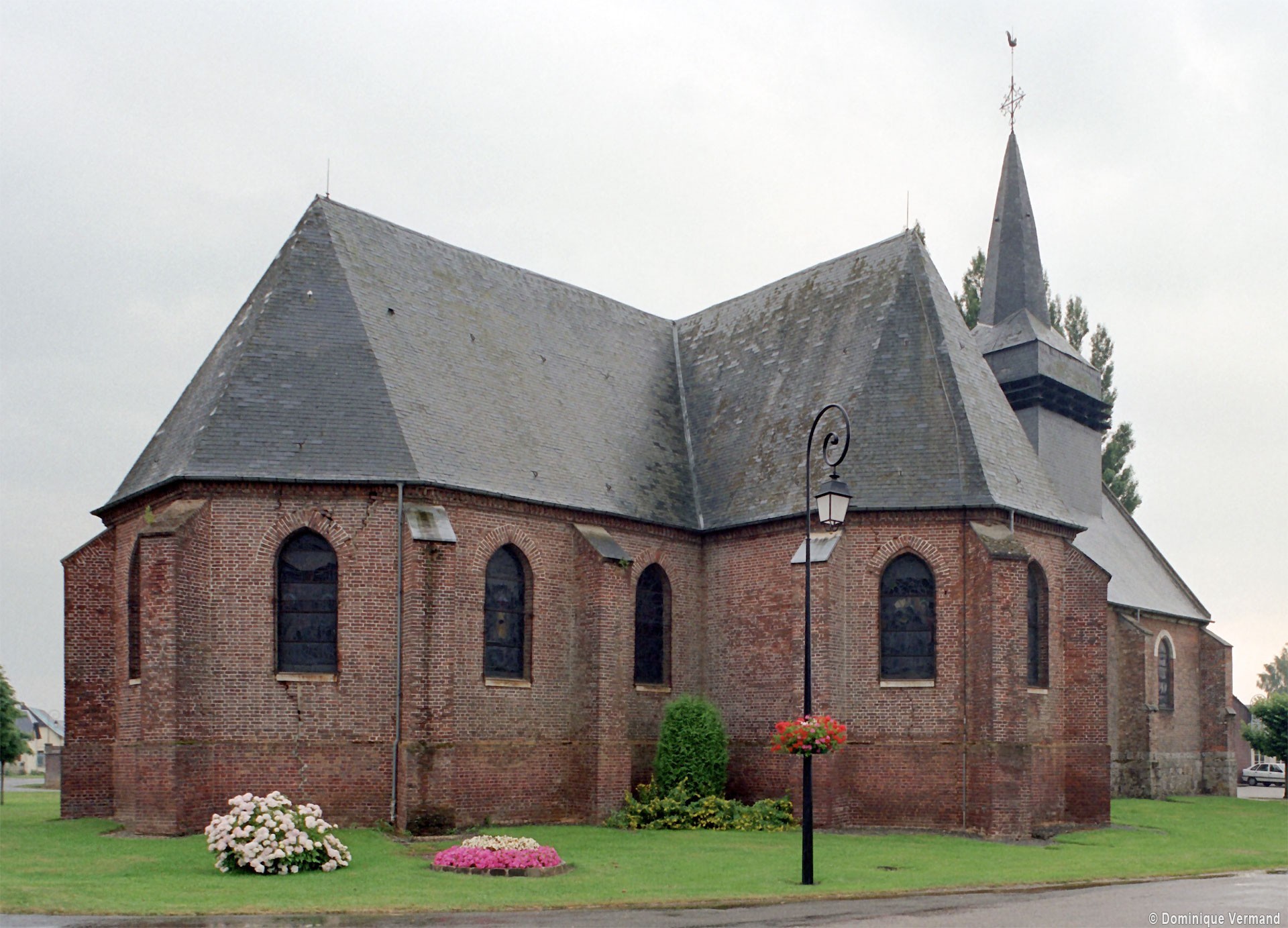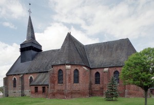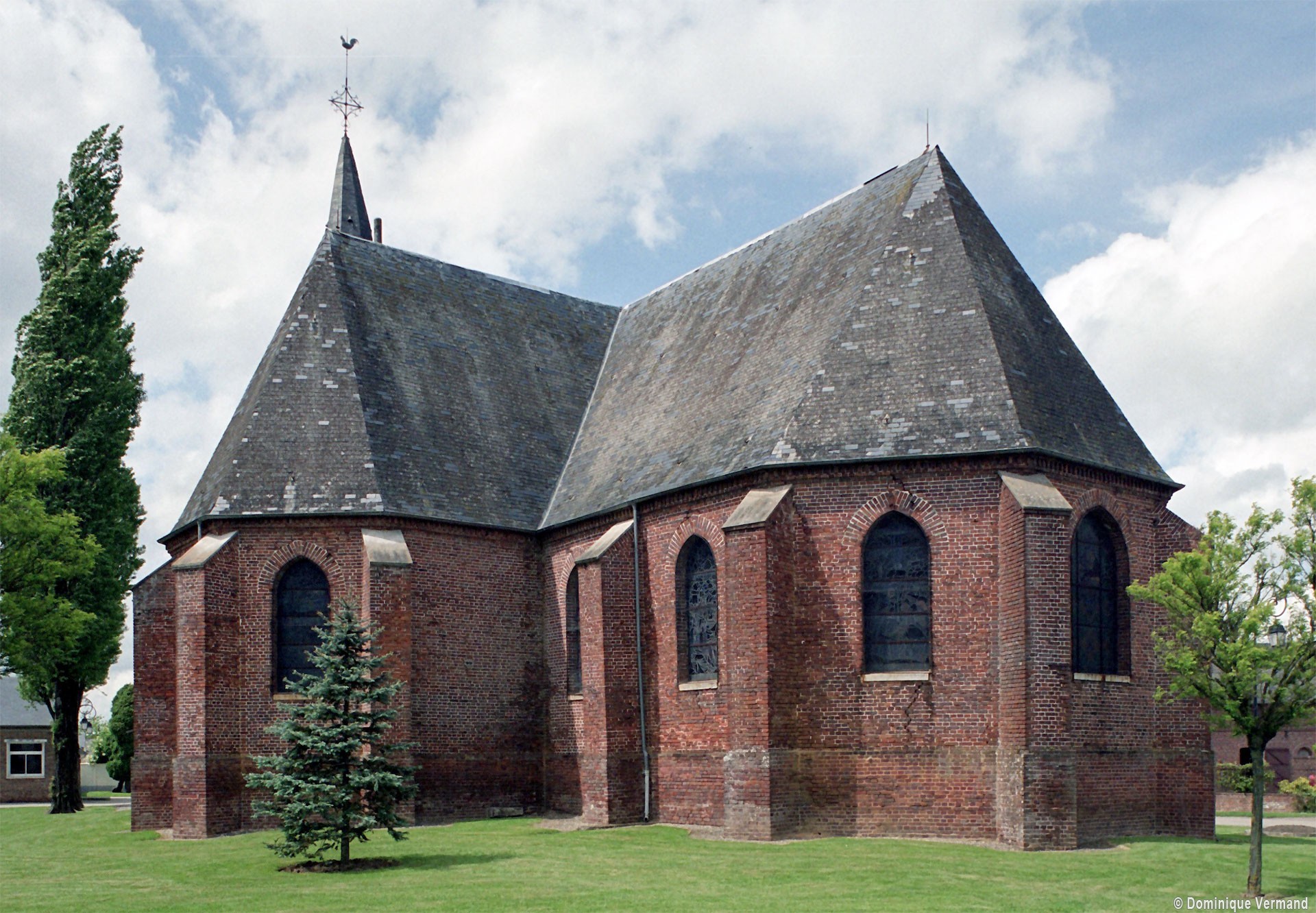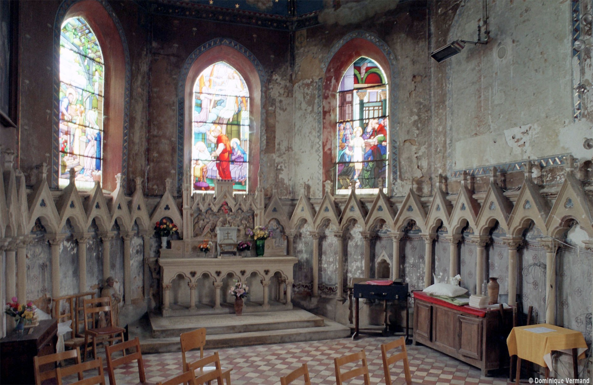 Les parties orientales – transept et choeur, tous deux terminés par trois pans coupés – ont été reconstruites au milieu du 19ème siècle en briques, dans un style semblable à celui de la nef. Bien que dégradé, son décor néo-gothique – notamment celui du croisillon sud avec sa suite d’arcatures aveugles – mérite l’attention.