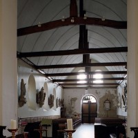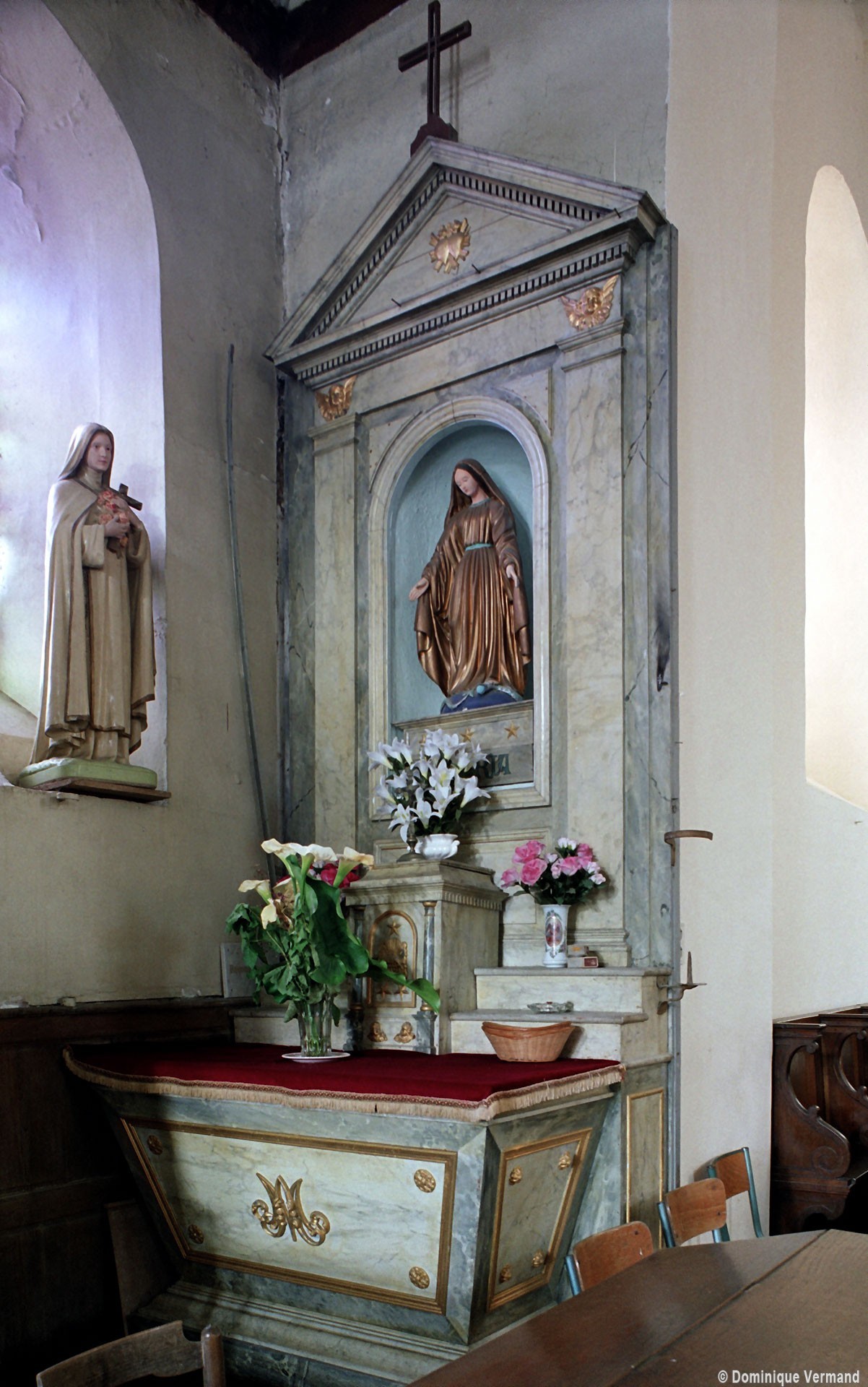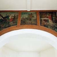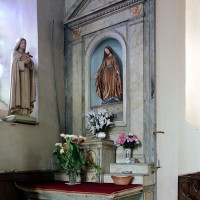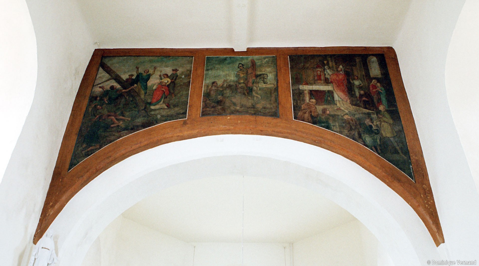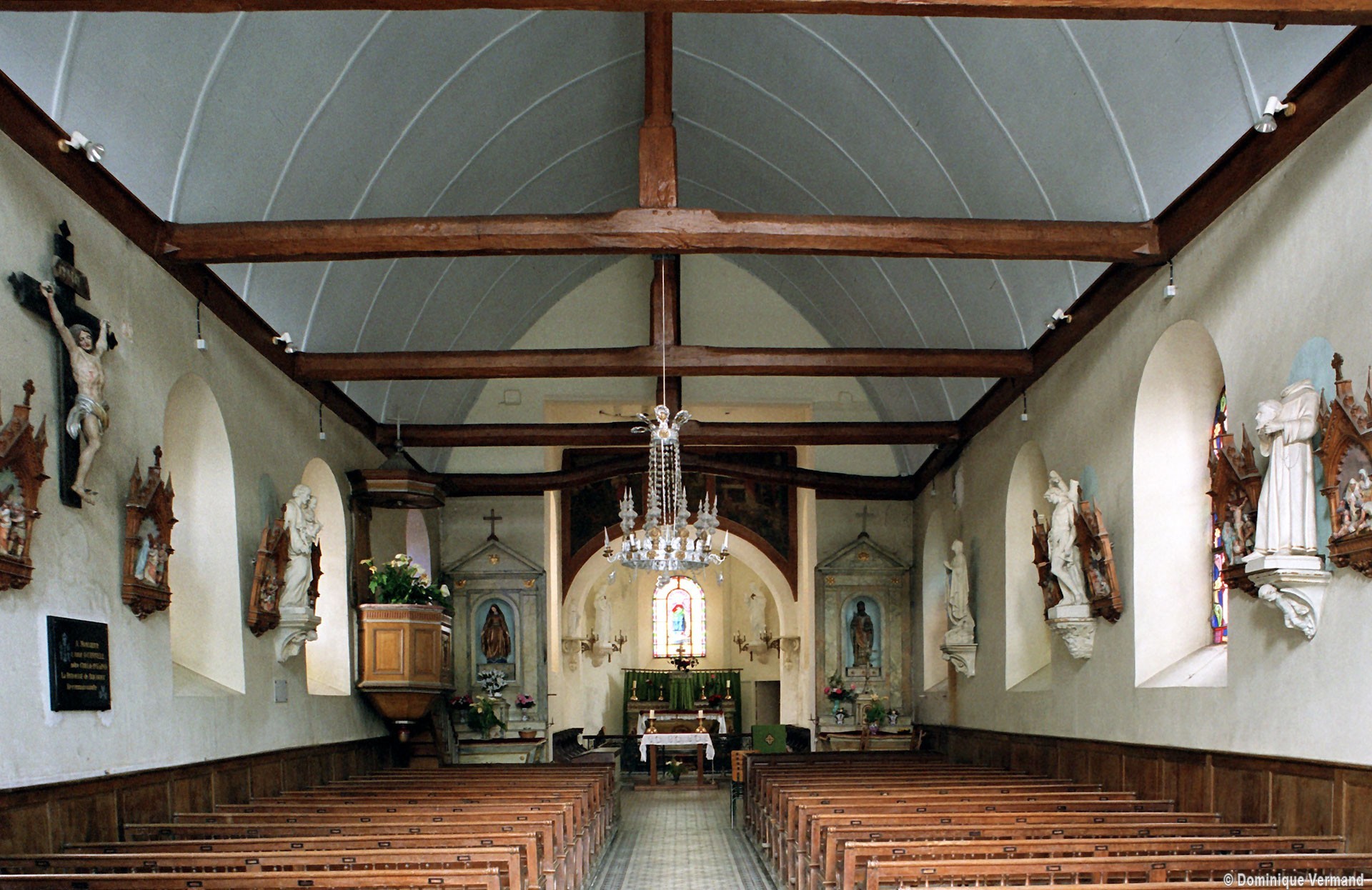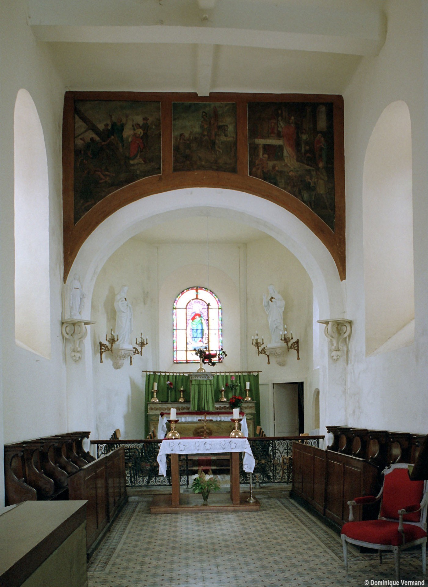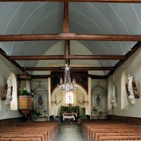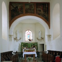 A l’intérieur, la nef a conservé sa charpente en carène du 17ème siècle – on notera que le percement des fenêtres de façade tient compte du poinçon (élément vertical) de celle-ci – tandis que le choeur est simplement plafonné. Deux autels secondaires avec retable, du 18ème siècle, encadrent l’entrée du choeur et une fresque en trois parties consacrée à saint Martin surmonte l’arcade introduisant à l’abside (2007).