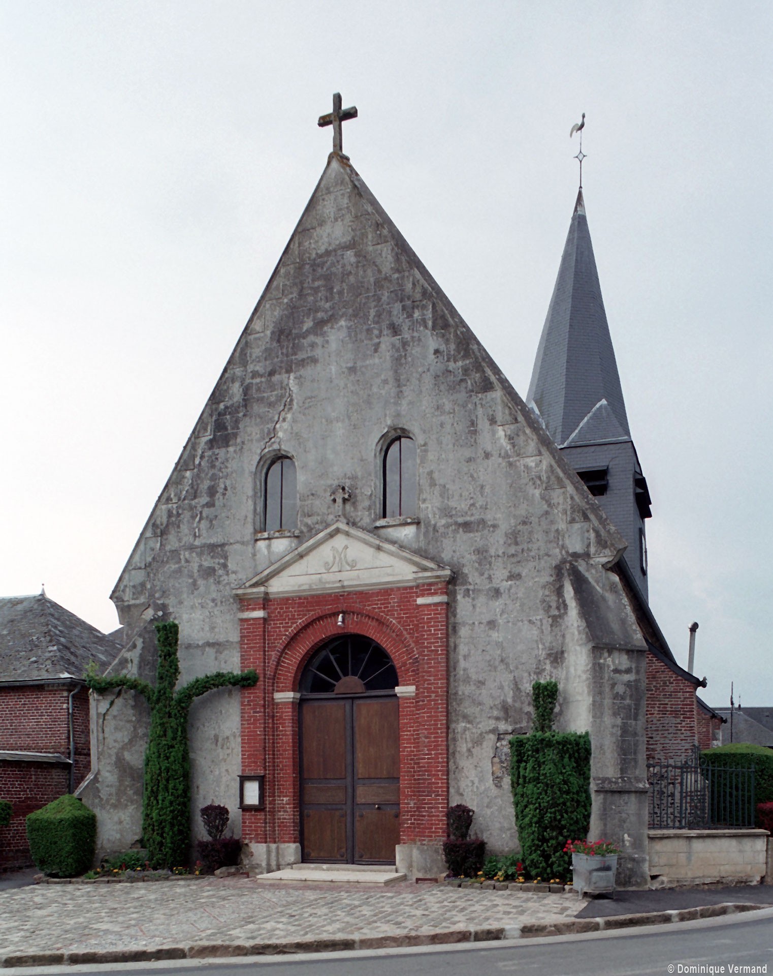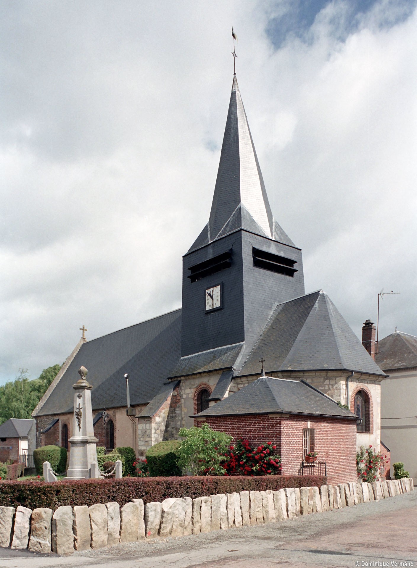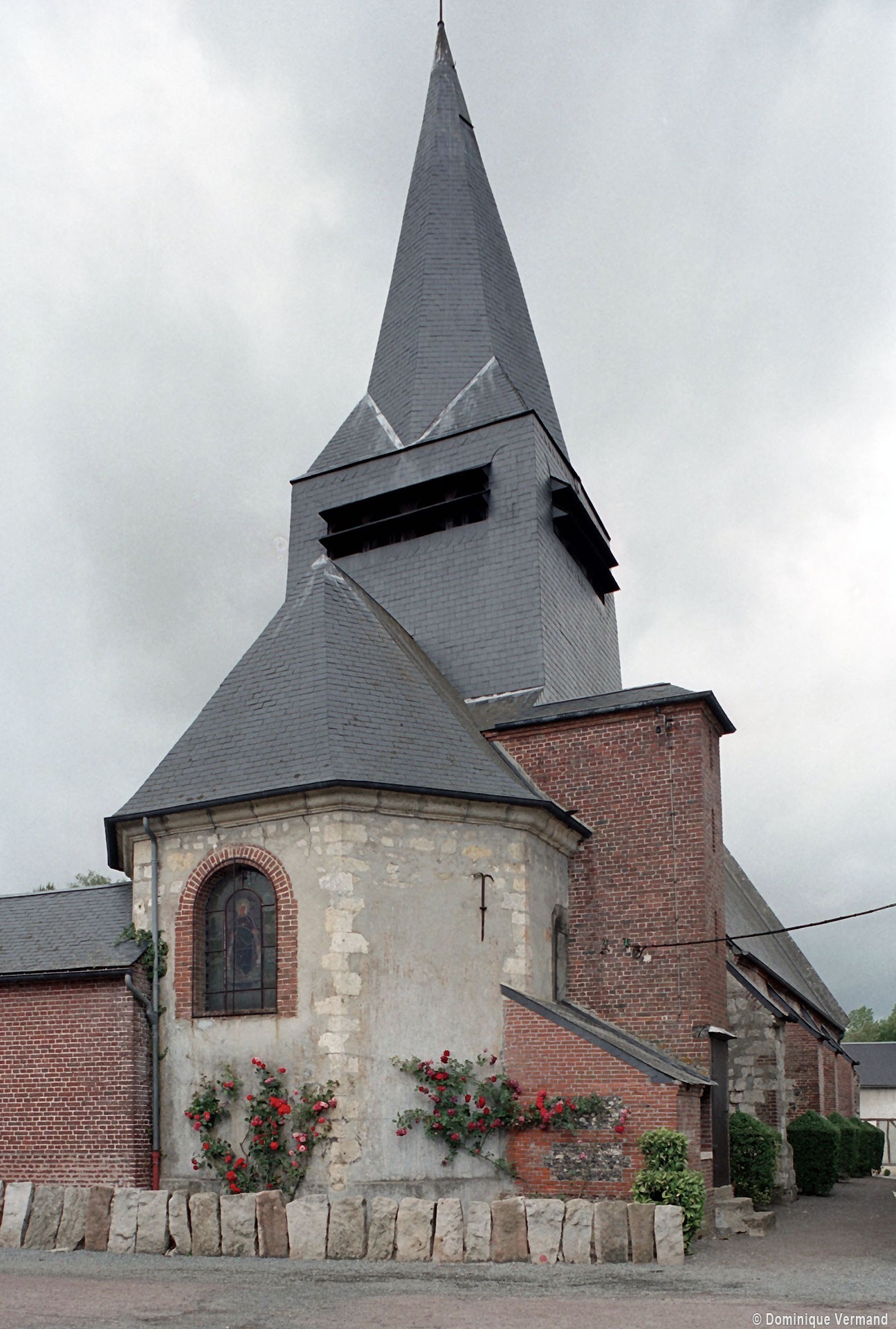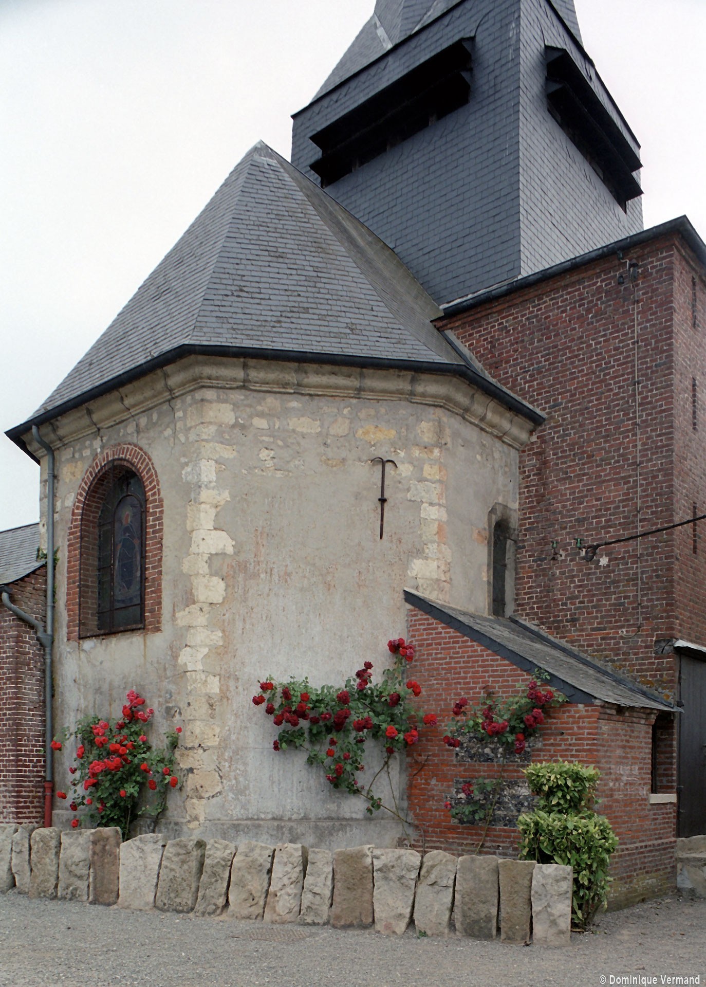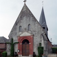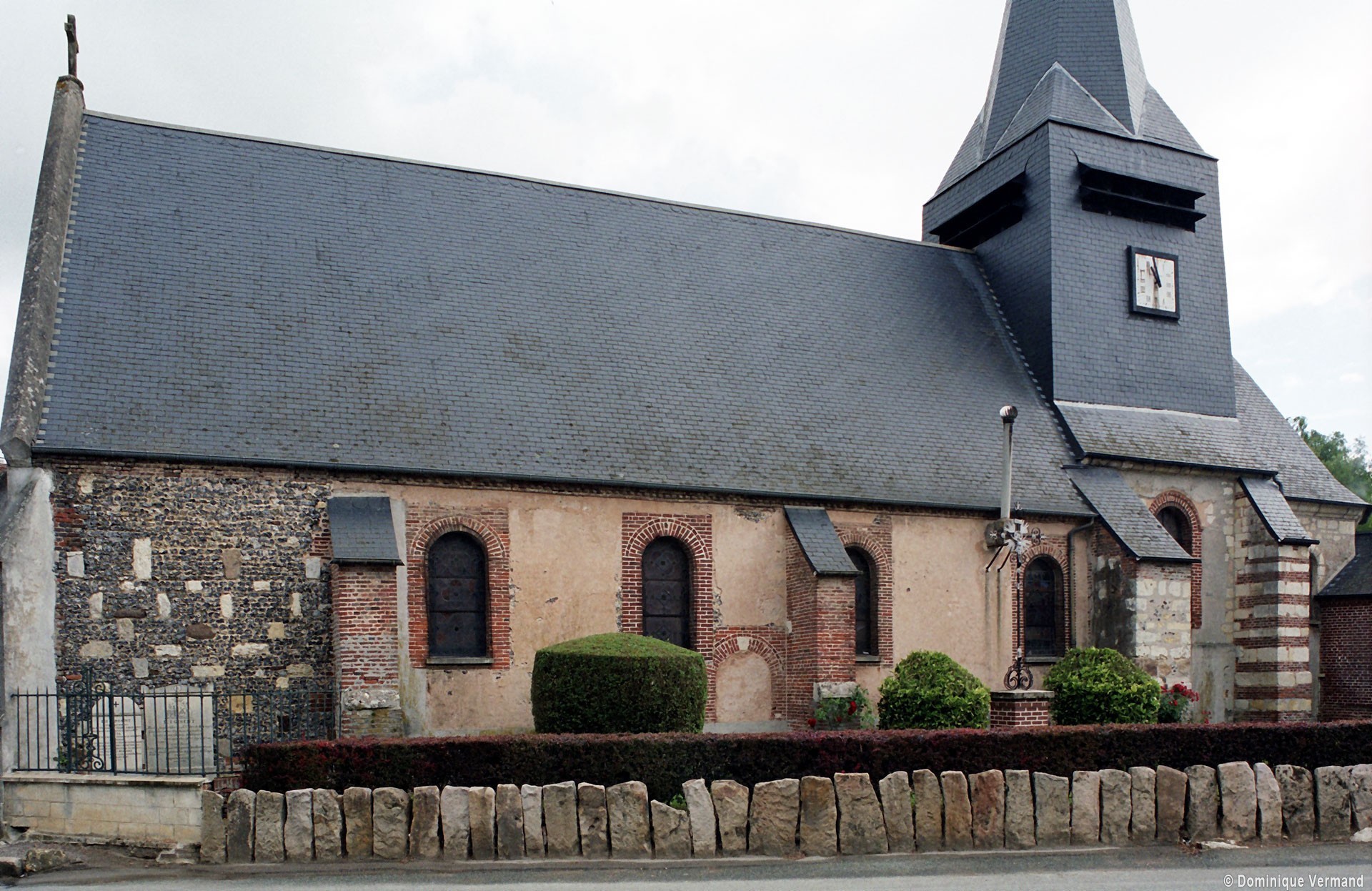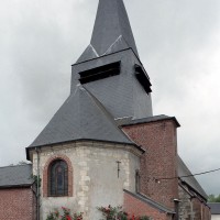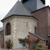 La plupart des fenêtres, le portail occidental et un certain nombre de contreforts ont été refaits en briques au 19ème siècle. Dans le mur sud de la nef, une petite porte aujourd’hui bouchée porte la date de 1743. L’abside, dépourvue de contreforts, et la travée droite du choeur associent dans leur construction des pierres grossièrement taillées et des moellons tandis qu’une partie de la nef montre une variante très libre du damier de pierres et silex.