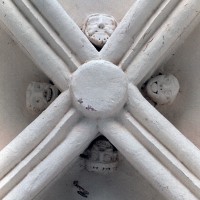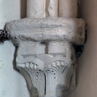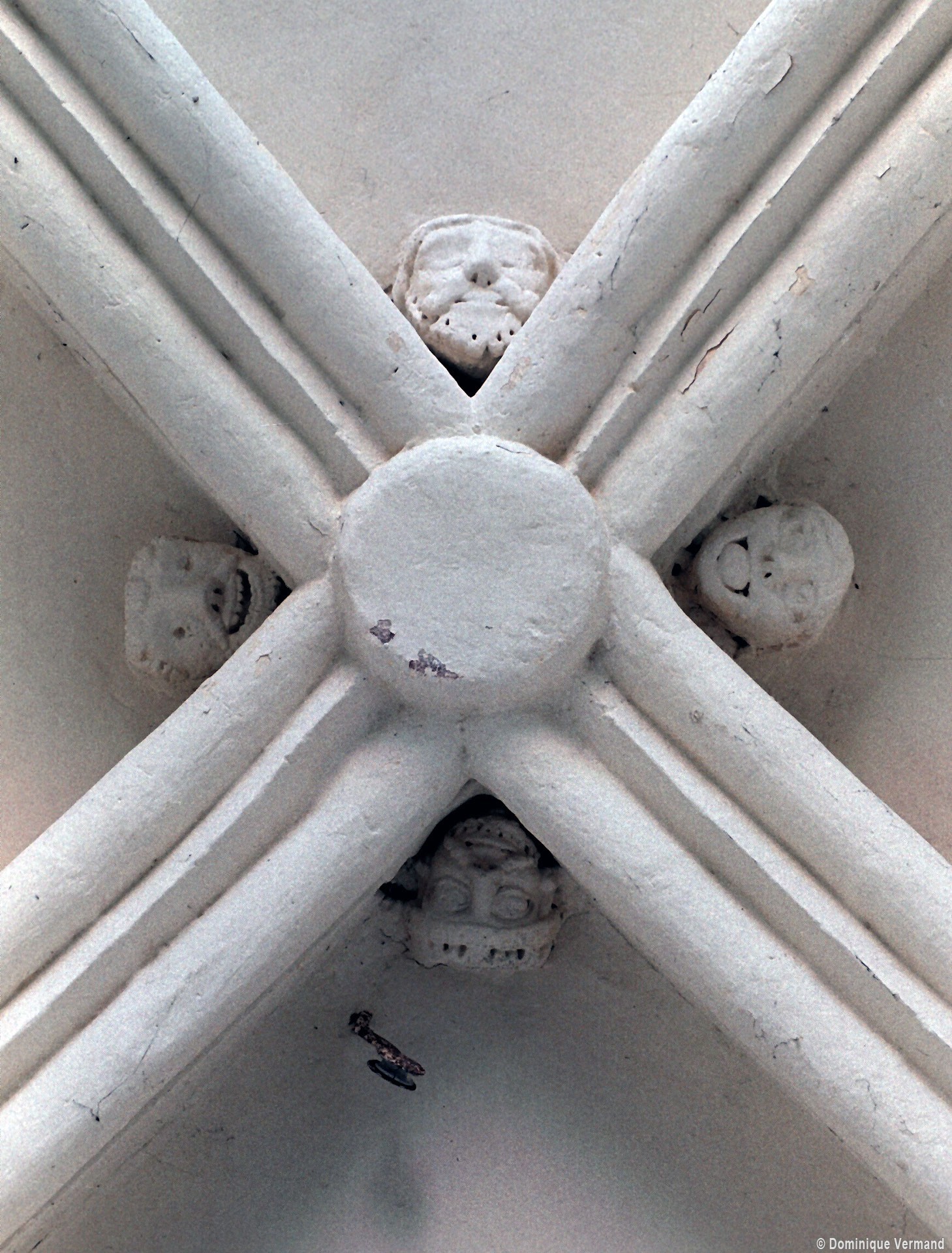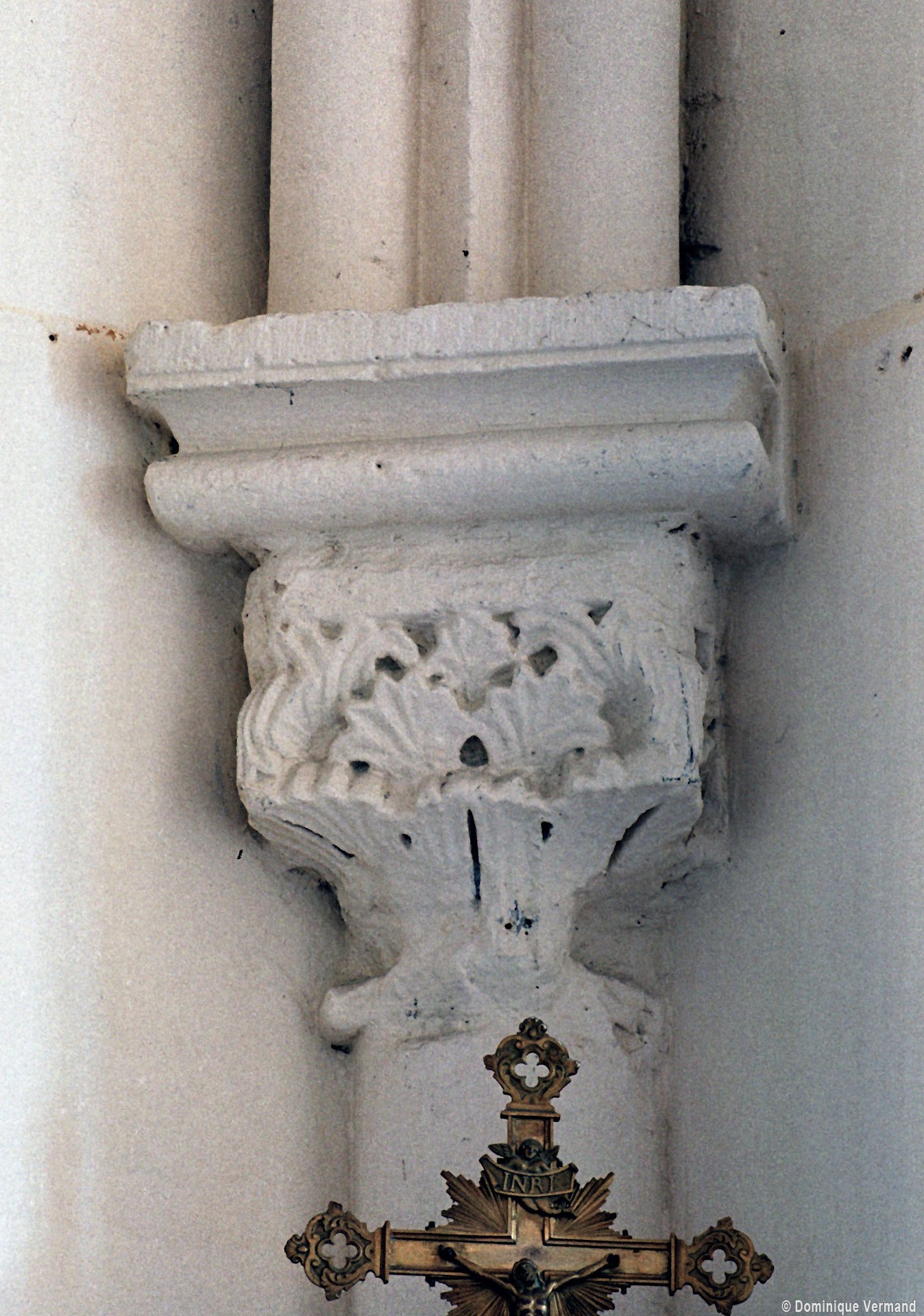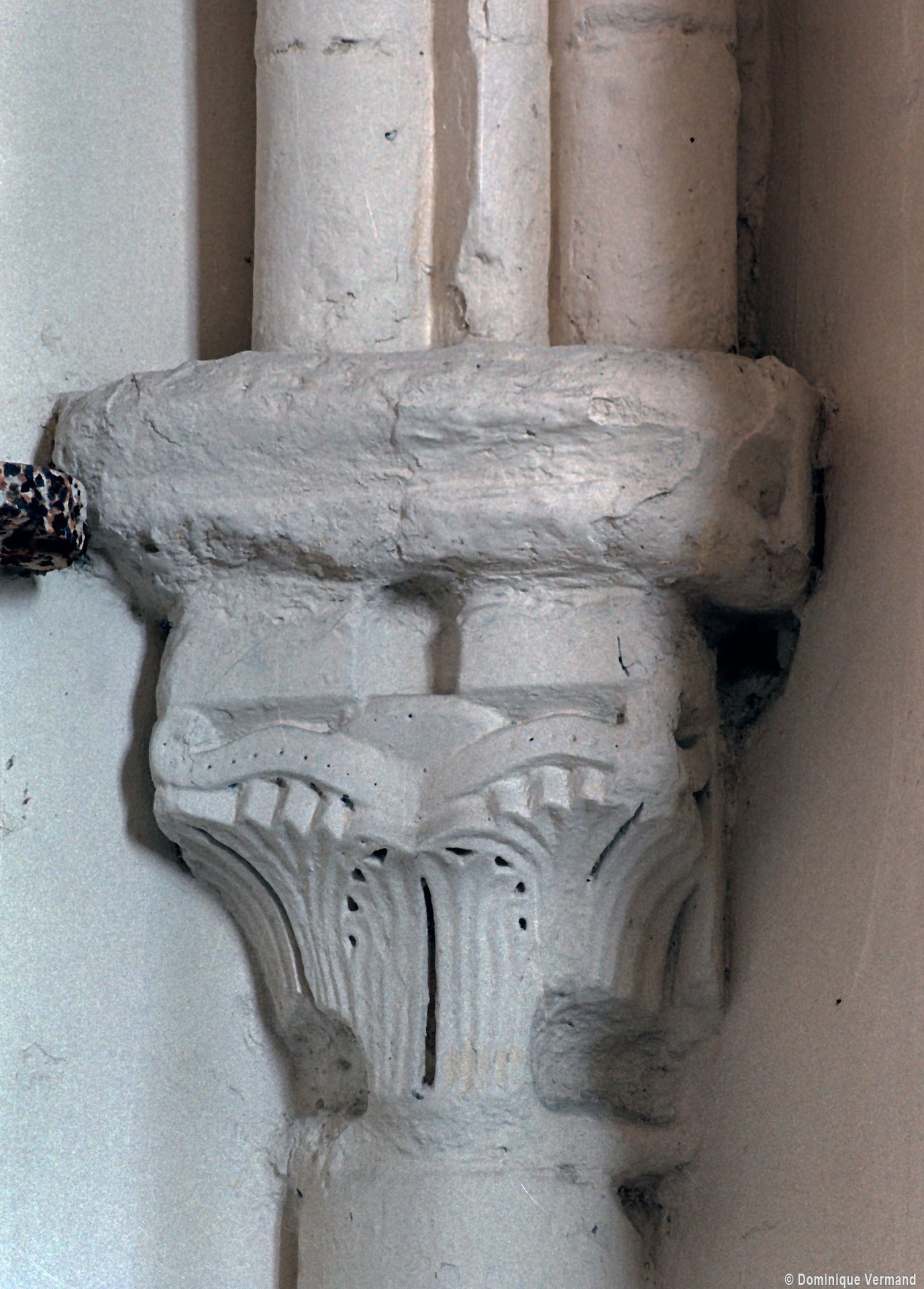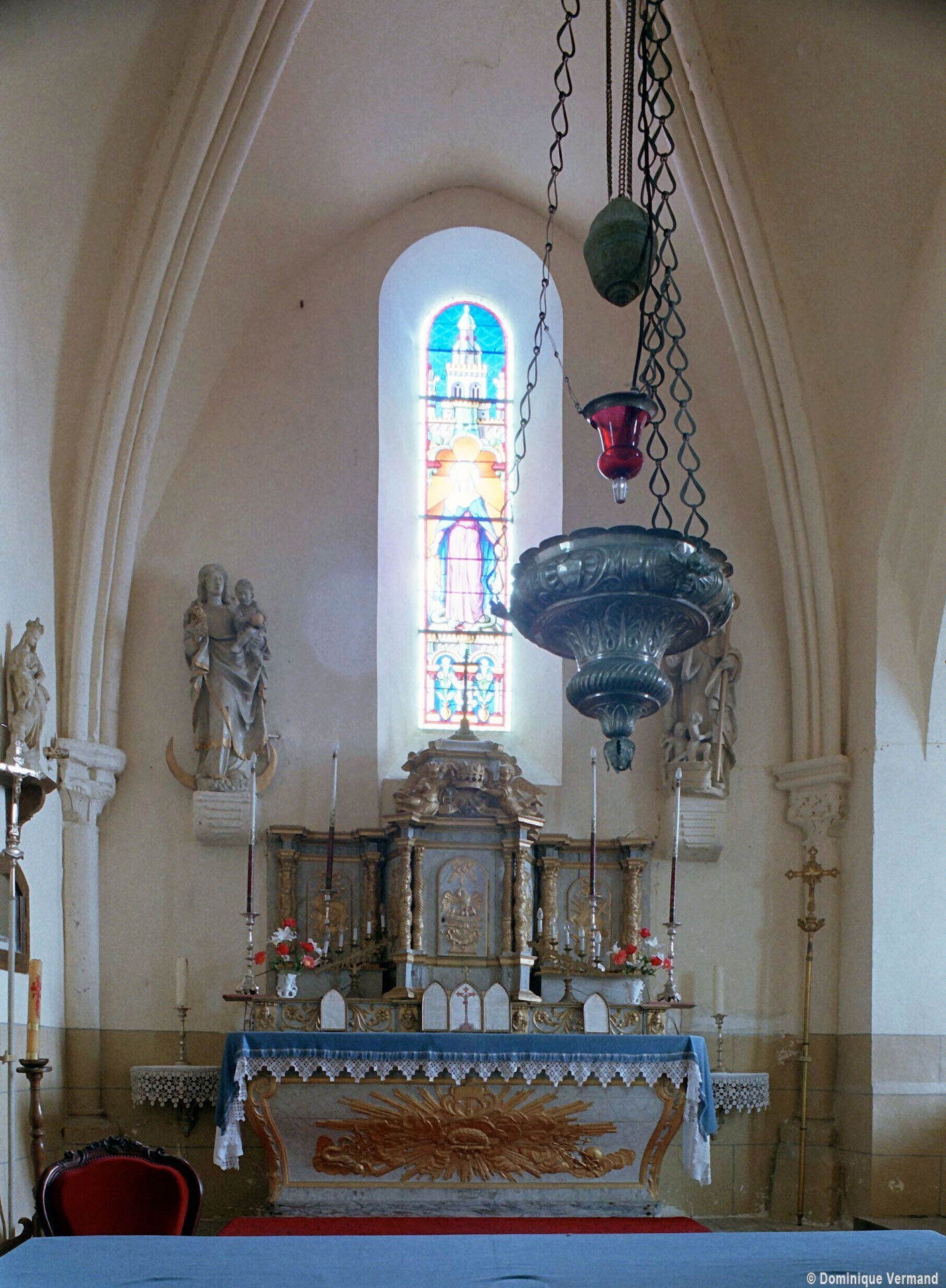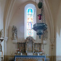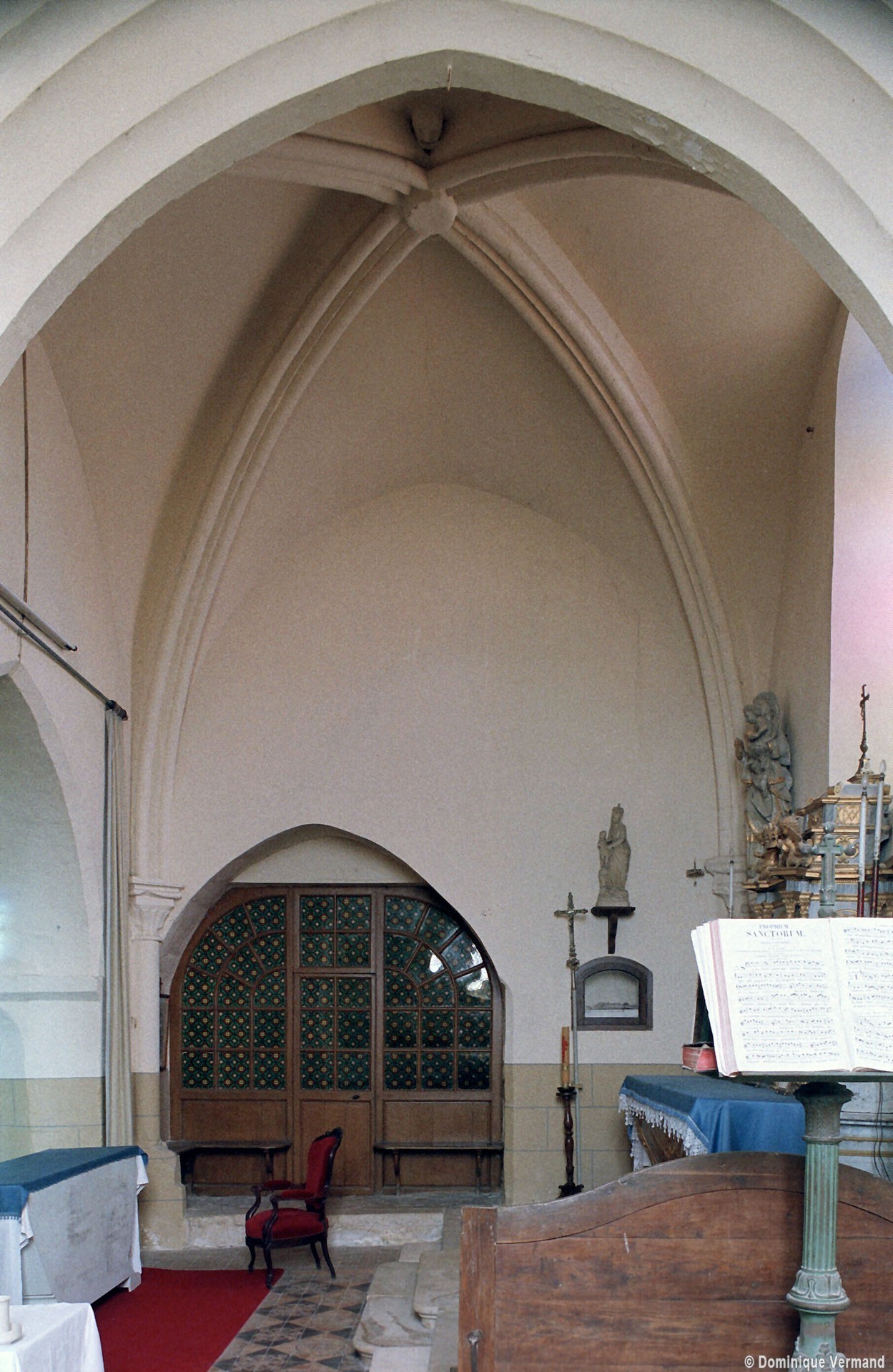 Le chœur apparaît comme isolé de la nef en raison de l’étroitesse de l’arcade qui assure la communication entre les deux parties de l’édifice. Bâti vers le milieu du 12ème siècle en remplacement du précédant, qui n’était vraisemblablement qu’une simple abside en hémicycle, il est de plan carré et couvert d’une voûte d’ogives qui en fait tout l’intérêt. Profilée d’une arête entre deux tores comme cela est courant à l’époque, elle retombe sur des chapiteaux décorés de feuilles d’acanthe ou, pour l’un d’entre eux, de godrons, preuve de l’influence de la Normandie toute proche. Quatre têtes très expressives entourent la clef de voûte.