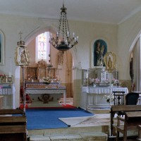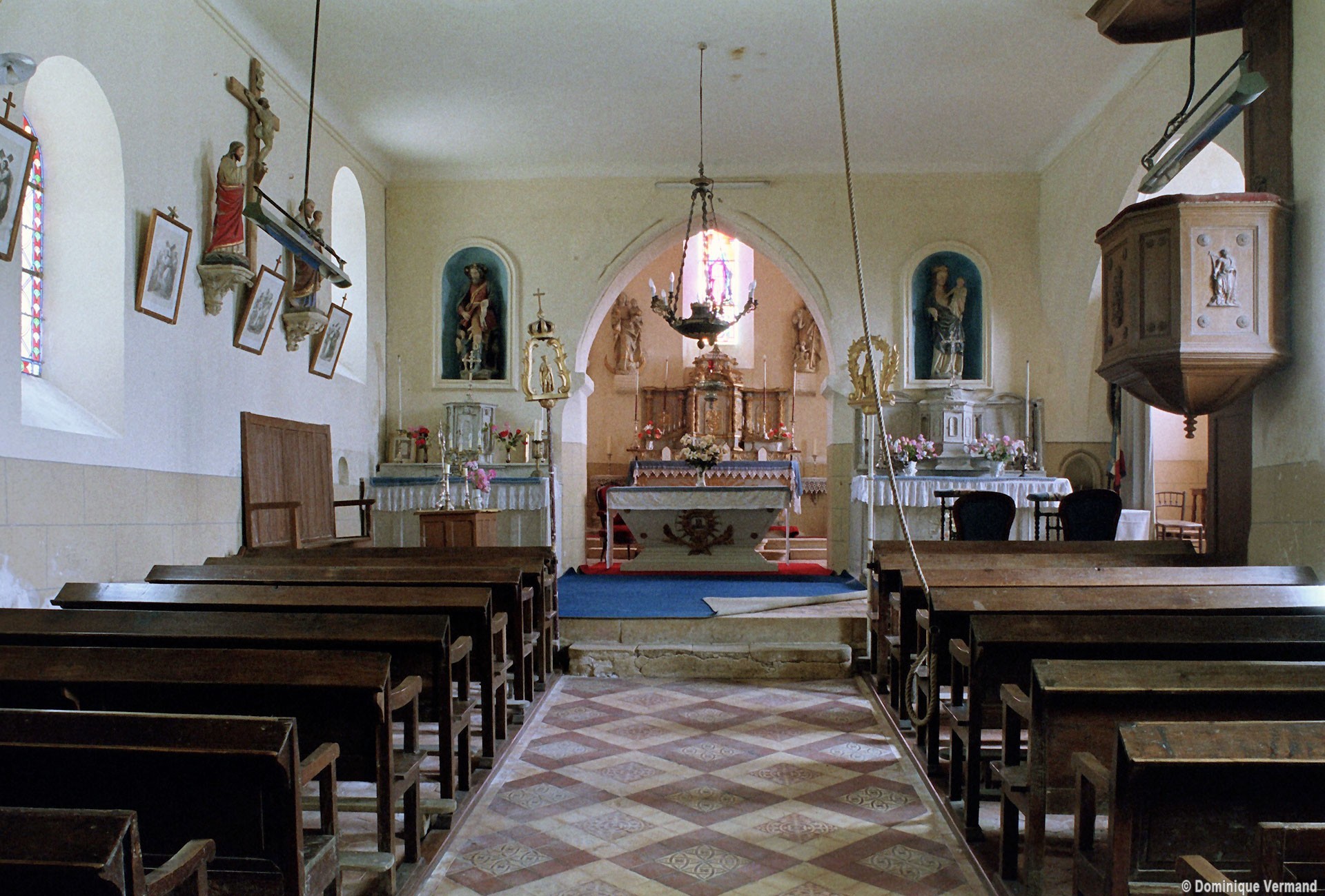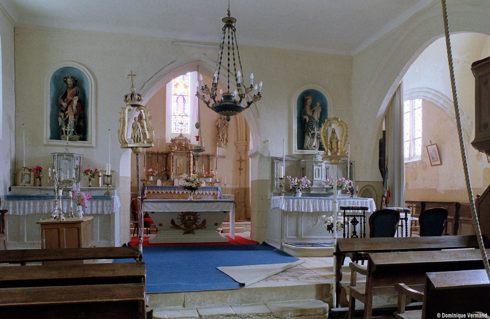 L’église est un édifice d’apparence modeste mais fort intéressant. Précédée d’un étroit porche en pierre, sans doute du 17ème siècle, la nef unique remonte au 11ème siècle comme en témoignent les contreforts plats et sans larmiers intermédiaires qui épaulent la façade et deux petites fenêtres en plein cintre, aujourd’hui bouchées. L’archivolte de celle du mur sud est en effet constituée de claveaux simulés et des billettes garnissent la fenêtre de la façade. Les fenêtres actuelles sont modernes.