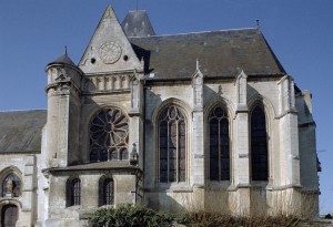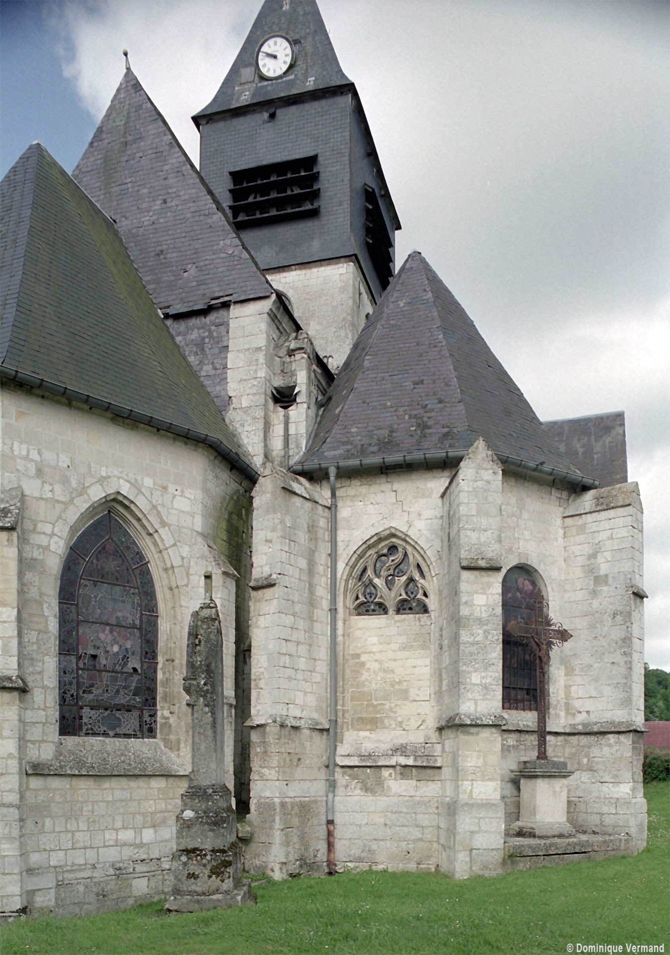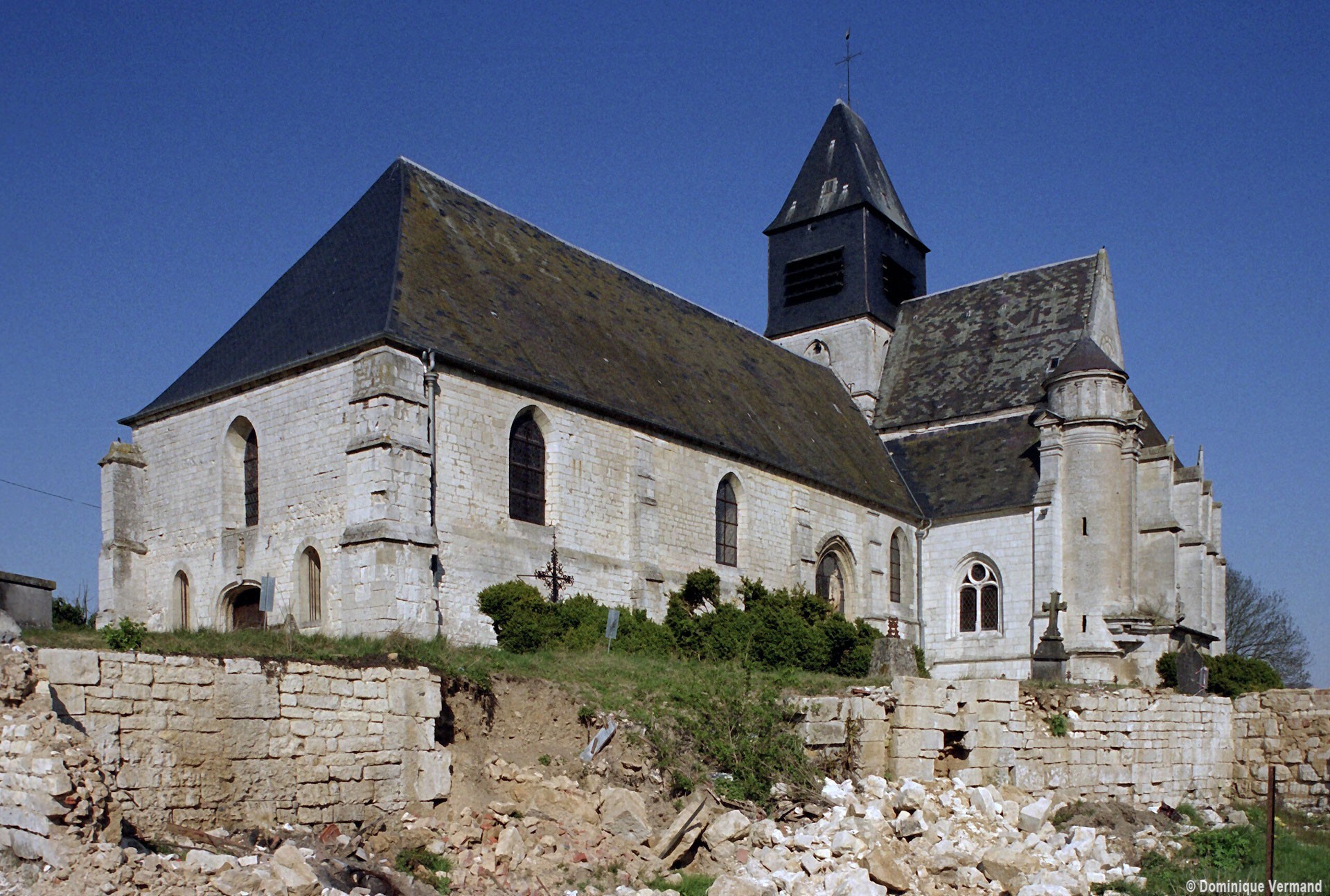 Escortée au sud par une importante motte féodale encore parfaitement conservée, l’église Saint-Nicolas occupe un site dominant qui met bien en valeur sa silhouette tourmentée, fruit d’une histoire monumentale particulièrement riche. Fondée en tant qu’église d’un prieuré cure, sans doute au début du 12ème siècle par l’abbé de Breteuil Guillaume II, elle le restera jusqu’à la fin du 17ème siècle. Il ne subsiste rien des bâtiments du prieuré, hormis une partie du mur de clôture et une porte, du 13ème siècle, à l’ouest de l’église. Ce statut explique que l’église possède un double chœur, celui du centre – flanqué d’une chapelle au nord – réservé au prieuré et dédié à saint Nicolas et celui du sud, affecté à la paroisse et consacré à Notre-Dame.