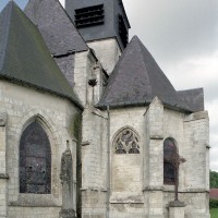 Cette première église sera dotée – comme ce fut souvent le cas – d’un nouveau chœur à l’époque gothique, sans doute à la fin du 13ème siècle. Constitué à l’origine de deux travées et terminé par un chevet plat, il est surtout reconnaissable dans sa première travée – celle qui porte le clocher – dotée à l’est et à l’ouest d’arcades en cintre brisé. Au-dessus, coiffé d’un important beffroi en charpente recouverte d’ardoises, le clocher est ajouré de doubles baies sur les faces nord et sud et d’une simple baie sur les deux autres faces. Elles sont malheureusement obturées et peu visibles.