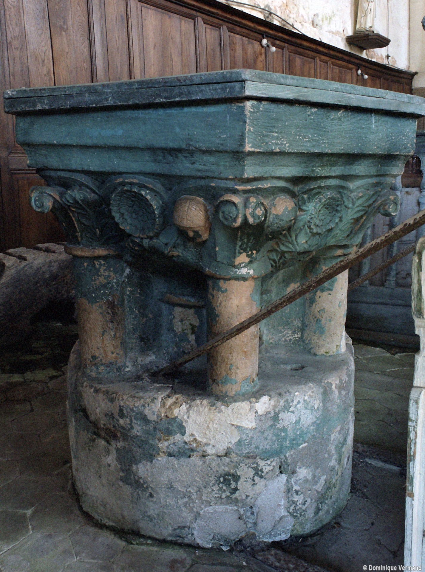 Une très belle cuve baptismale à six colonnettes, de la fin du 12ème siècle, ajoute à l’intérêt de l’église (2007).
