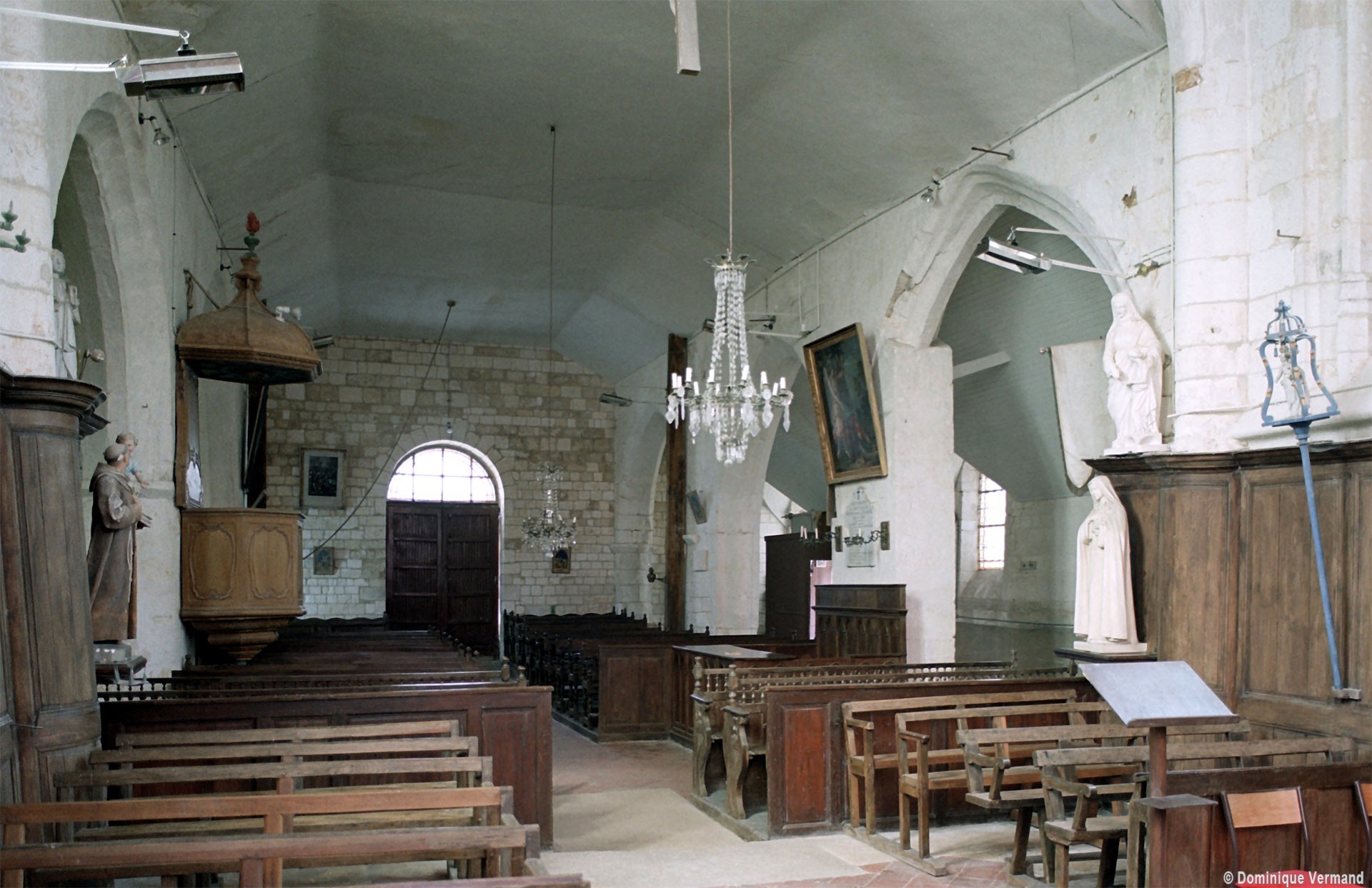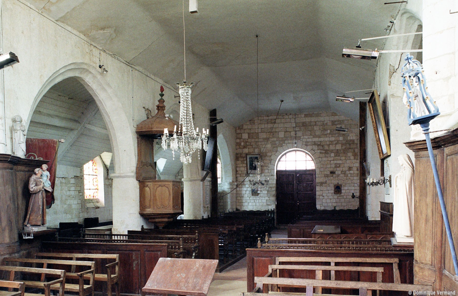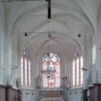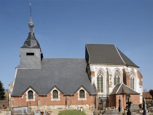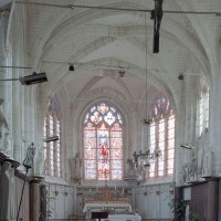 La nef est la partie la plus hétérogène. Non voûtée, elle communique avec les bas-côtés par des arcades au tracé brisé. On note un collage au niveau des piles situées à l’ouest qui prouve que les seconde et troisième travées ont été bâties d’abord, sans doute en même temps que le chœur, c’est-à-dire dans la première moitié du 16ème siècle. Construite peu après, la première travée s’appuie sur une façade reconstruite en style néo-classique qui remonte aux années 1820. Légèrement plus tardifs, les murs en briques des bas-côtés doivent être contemporains de la sacristie, bâtie en 1836.