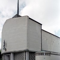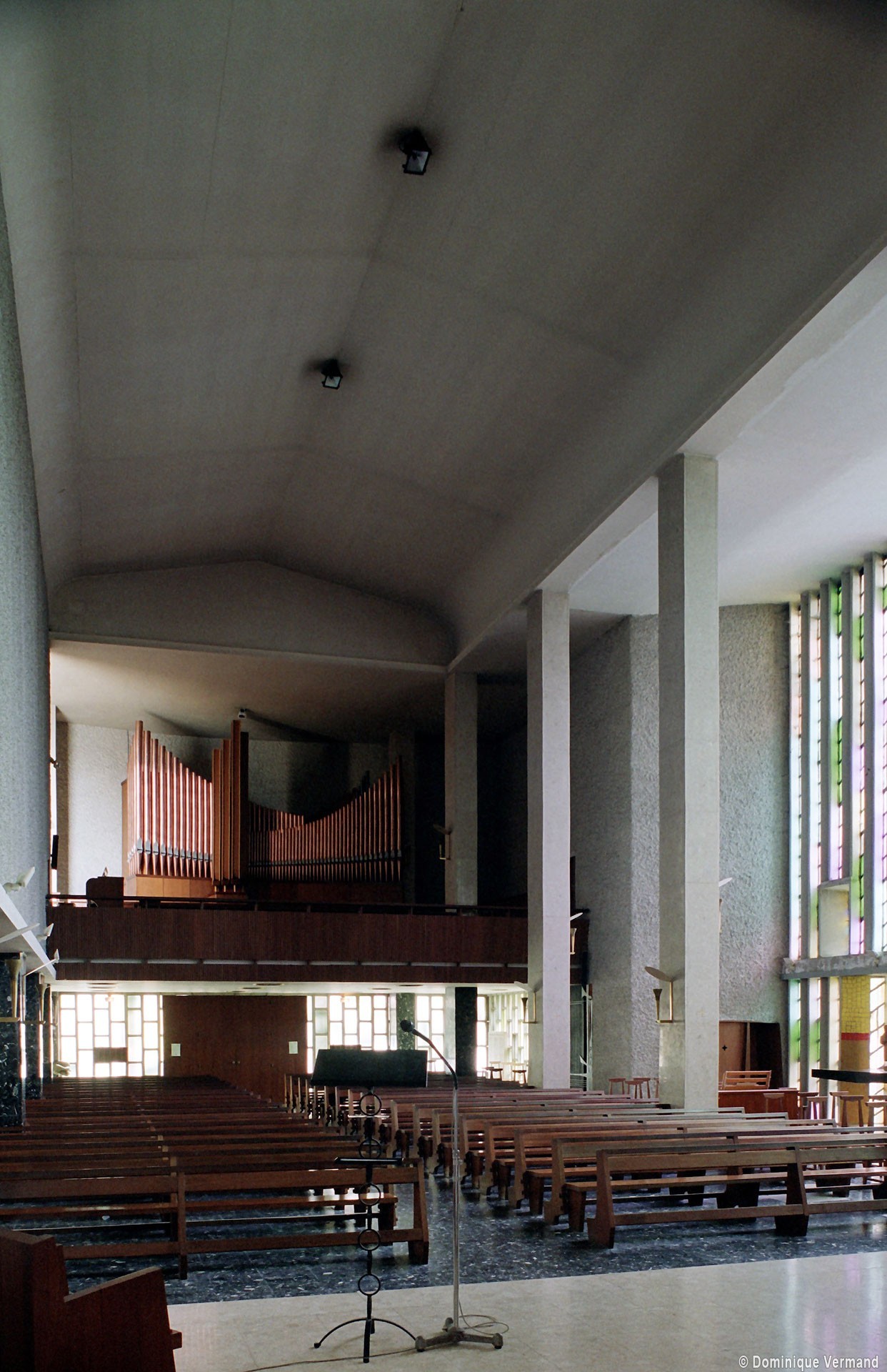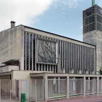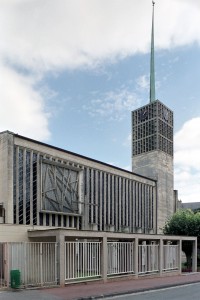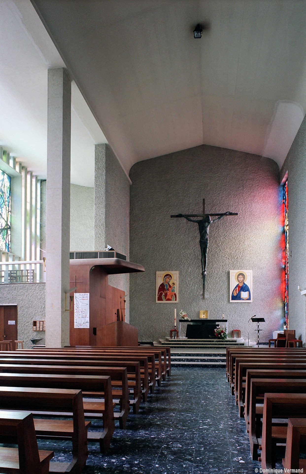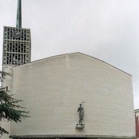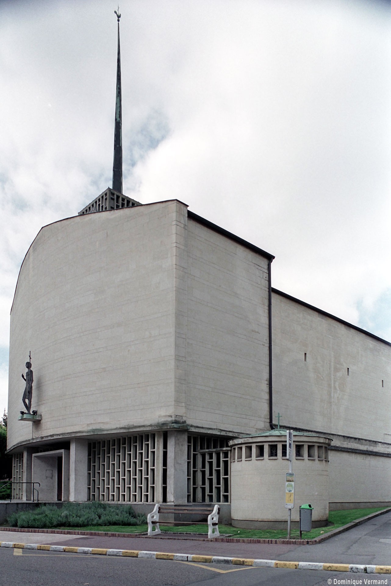 A l’extérieur, la rigueur du volume parallélépipédique de l’édifice est seulement perturbée par le clocher dont le beffroi forme comme une légère résille. Telle une aiguille, une haute flèche en acier le termine. Bâti en hors oeuvre près de la façade et reprenant en cela une tradition très ancienne, le petit baptistère circulaire abrite une remarquable cuve baptismale en marbre prenant la forme d’une colombe, œuvre de Claude Mary (2005).