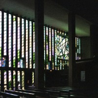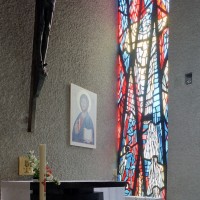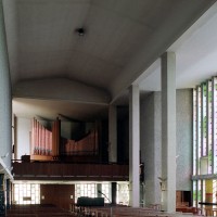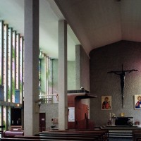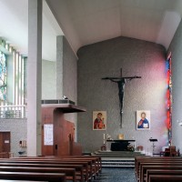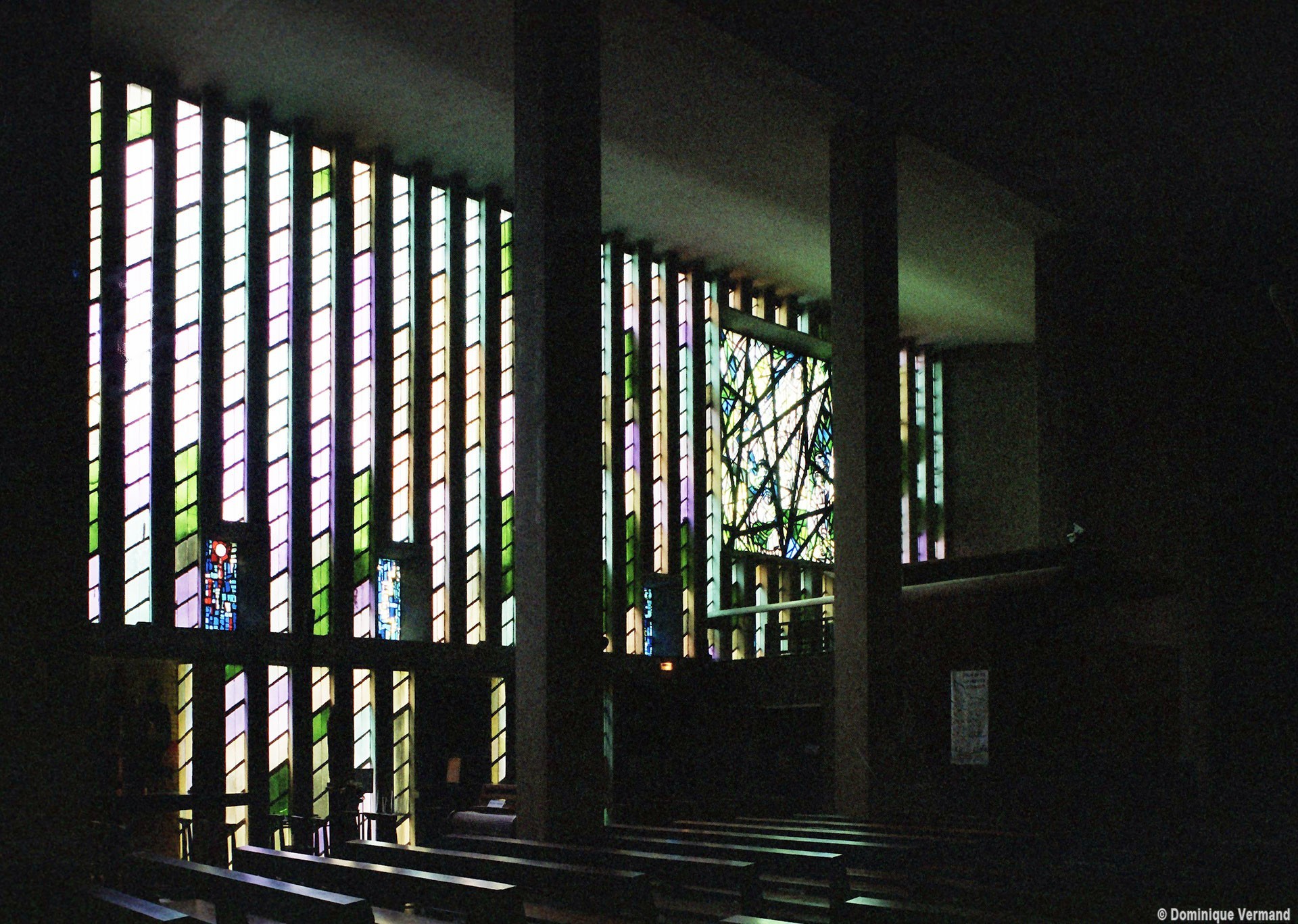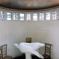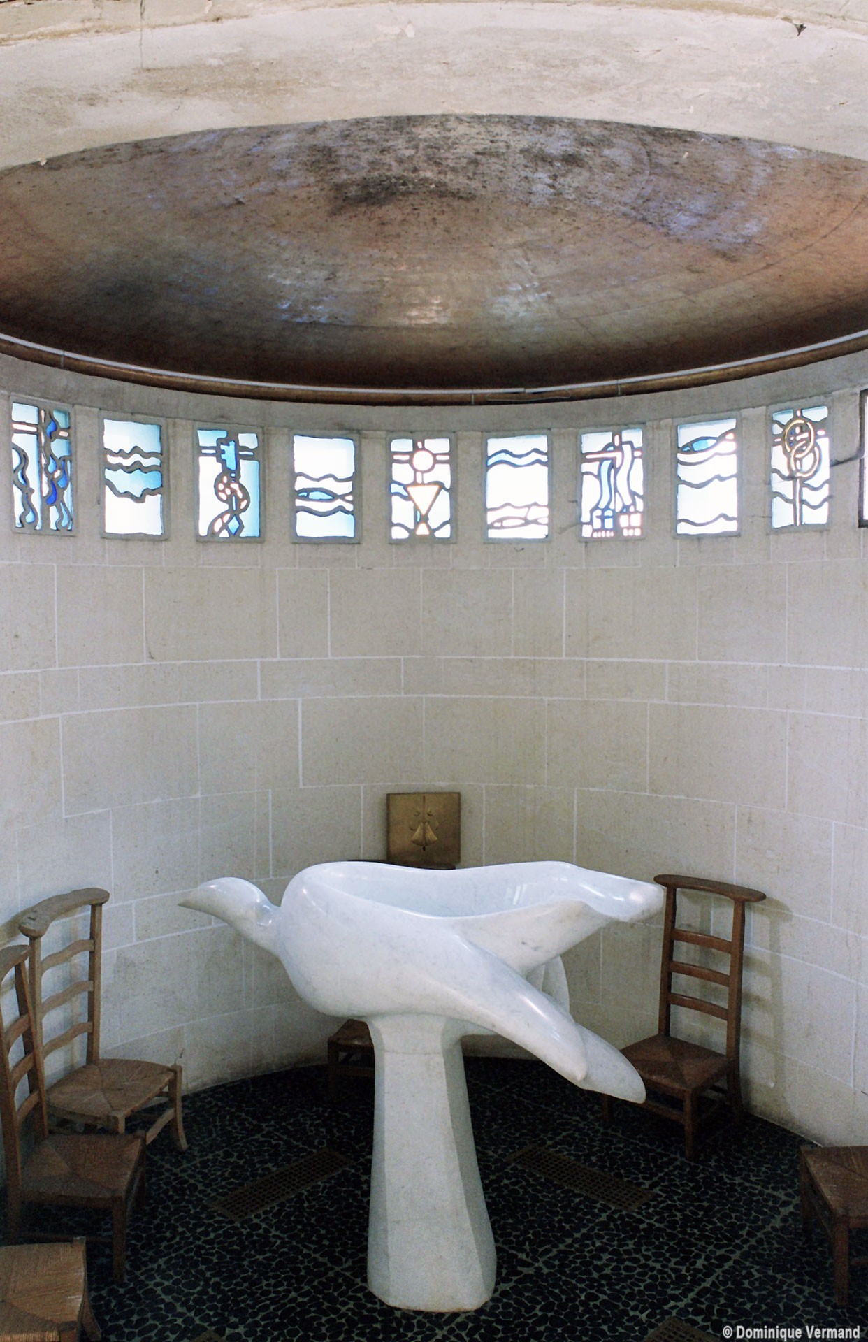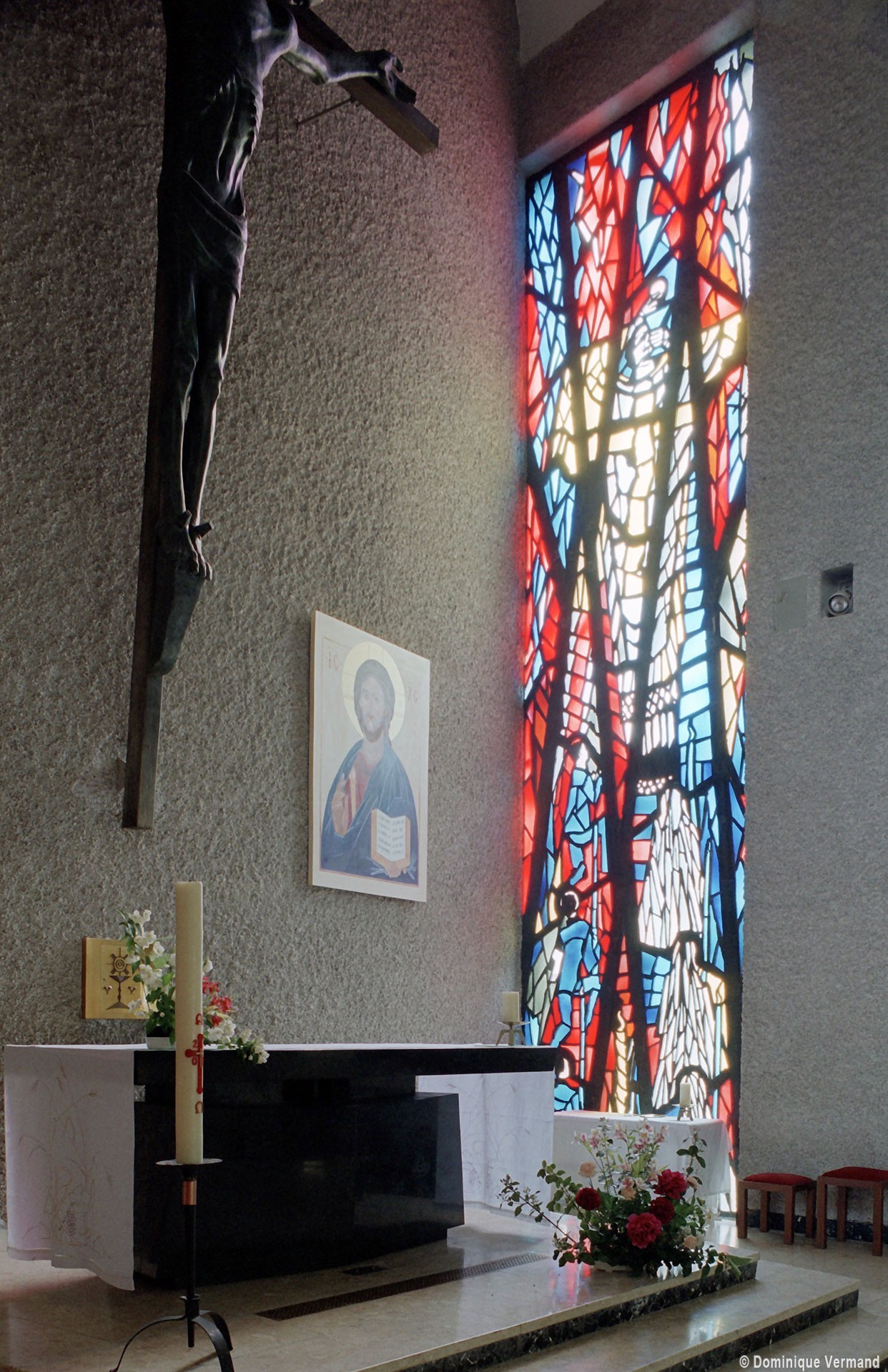 A l’extérieur, la rigueur du volume parallélépipédique de l’édifice est seulement perturbée par le clocher dont le beffroi forme comme une légère résille. Telle une aiguille, une haute flèche en acier le termine. Bâti en hors oeuvre près de la façade et reprenant en cela une tradition très ancienne, le petit baptistère circulaire abrite une remarquable cuve baptismale en marbre prenant la forme d’une colombe, œuvre de Claude Mary (2005).