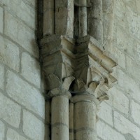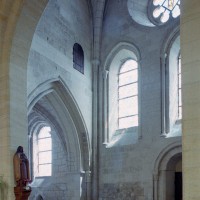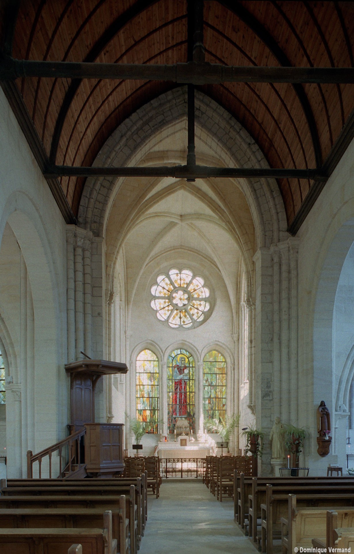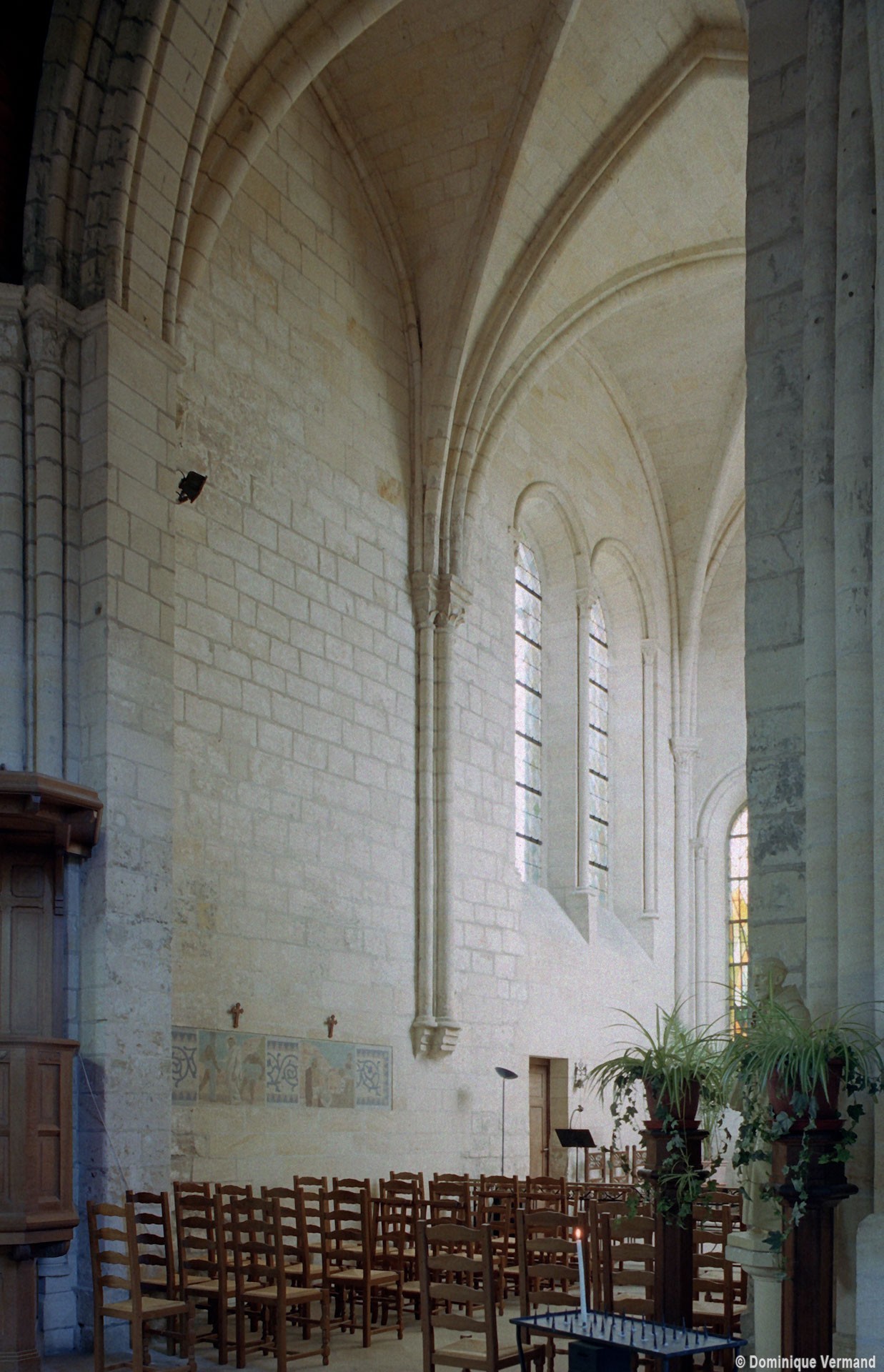 Le choeur est d’une exceptionnelle qualité. Beaucoup plus haut que le faux-transept, il comporte une première travée, courte et aveugle, correspondant aux chapelles. Par contraste, la seconde travée, de plan carré, est inondée de lumière. Les murs latéraux sont percés de double lancettes élancées, délicatement soulignées, à l’intérieur comme à l’extérieur, par des colonnettes en délit et une moulure torique.