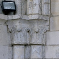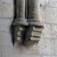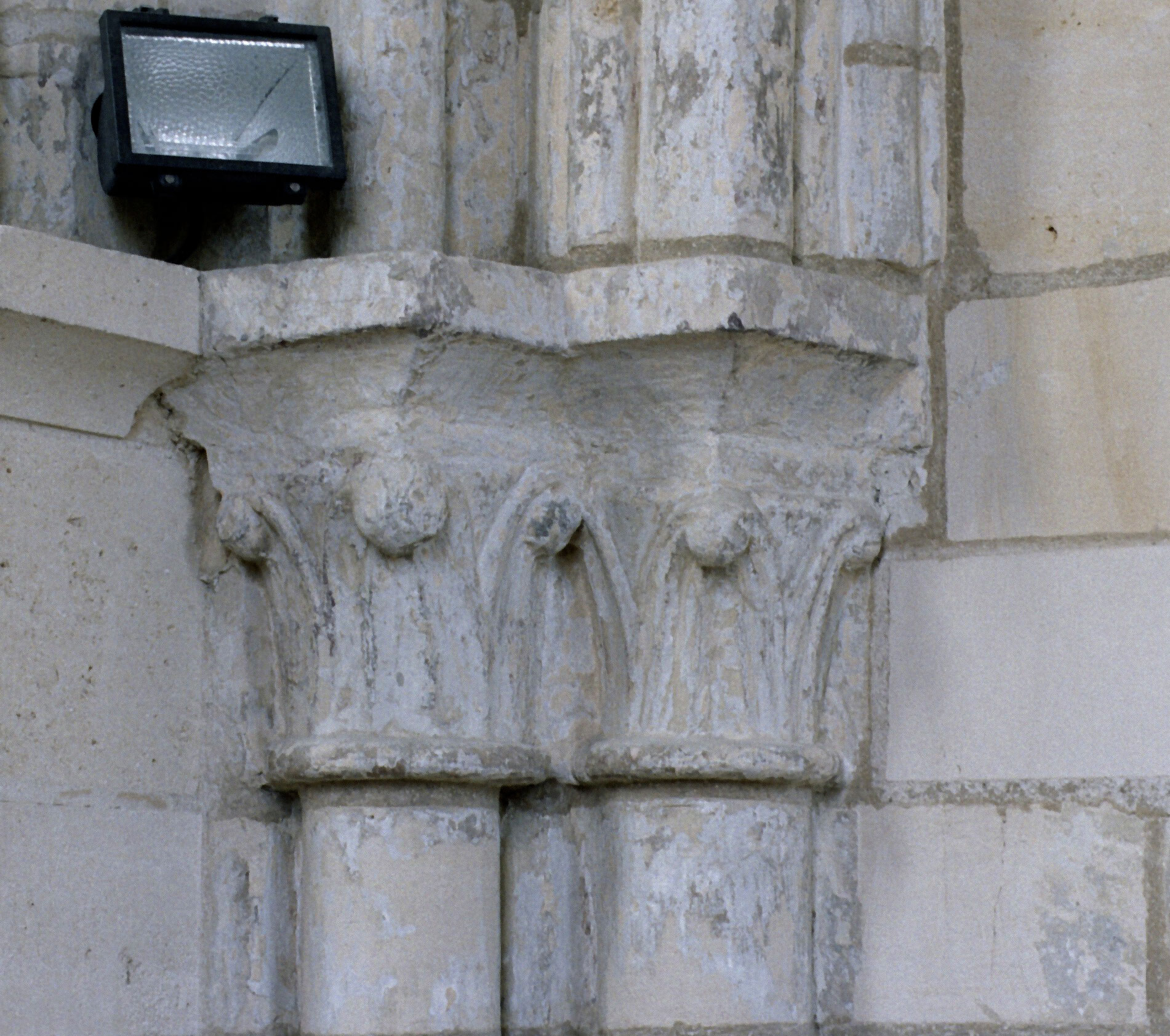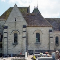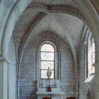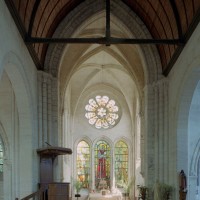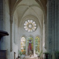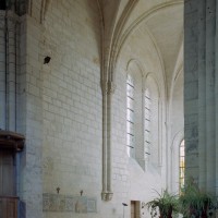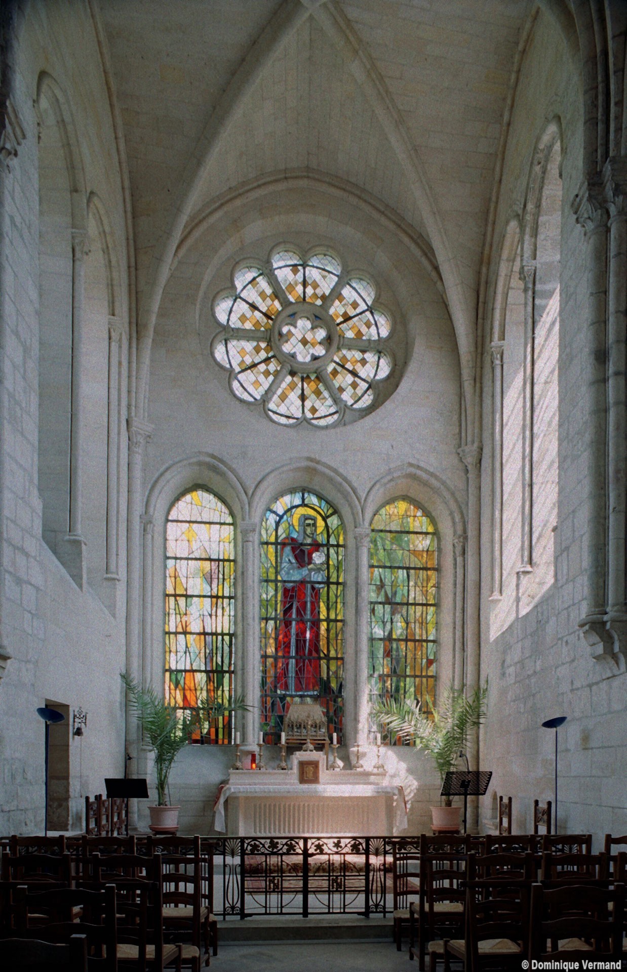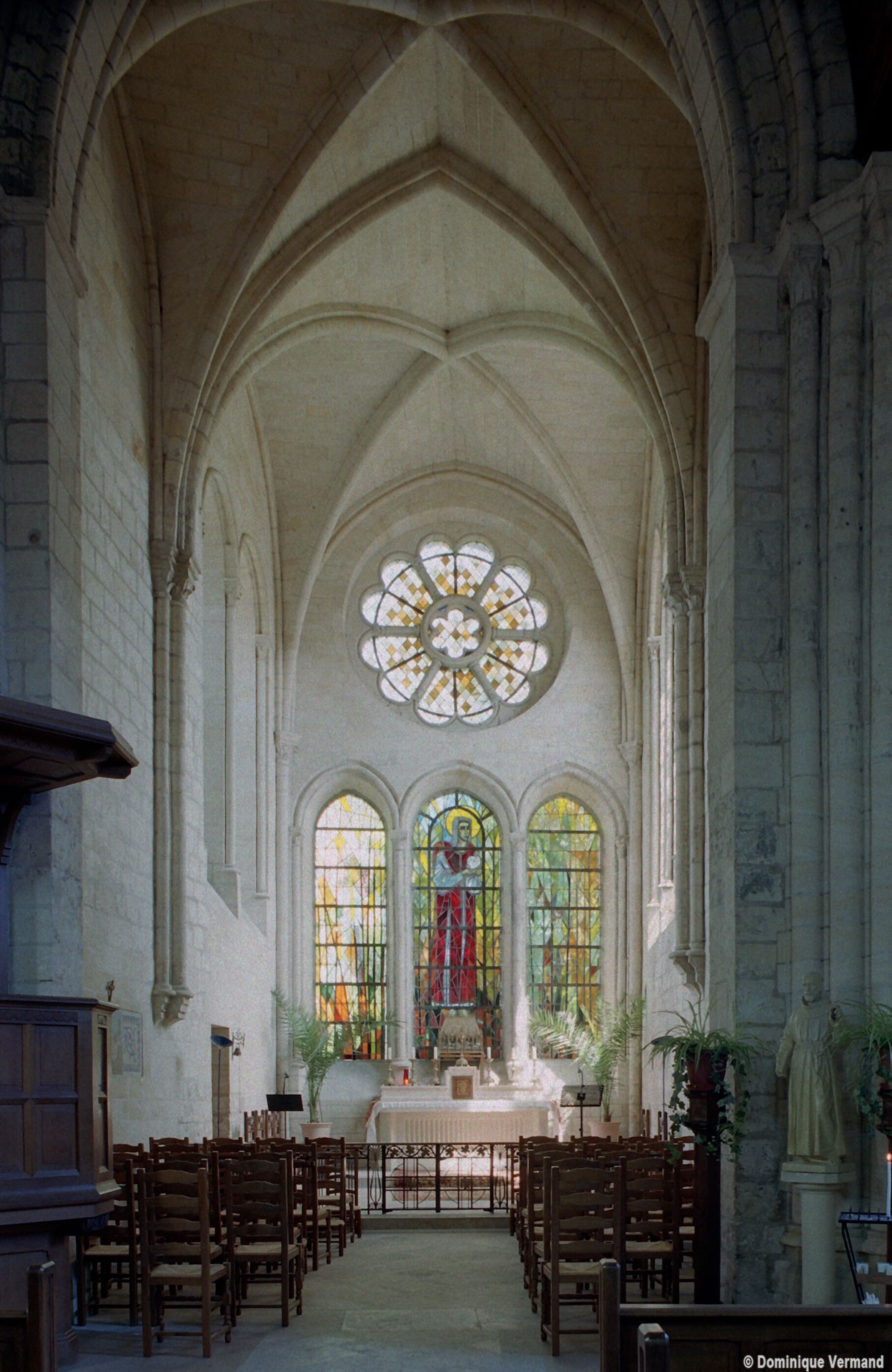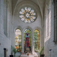 Le mur du chevet, à l’effet spectaculaire, superpose trois lancettes et une grande rose à douze lobes, une composition visiblement inspirée de celle du choeur de la cathédrale de Laon, du premier quart du 13ème siècle. Les chapiteaux à crochets et les tailloirs sont d’un style plus évolué que ceux des chapelles, antérieures d’une vingtaine d’années au moins (2008, révisé 2015).