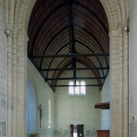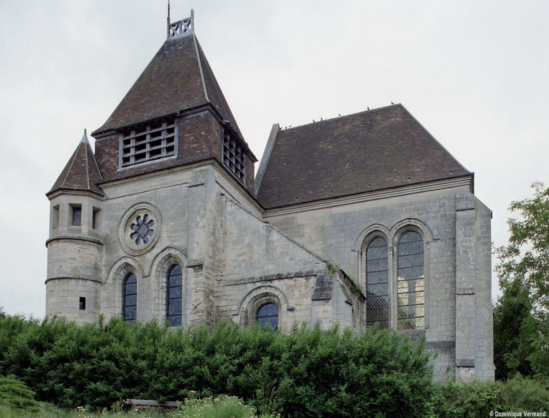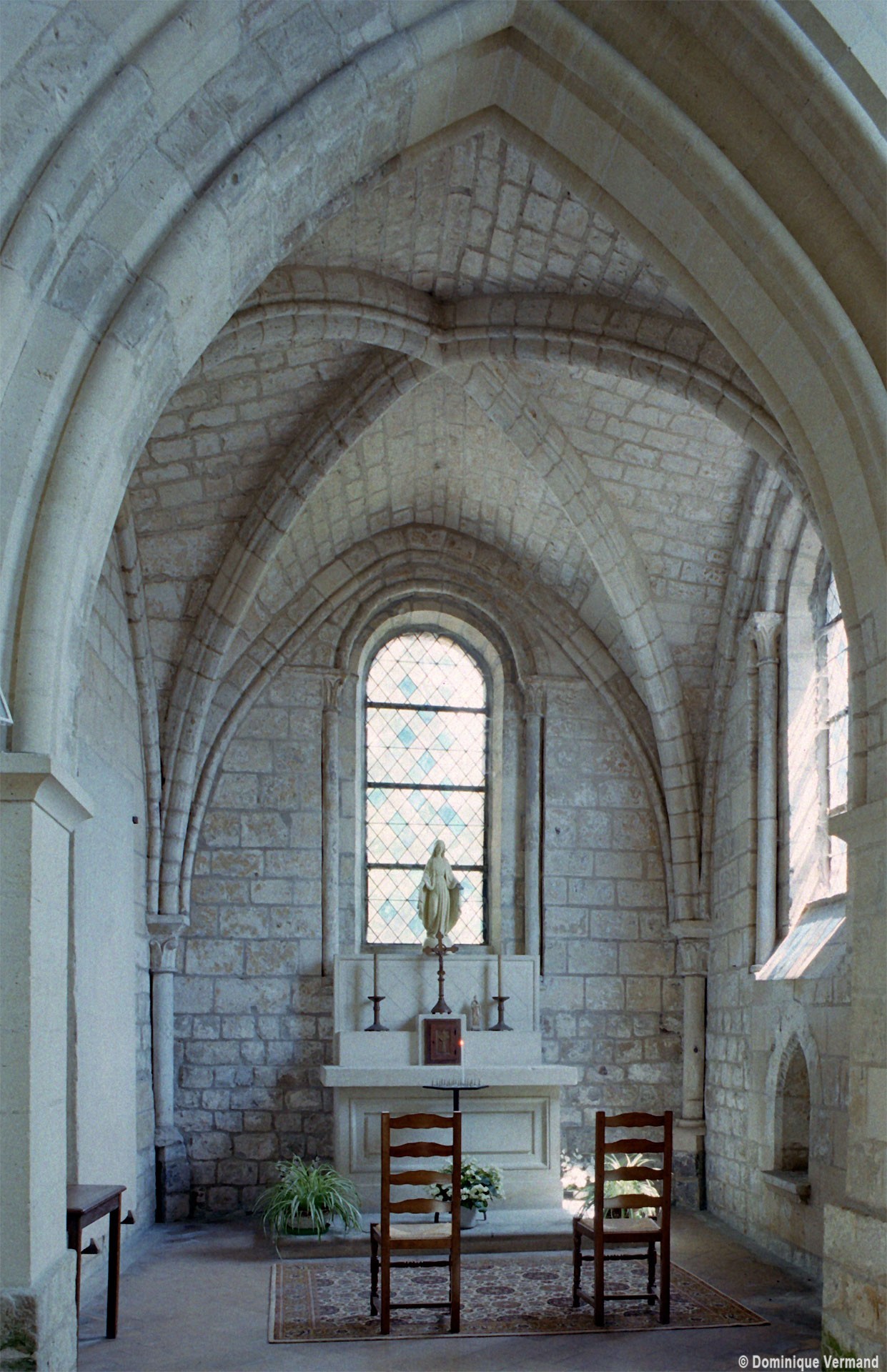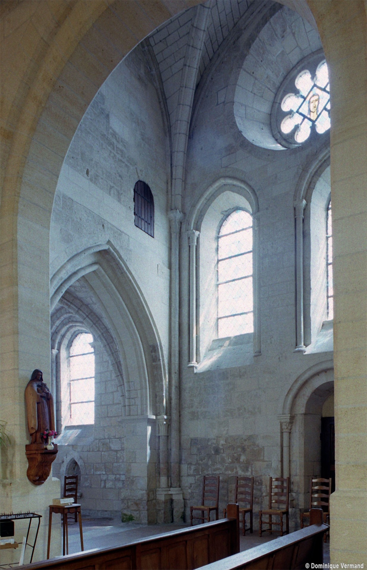 Précédée d’une courte nef refaite et autrefois réservée à la paroisse sous le titre de saint Nicolas, la partie correspondant au prieuré comprend un faux transept sur les bras duquel se greffent deux chapelles carrées, et un choeur à chevet plat formé de deux travées. Le clocher est assis sur le bras méridional du faux-transept, éclairé au sud par deux fenêtres surmontées d’une petite rose. Une tourelle d’escalier d’origine donne accès à l’étage du beffroi, refait dans les années 1920. Les chapelles – celle du nord a été rebâtie à l’identique – sont voûtées d’ogives retombant sur des chapiteaux à crochets. Leurs fenêtres, comme celles des bras du faux-transept, ont leur piédroit garni de colonnettes en délit.