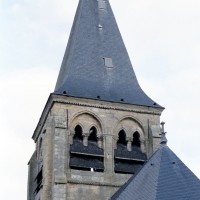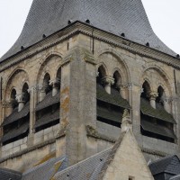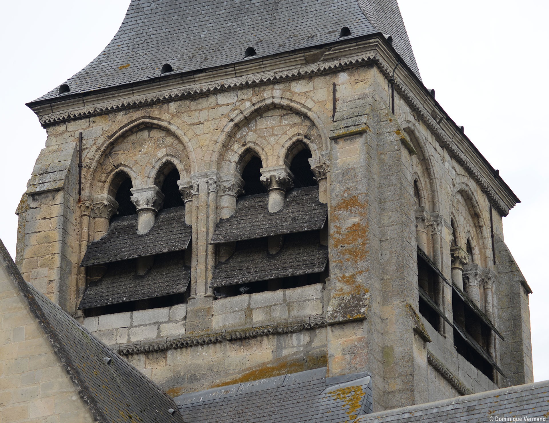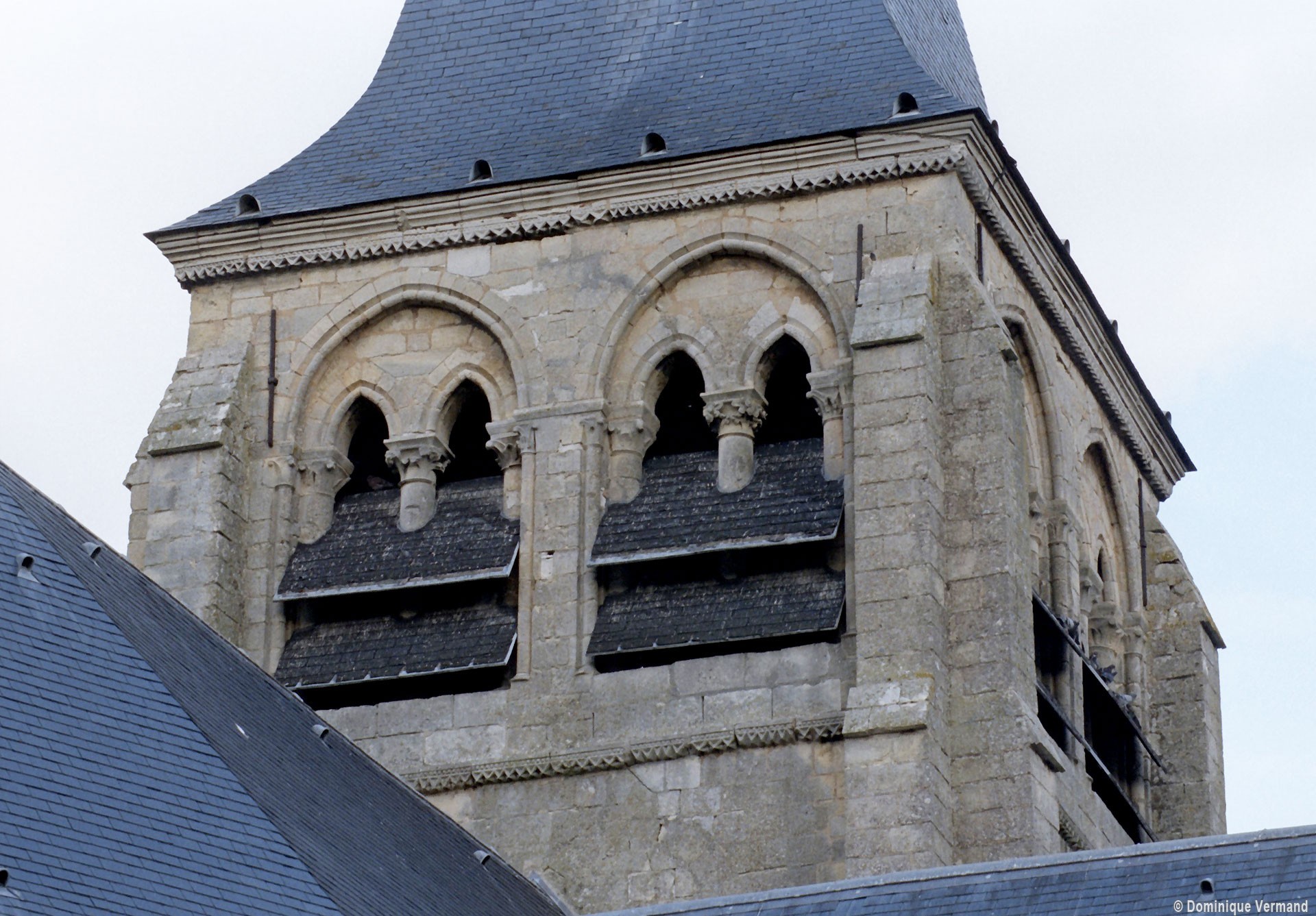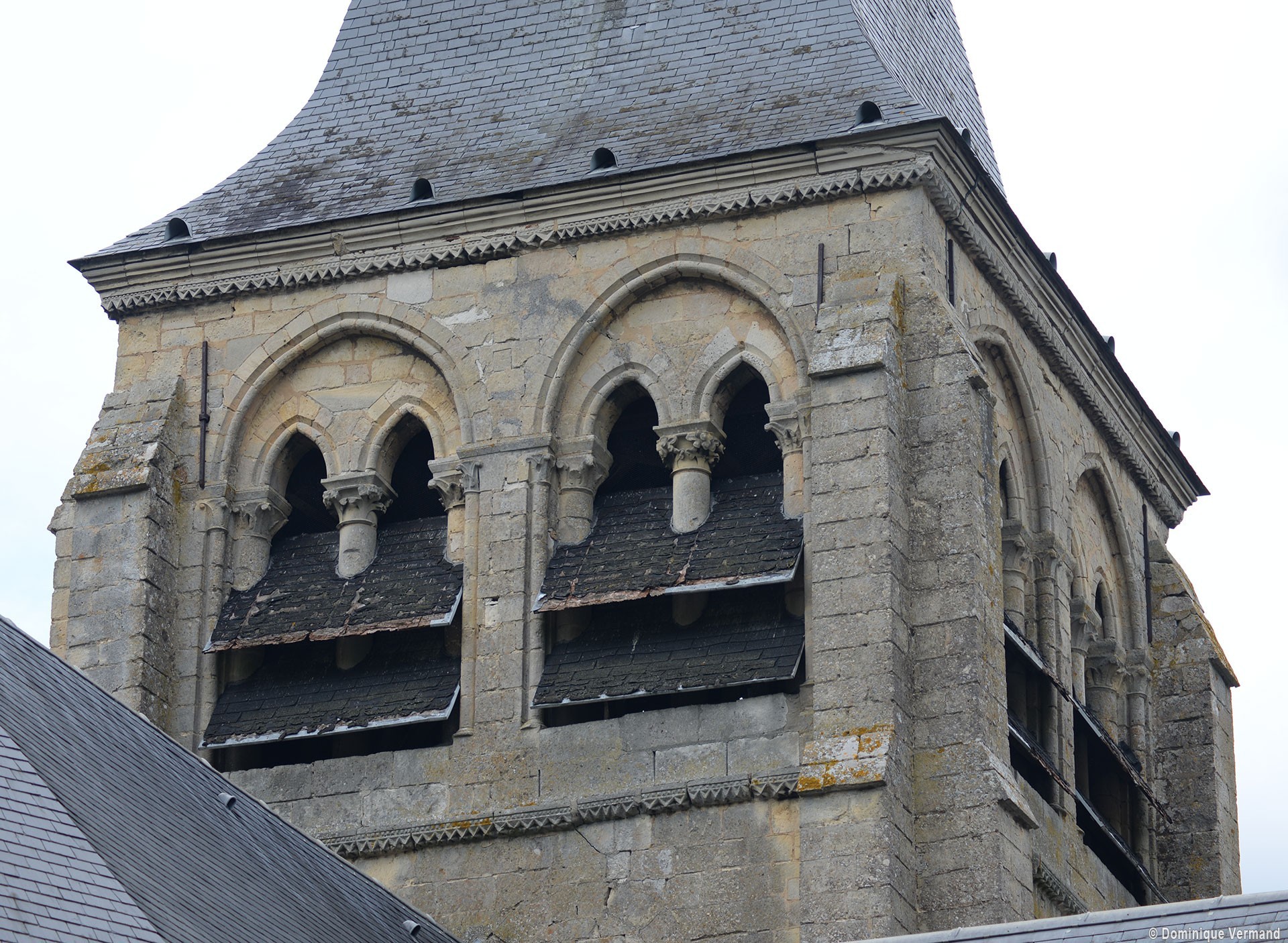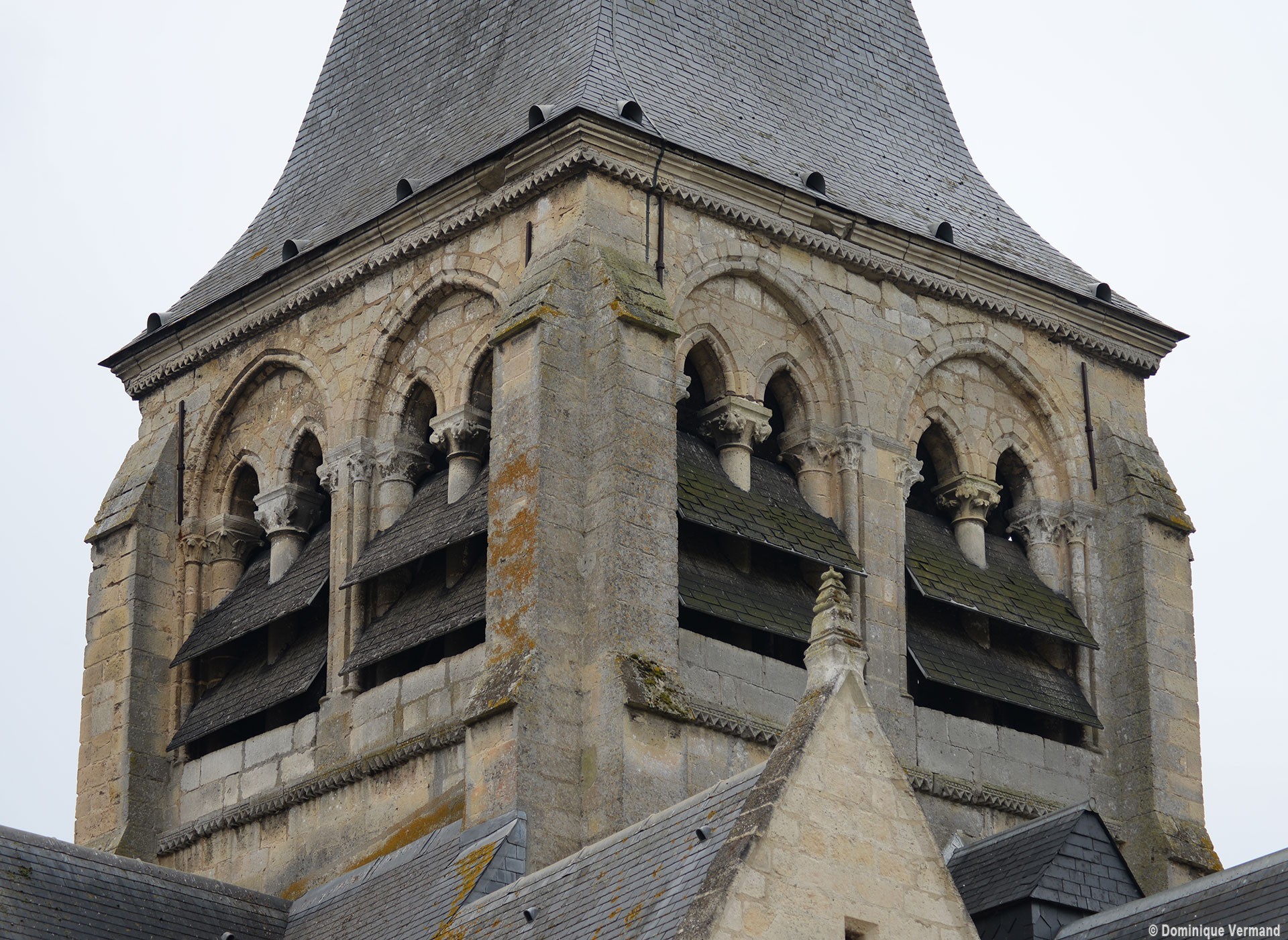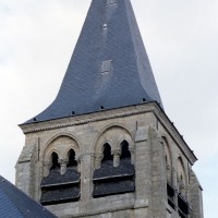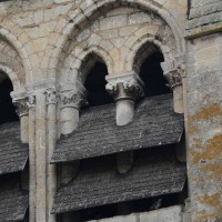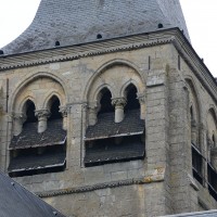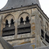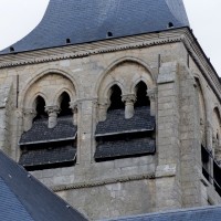 A l’extérieur, c’est bien sûr le puissant clocher qui attire l’attention. Ses grandes dimensions, dictées par la croisée sur laquelle il repose, lui permettent d’accueillir deux larges baies, recoupées par une colonnette, sur chaque côté. La plupart des chapiteaux sont cohérents avec ceux de la croisée et permettent de le situer dans le dernier quart du 12ème siècle. D’autres paraissent du 13ème siècle mais leur authenticité n’est pas certaine. Une frise décorée de fleurs de voilettes encadre horizontalement ces baies. L’actuelle flèche en charpente recouverte d’ardoise qui le couvre a remplacé une toiture en bâtière, telle qu’on en voit encore une à Breuil-le-Vert (2020).