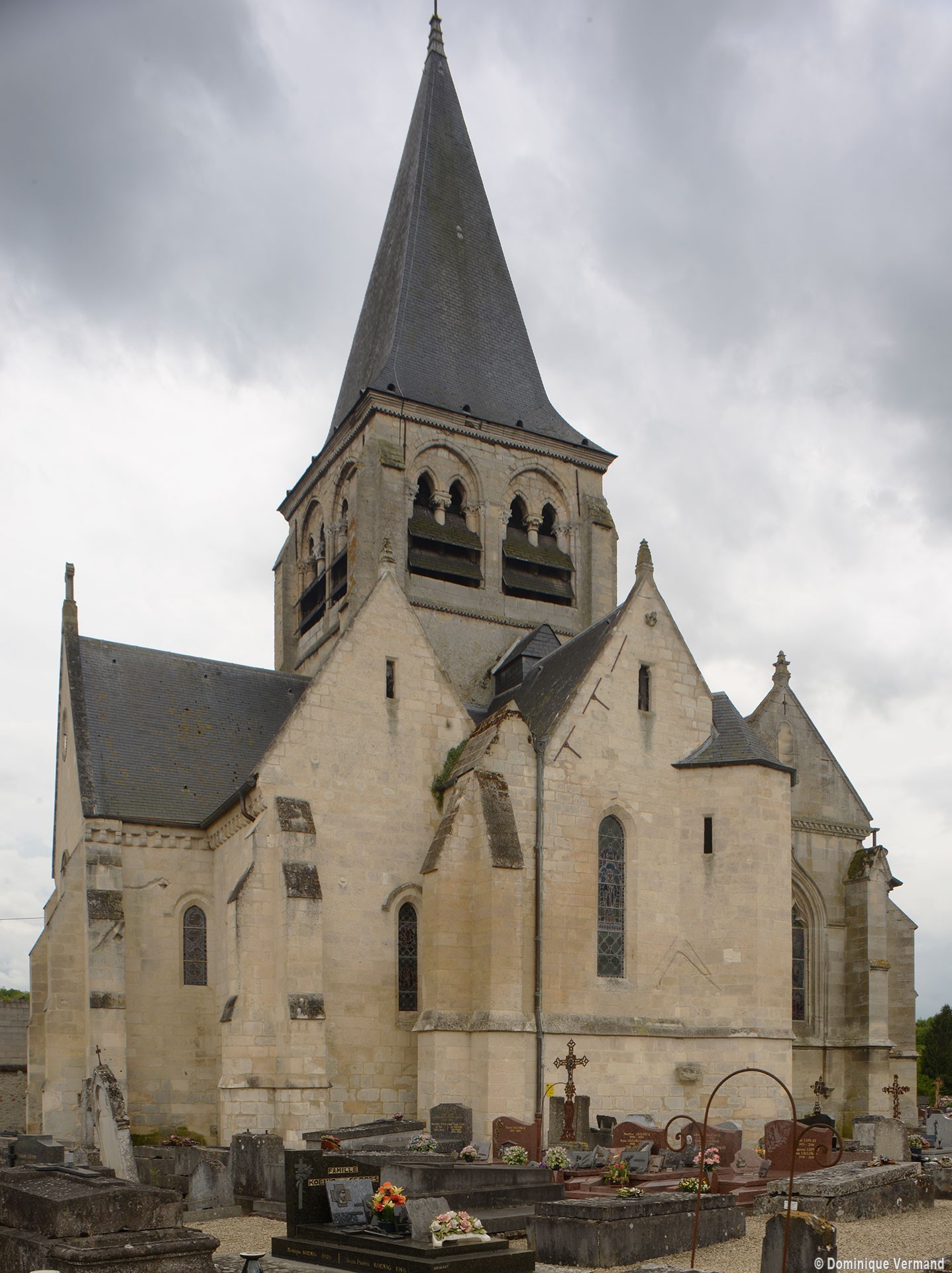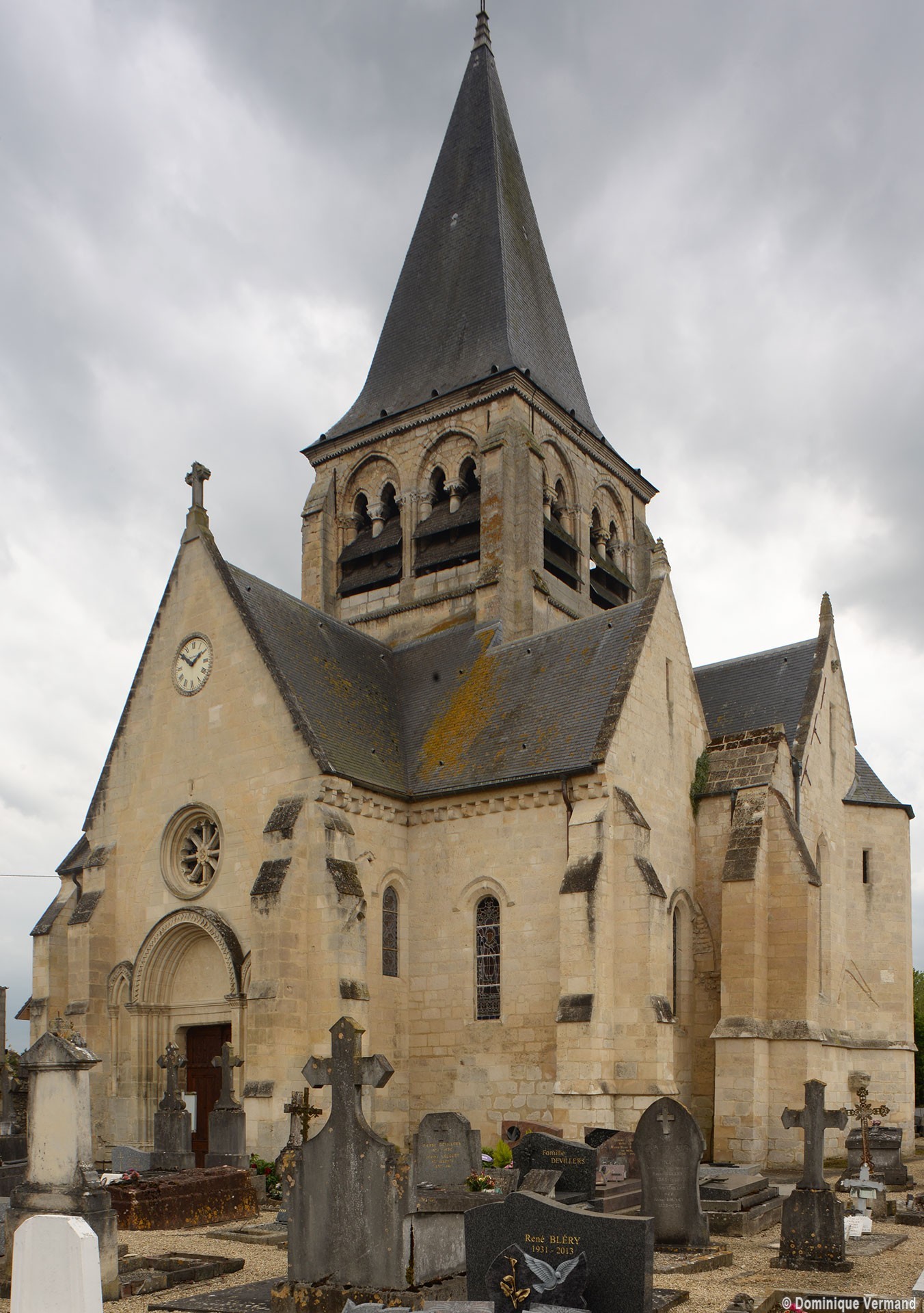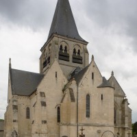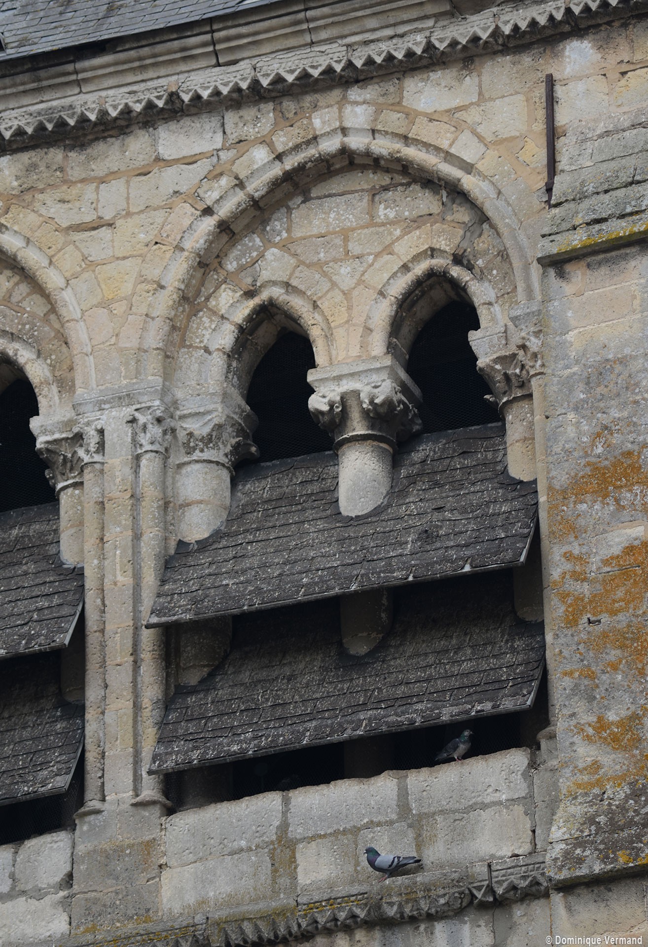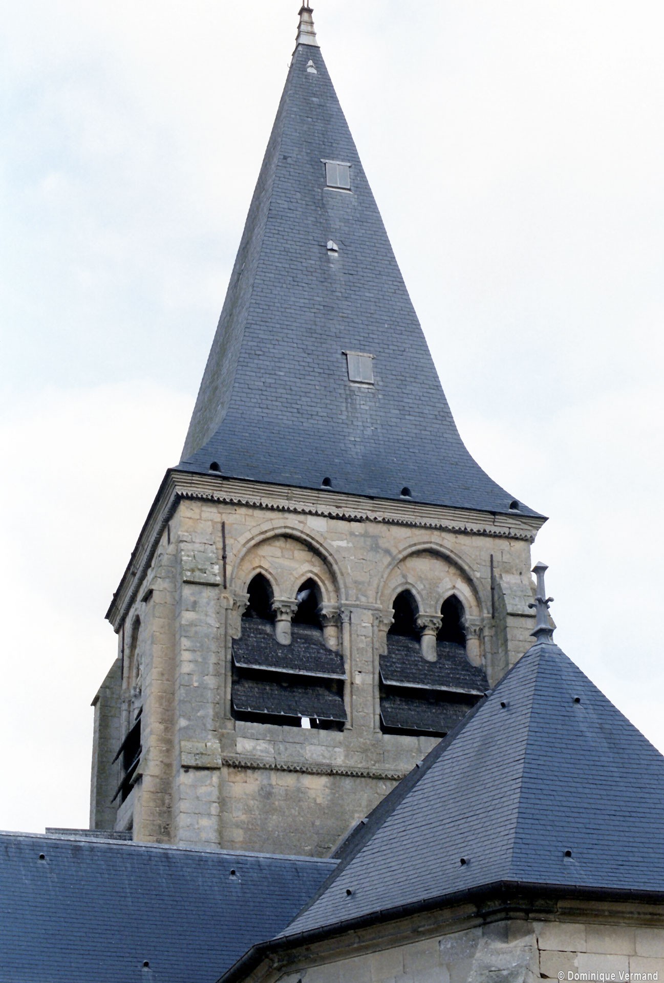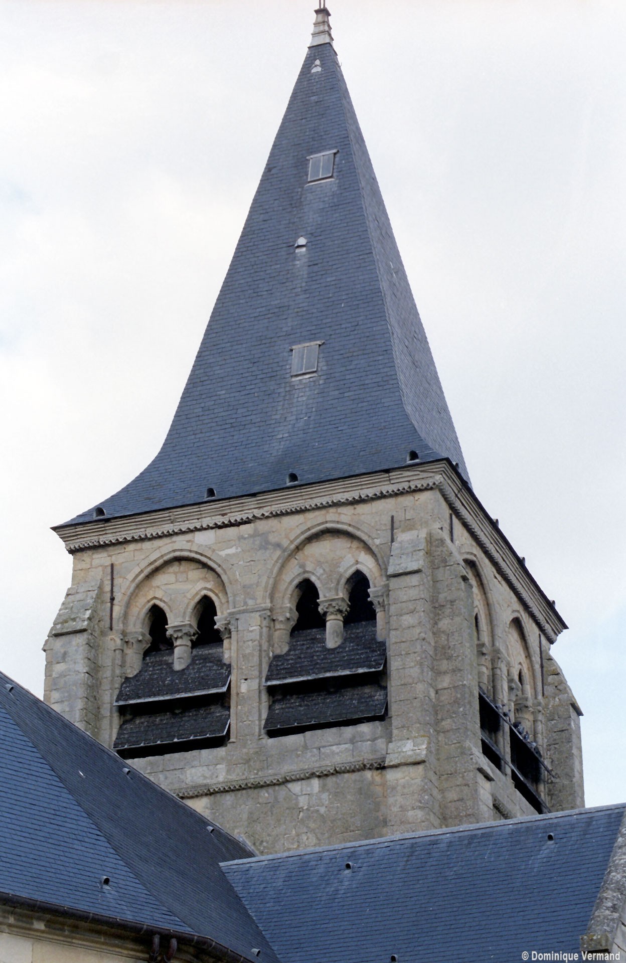 A l’extérieur, c’est bien sûr le puissant clocher qui attire l’attention. Ses grandes dimensions, dictées par la croisée sur laquelle il repose, lui permettent d’accueillir deux larges baies, recoupées par une colonnette, sur chaque côté. La plupart des chapiteaux sont cohérents avec ceux de la croisée et permettent de le situer dans le dernier quart du 12ème siècle. D’autres paraissent du 13ème siècle mais leur authenticité n’est pas certaine. Une frise décorée de fleurs de voilettes encadre horizontalement ces baies. L’actuelle flèche en charpente recouverte d’ardoise qui le couvre a remplacé une toiture en bâtière, telle qu’on en voit encore une à Breuil-le-Vert (2020).
