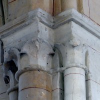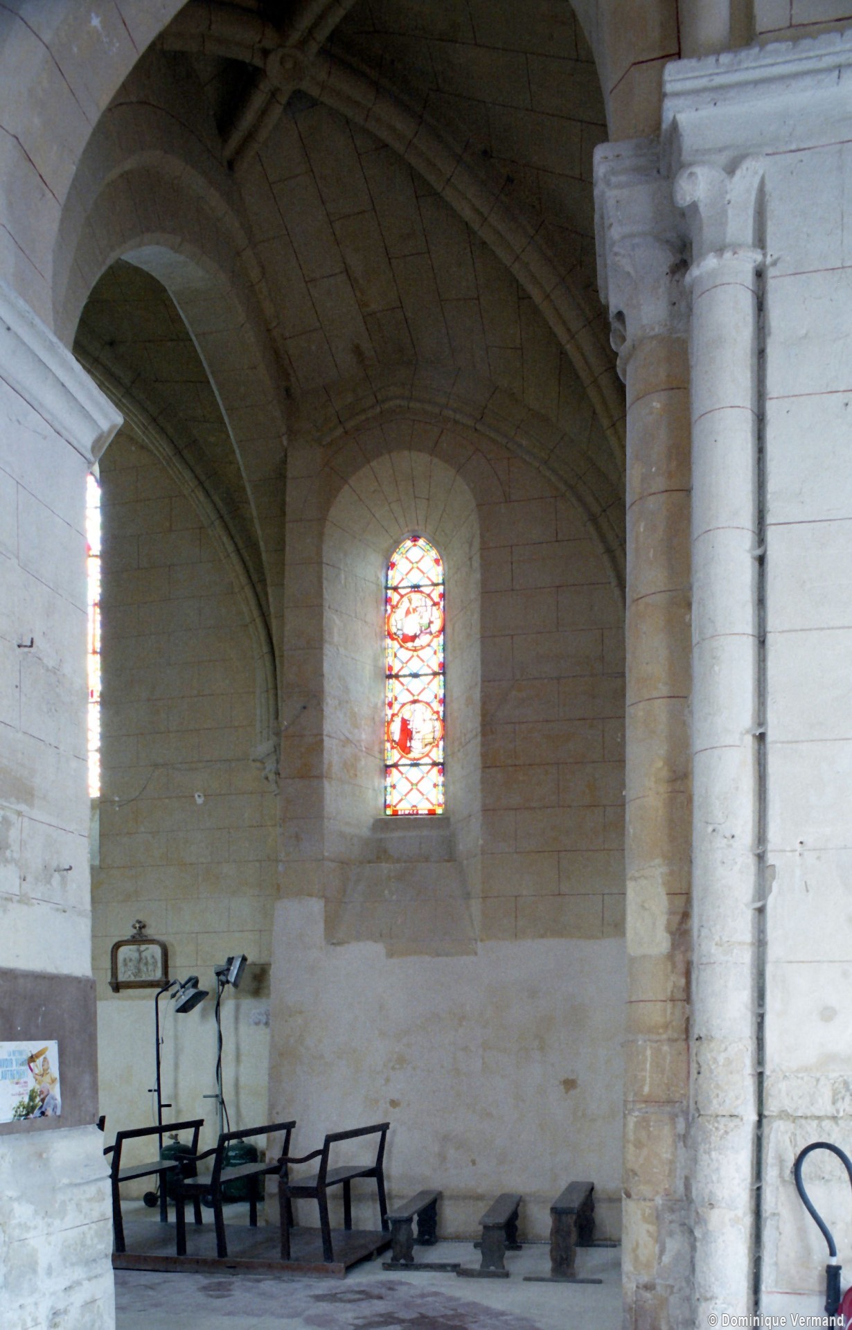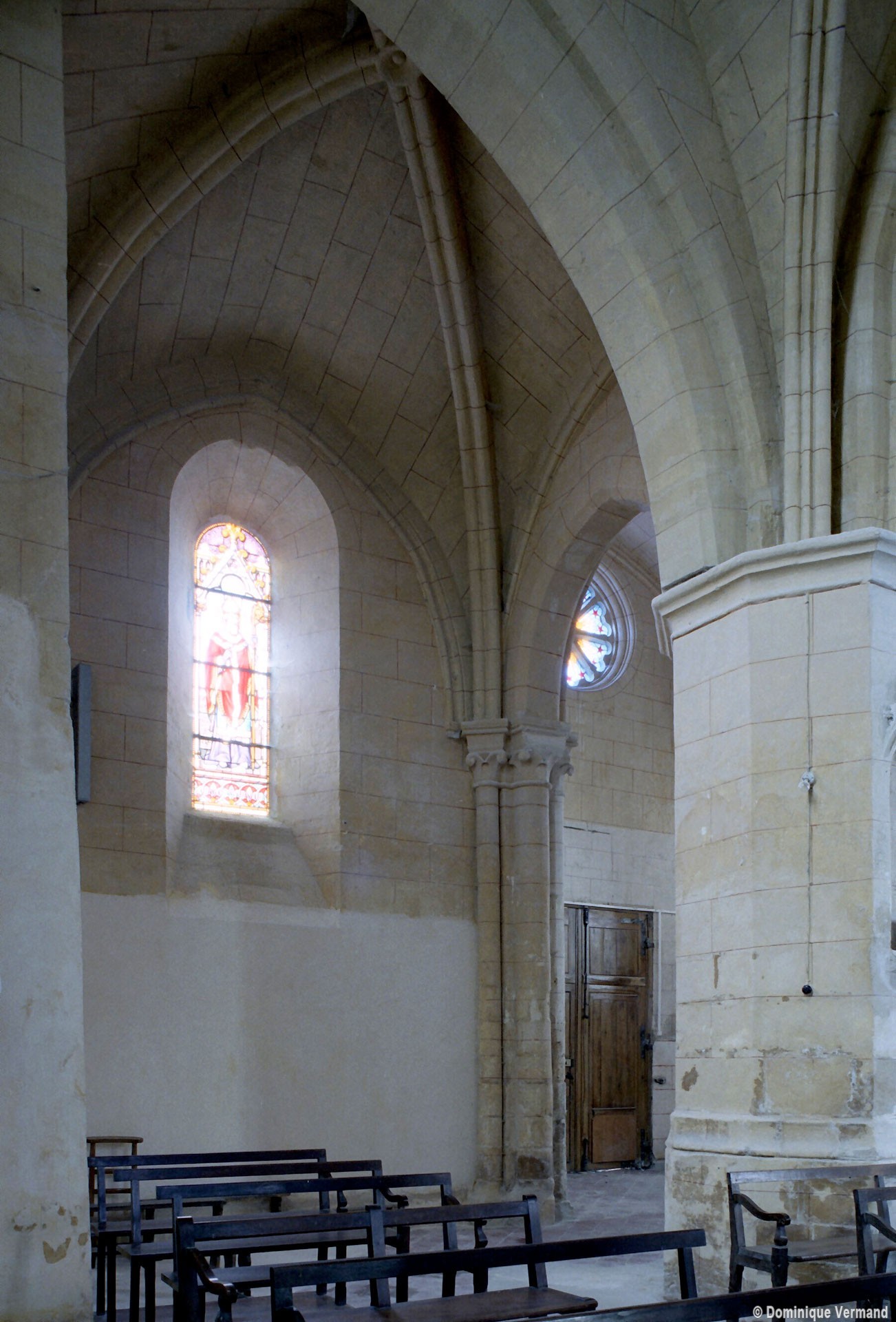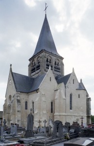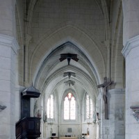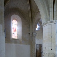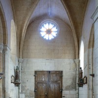 La compréhension de la longue histoire monumentale de l’édifice passe nécessairement par une approche chronologique qui permet, après la nef disparue, d’identifier tout d’abord l’ancien chœur à chevet plat (devenu nef avec son portail percé au 19ème siècle) et la chapelle carrée qui le flanque au nord. Le profil des ogives – une arête entre deux tores – et le décor des chapiteaux, où ne s’affirme pas encore complètement le crochet gothique, plaident pour une date vers 1170/80. Ce que confirme, à l’extérieur, les étroites fenêtres au tracé brisé souligné par une moulure simplement biseautée et la corniche profilée en quart-de-rond qui rappelle curieusement les modèles bourguignons mais que l’on retrouve à Montépilloy. Le percement du portail a malheureusement fait disparaître une grande fenêtre de style gothique rayonnant, percée après-coup.
