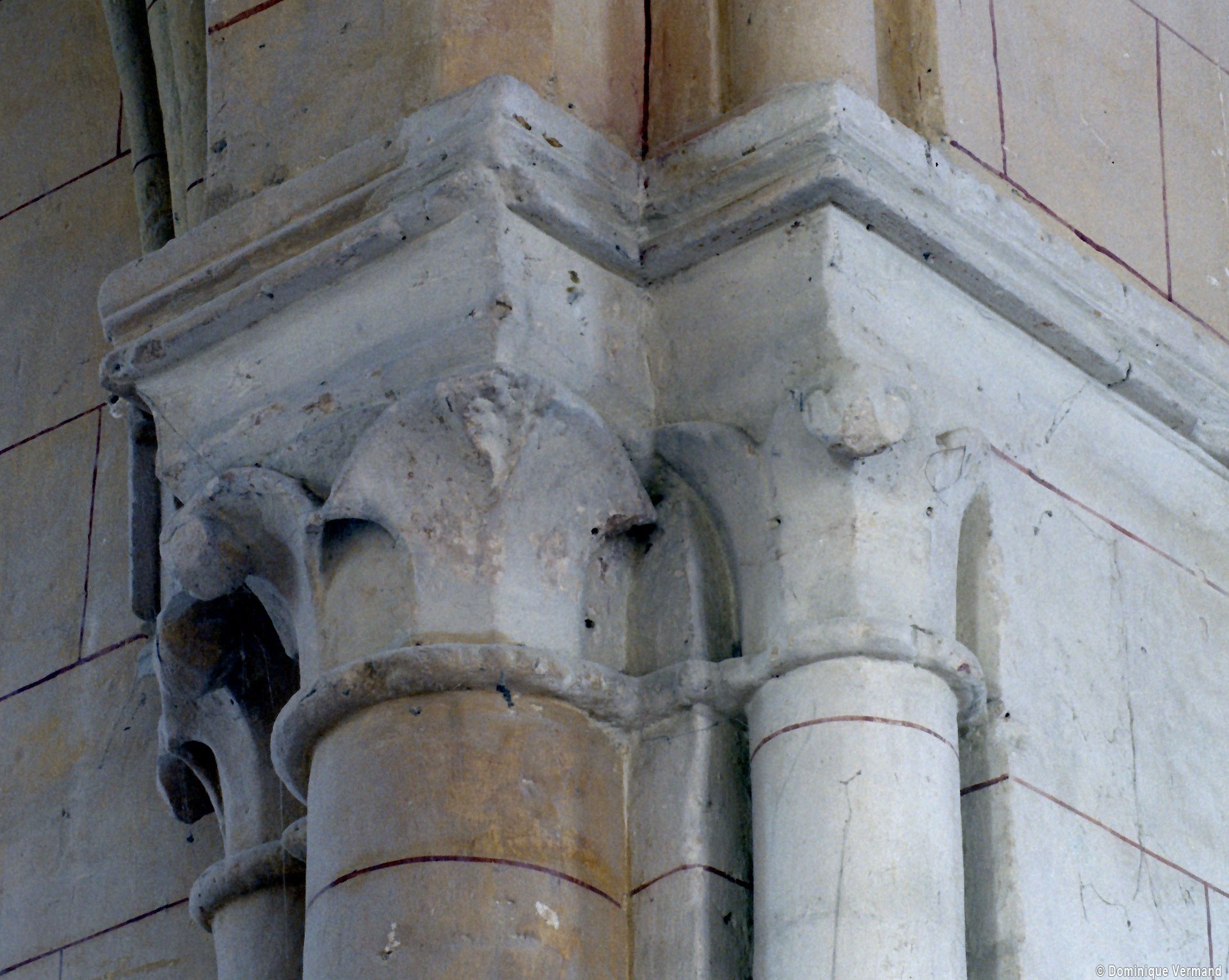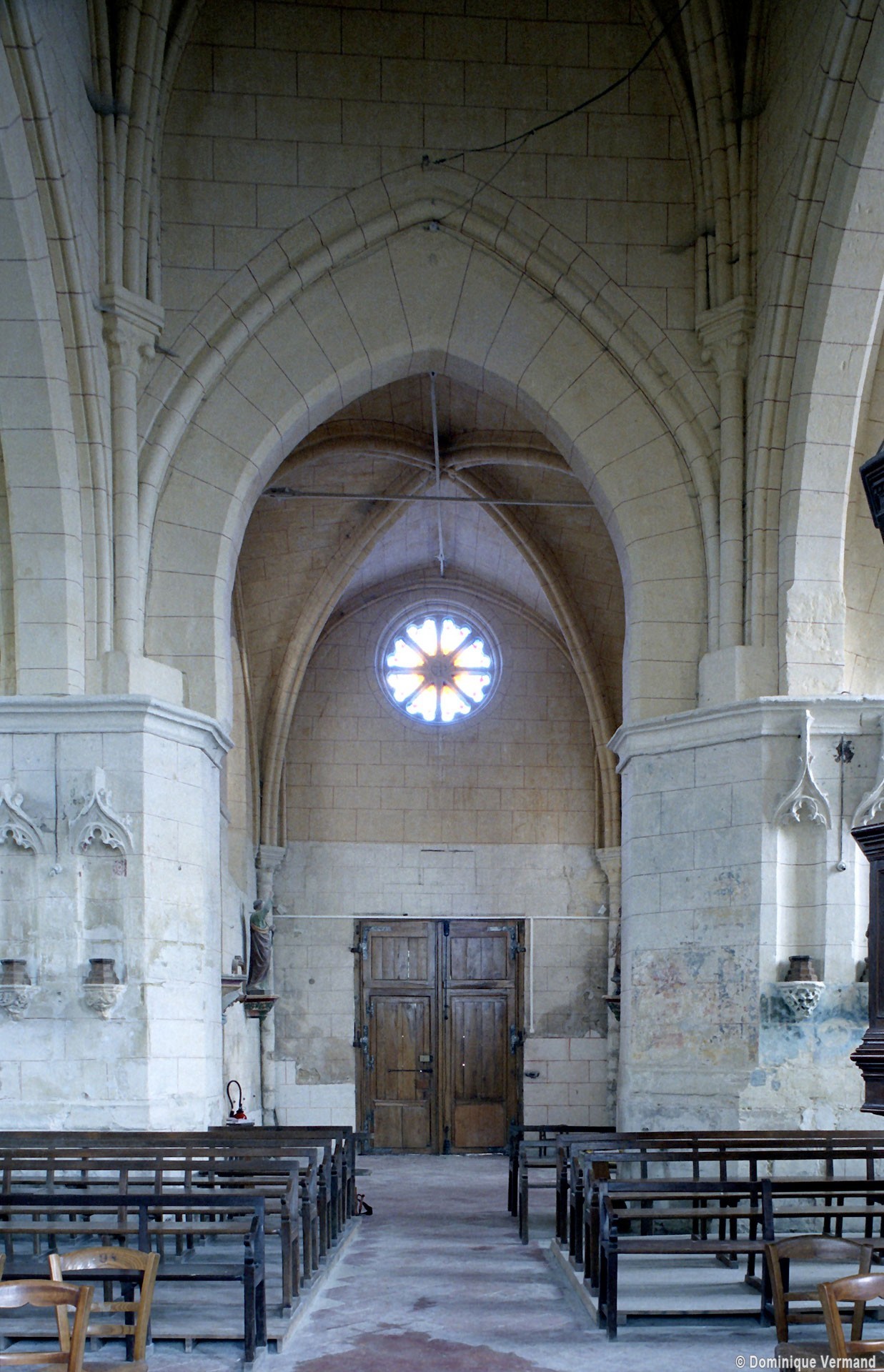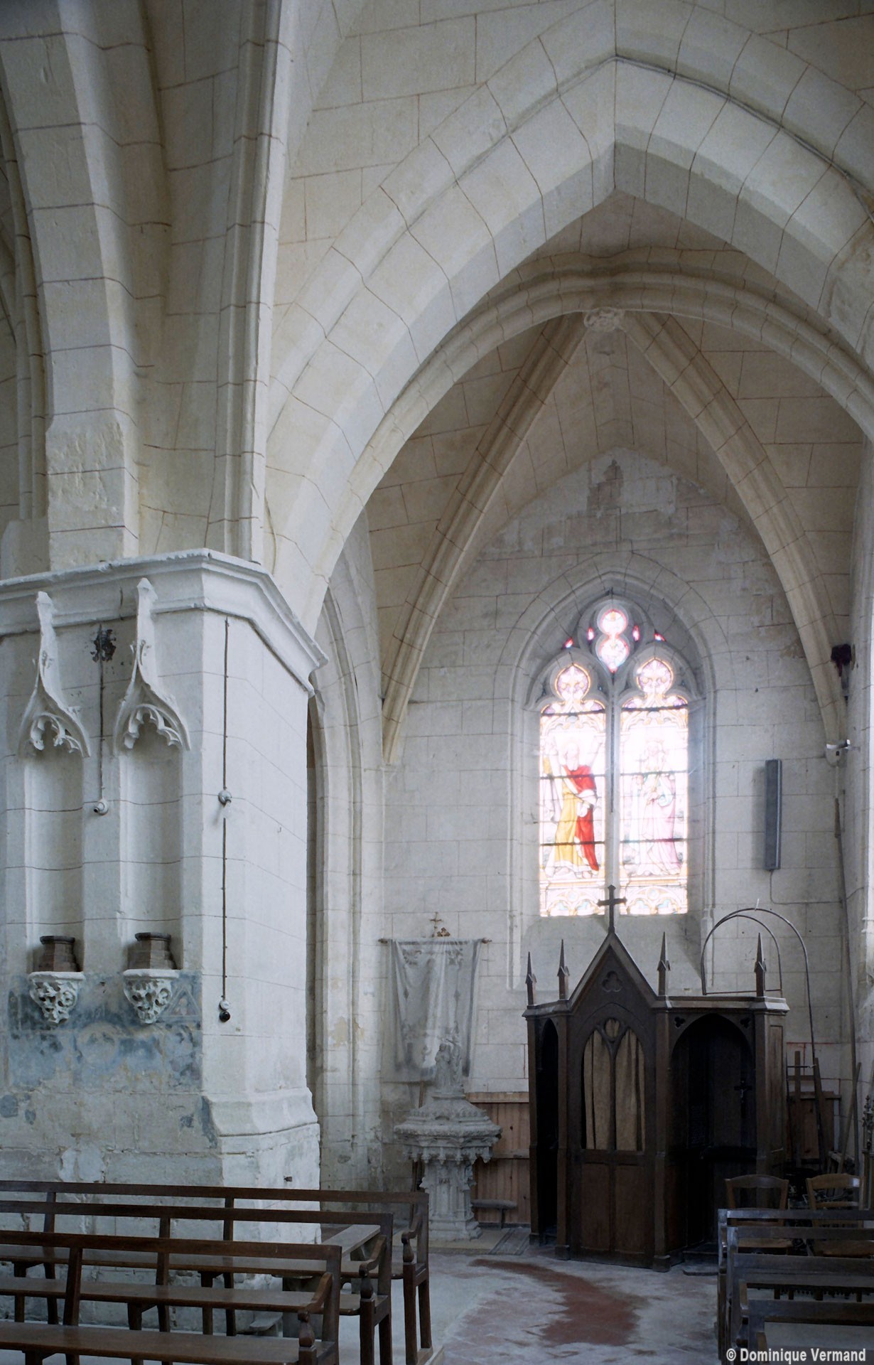 La compréhension de la longue histoire monumentale de l’édifice passe nécessairement par une approche chronologique qui permet, après la nef disparue, d’identifier tout d’abord l’ancien chœur à chevet plat (devenu nef avec son portail percé au 19ème siècle) et la chapelle carrée qui le flanque au nord. Le profil des ogives – une arête entre deux tores – et le décor des chapiteaux, où ne s’affirme pas encore complètement le crochet gothique, plaident pour une date vers 1170/80. Ce que confirme, à l’extérieur, les étroites fenêtres au tracé brisé souligné par une moulure simplement biseautée et la corniche profilée en quart-de-rond qui rappelle curieusement les modèles bourguignons mais que l’on retrouve à Montépilloy. Le percement du portail a malheureusement fait disparaître une grande fenêtre de style gothique rayonnant, percée après-coup.