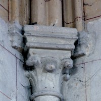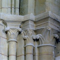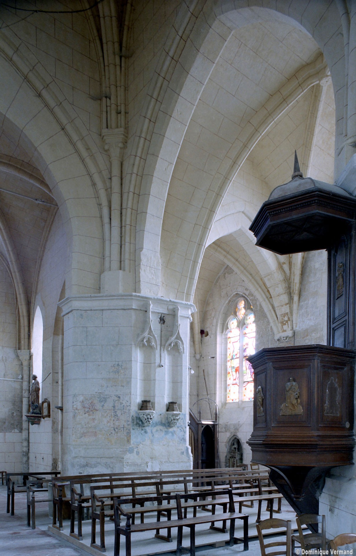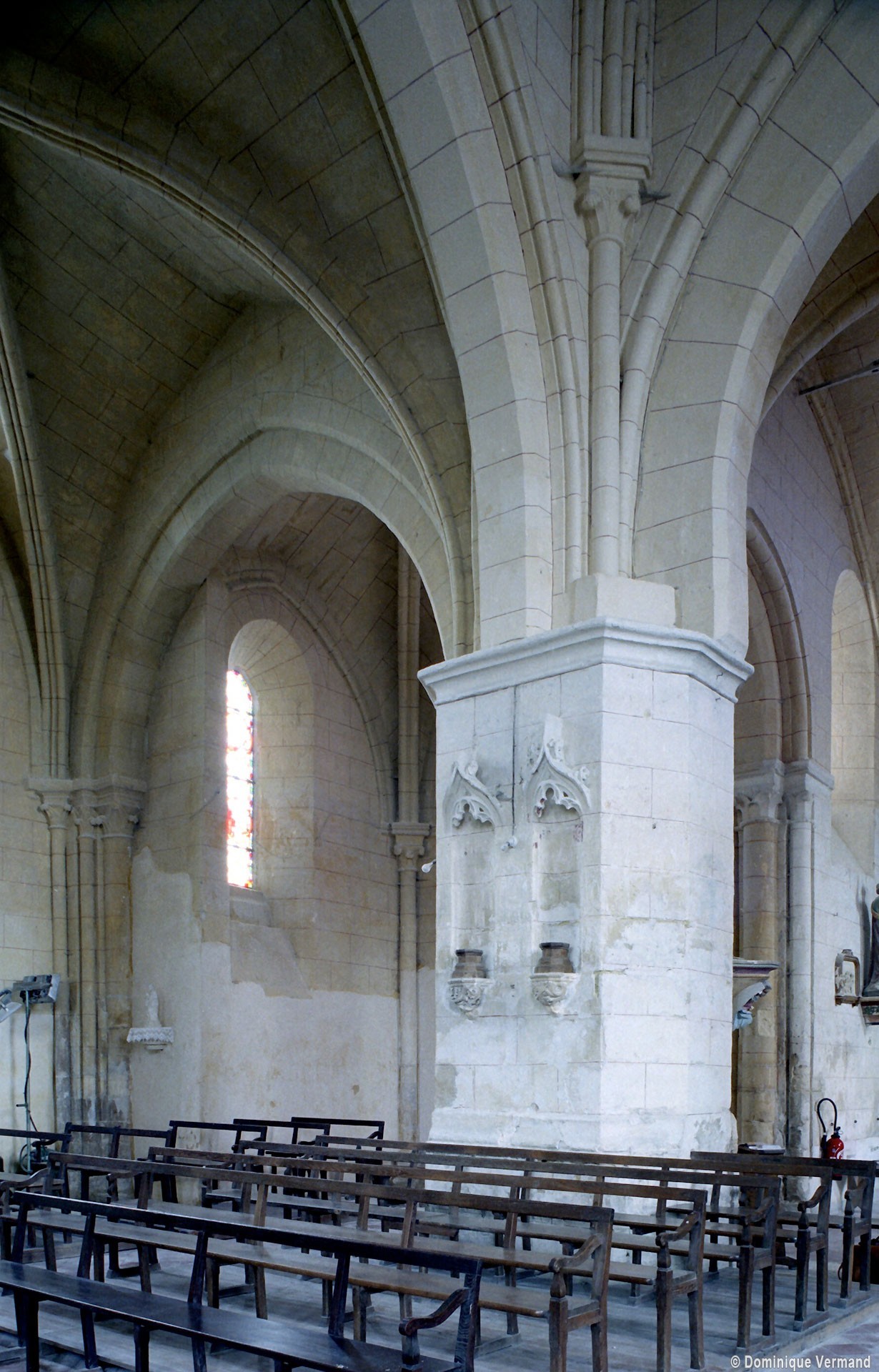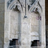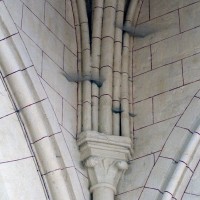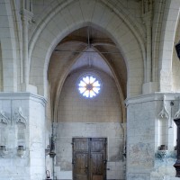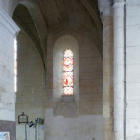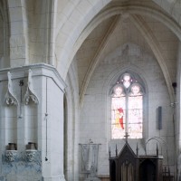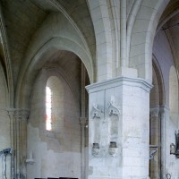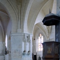 La chronologie appelle ensuite la construction, peu après, de la base du clocher et du bras nord du transept. Si la première – dont la voûte est portée très haut – trouve naturellement sa place immédiatement à l’ouest du chœur, l’alignement du bras nord du transept sur celle-ci a déterminé un raccourcissement de la chapelle nord qui apparaît notamment dans sa voûte tronquée. Le profil des ogives est légèrement différent et les chapiteaux y affirment davantage le crochet terminé par des boules. Le clocher appartient à cette campagne de travaux mais le renforcement des piles de la croisée, devenues de gros massifs carrés, est à placer aux 15ème/16ème siècles. Les deux piles orientales, à l’entrée de l’ancien chœur et tournées vers l’ouest afin d’être aperçues depuis l’ancienne nef, comportent des doubles niches richement décorées, de style gothique flamboyant, dont les statues ont depuis longtemps disparues.