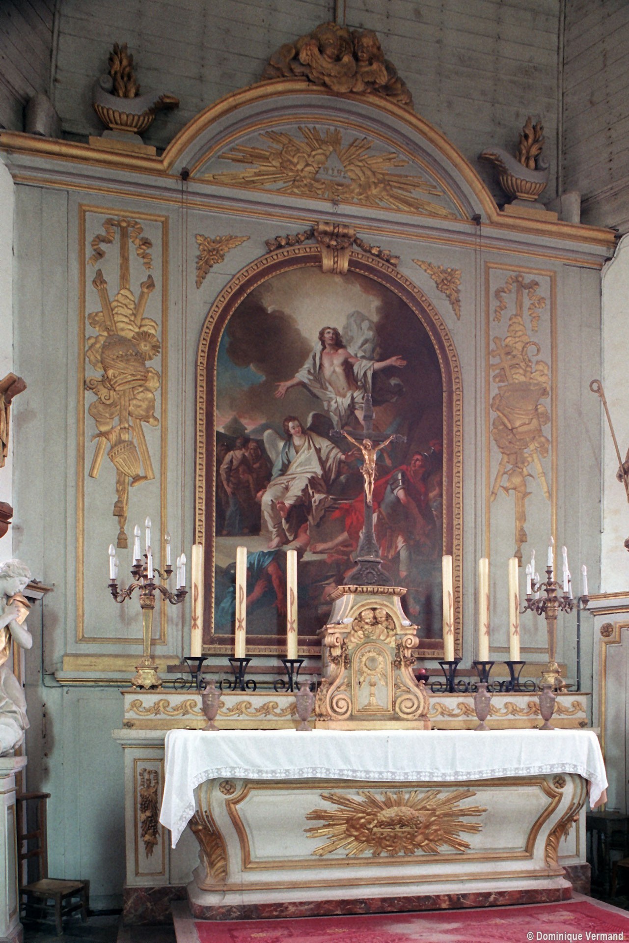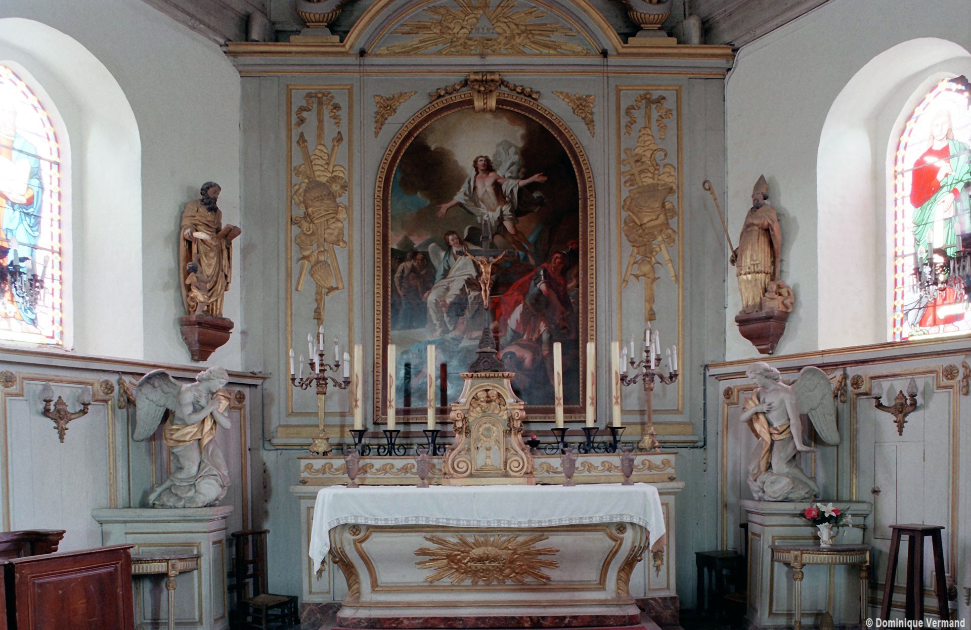 Le choeur abrite un bel ensemble de boiseries dorées du 17ème siècle. Le retable comporte une peinture représentant la Résurrection du Christ et l’autel est encadré par deux anges agenouillés. On remarque encore une Vierge à l’Enfant, en pierre, du 17ème siècle et une chaire à prêcher du 18ème (2007).