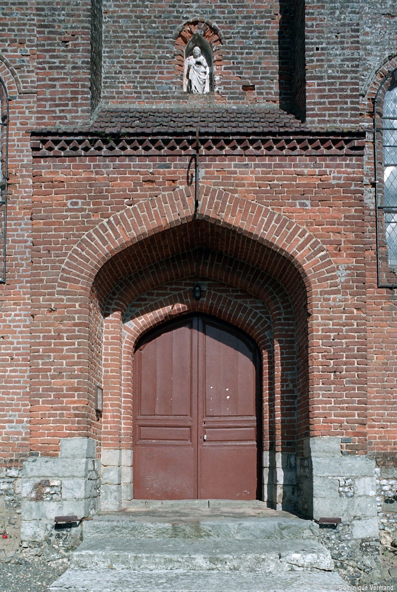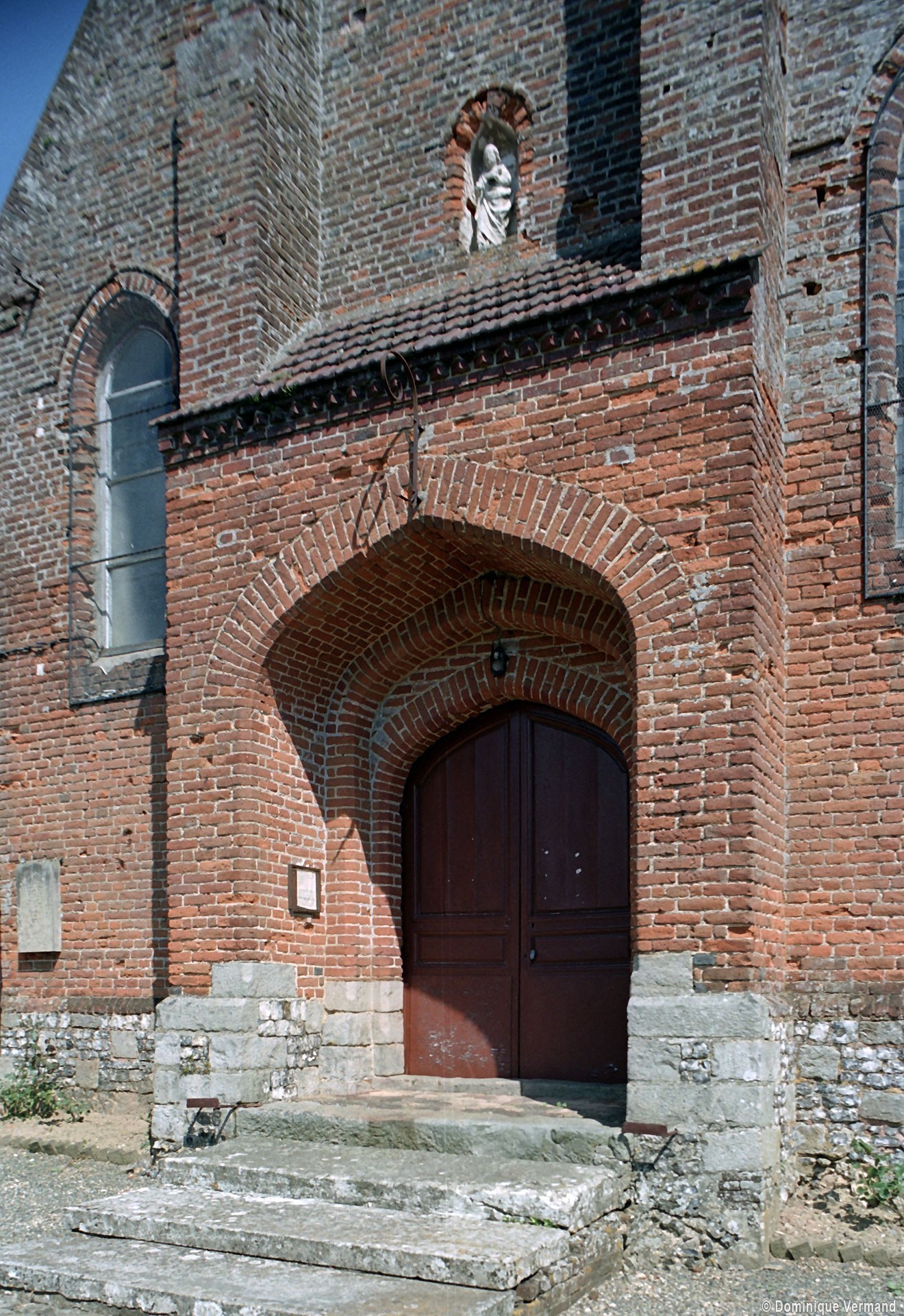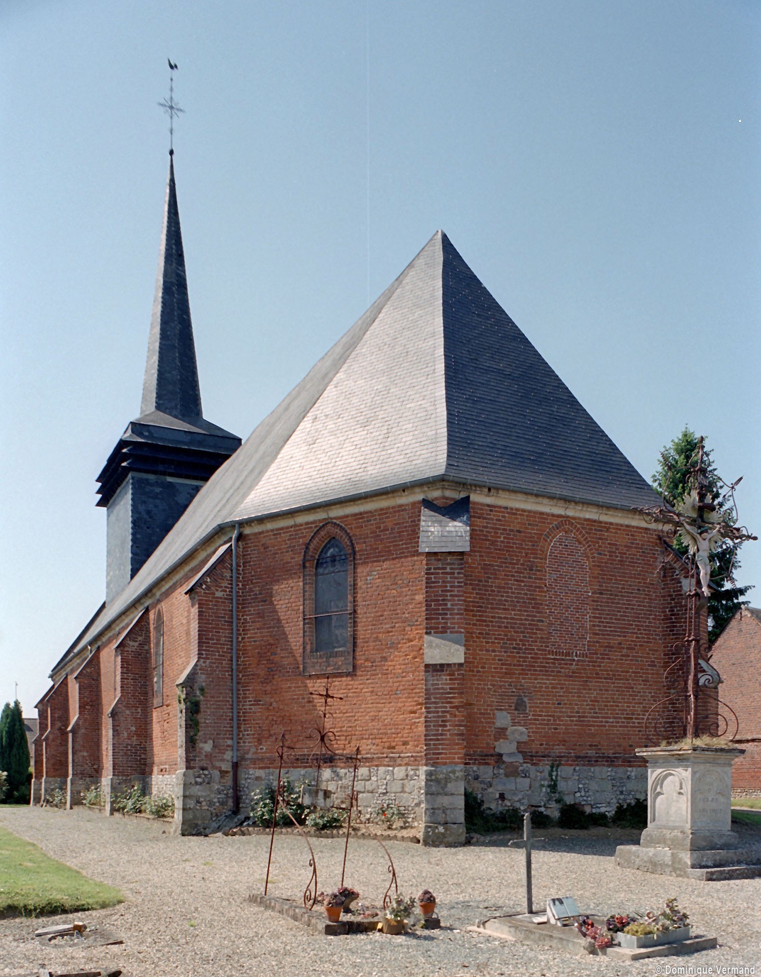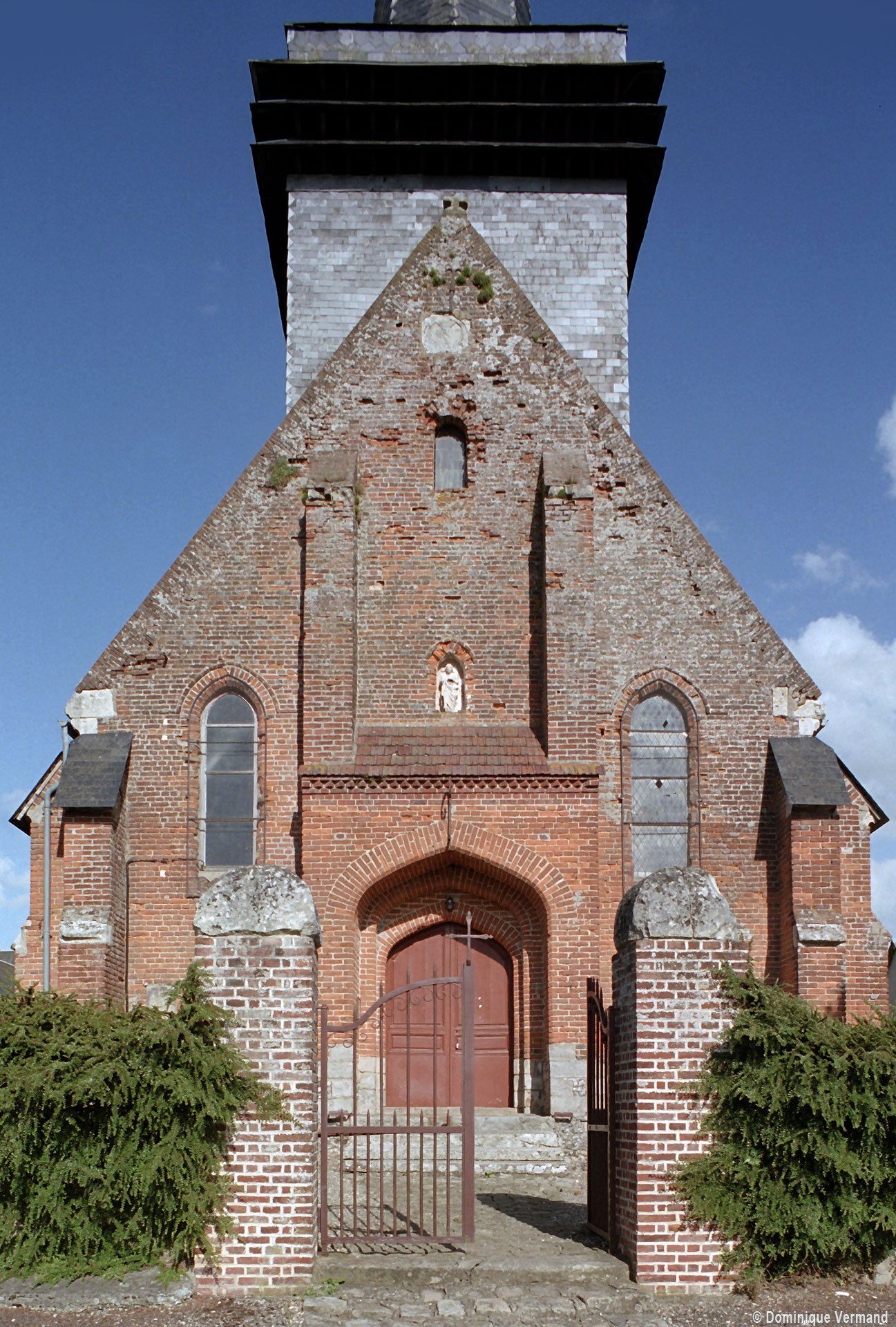 A la nef, que les contreforts et les ouvertures divisent en quatre travées, fait simplement suite une abside à trois côtés. Les murs sont en briques, montées sur un soubassement en damier de grès et de silex. La façade montre une composition intéressante qui se retrouve à Blargies et à Bouvresse. Quatre contreforts l’épaule à intervalles réguliers. Un arc en accolade relie les deux du centre et forme comme un porche peu profond que protège un petit toit en appentis. Le clocher en charpente et ardoise avec flèche octogonale, reconstruit en 1749, domine l’ensemble.