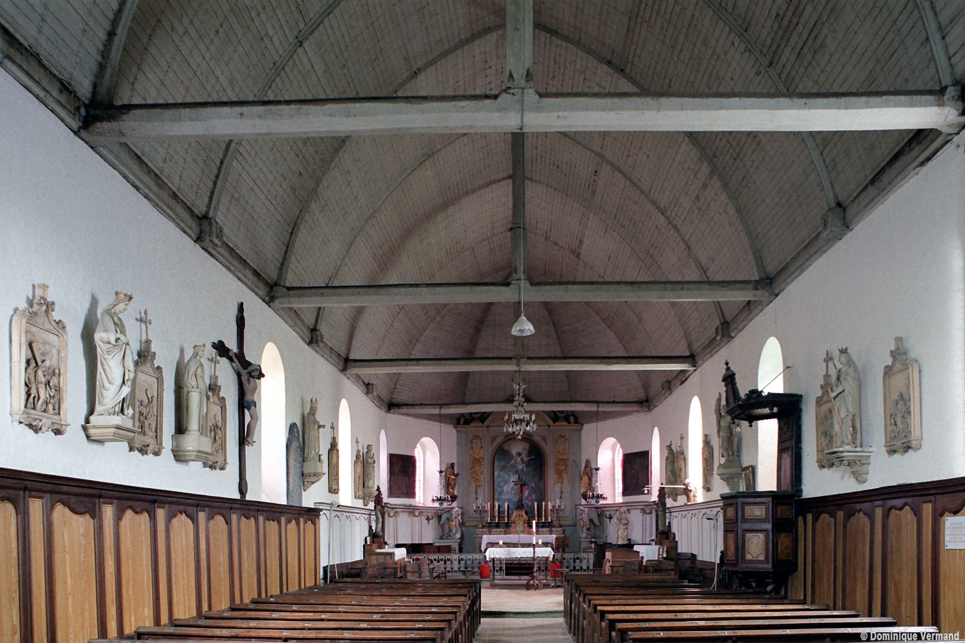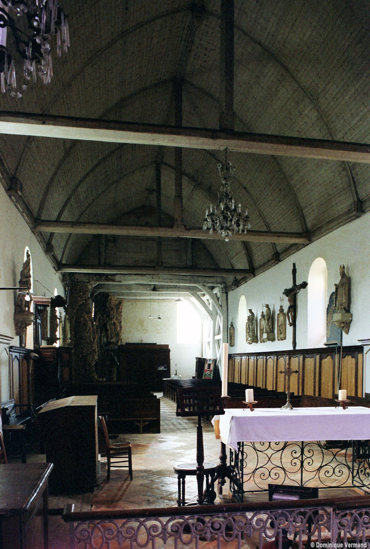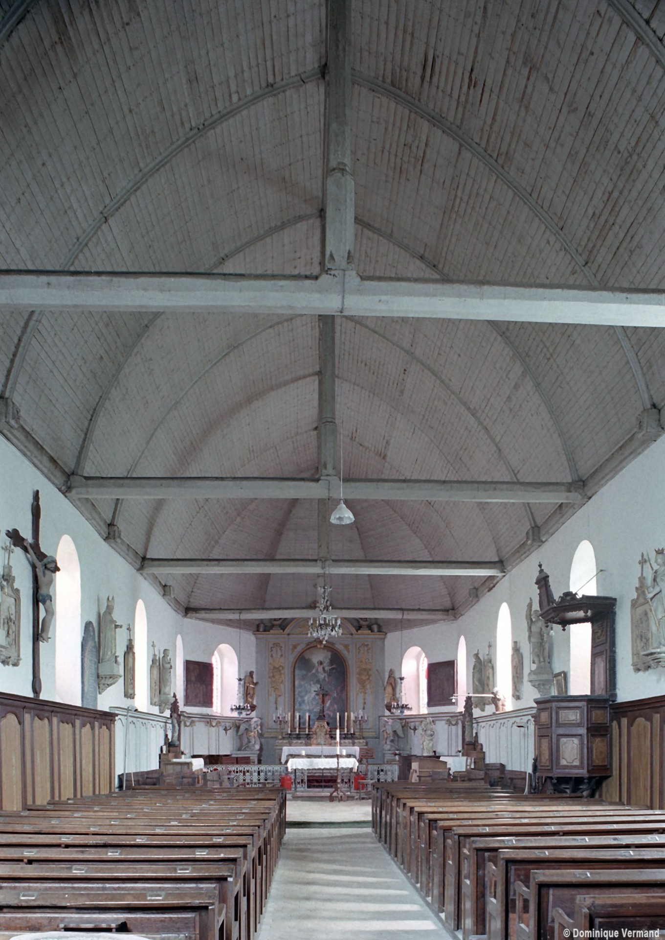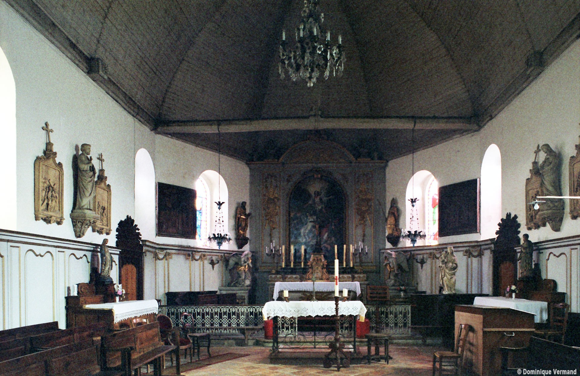 D’une grande homogénéité, l’intérieur est couvert par une belle charpente contemporaine en forme de carène. Des blochets sculptés alternent avec les entraits. A la première travée, une structure en bois indépendante des murs soutient le clocher selon une formule alors couramment utilisée.