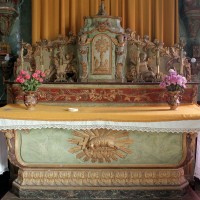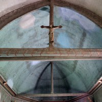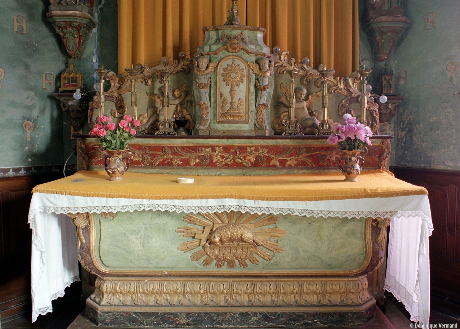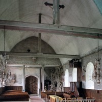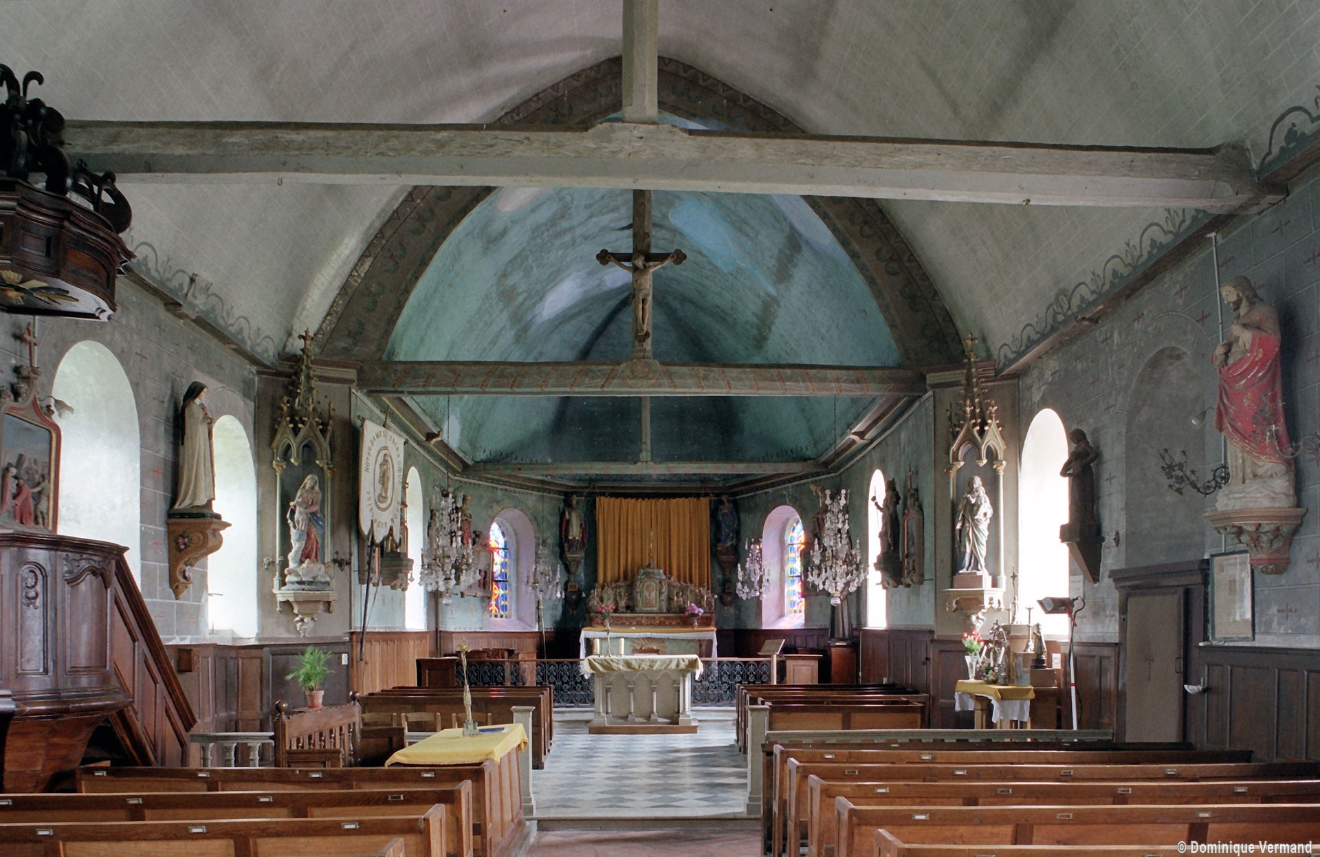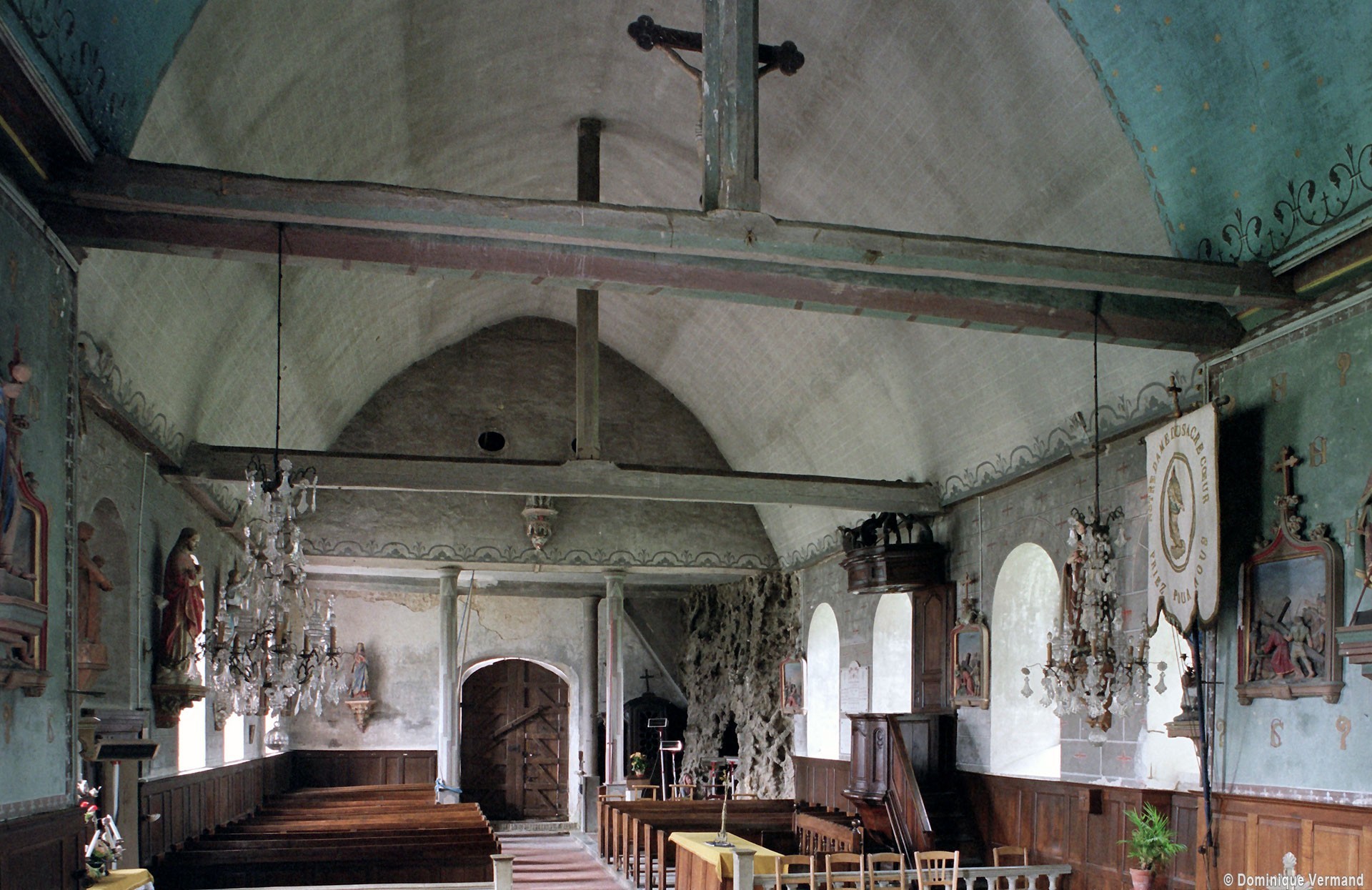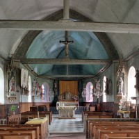 L’intérieur, redécoré au 19ème siècle, n’offre rien de remarquable hormis la charpente en carène du choeur, bien conservée et dont le premier poinçon reçoit un Christ en croix selon le principe des poutres de gloire. Au revers de la façade, une structure en bois soutient le clocher en charpente et ardoises. Le mobilier comprend un bel autel Louis XV richement décoré – le retable n’existe plus – et une statue en pierre du 16ème siècle représentant la Trinité (2007).