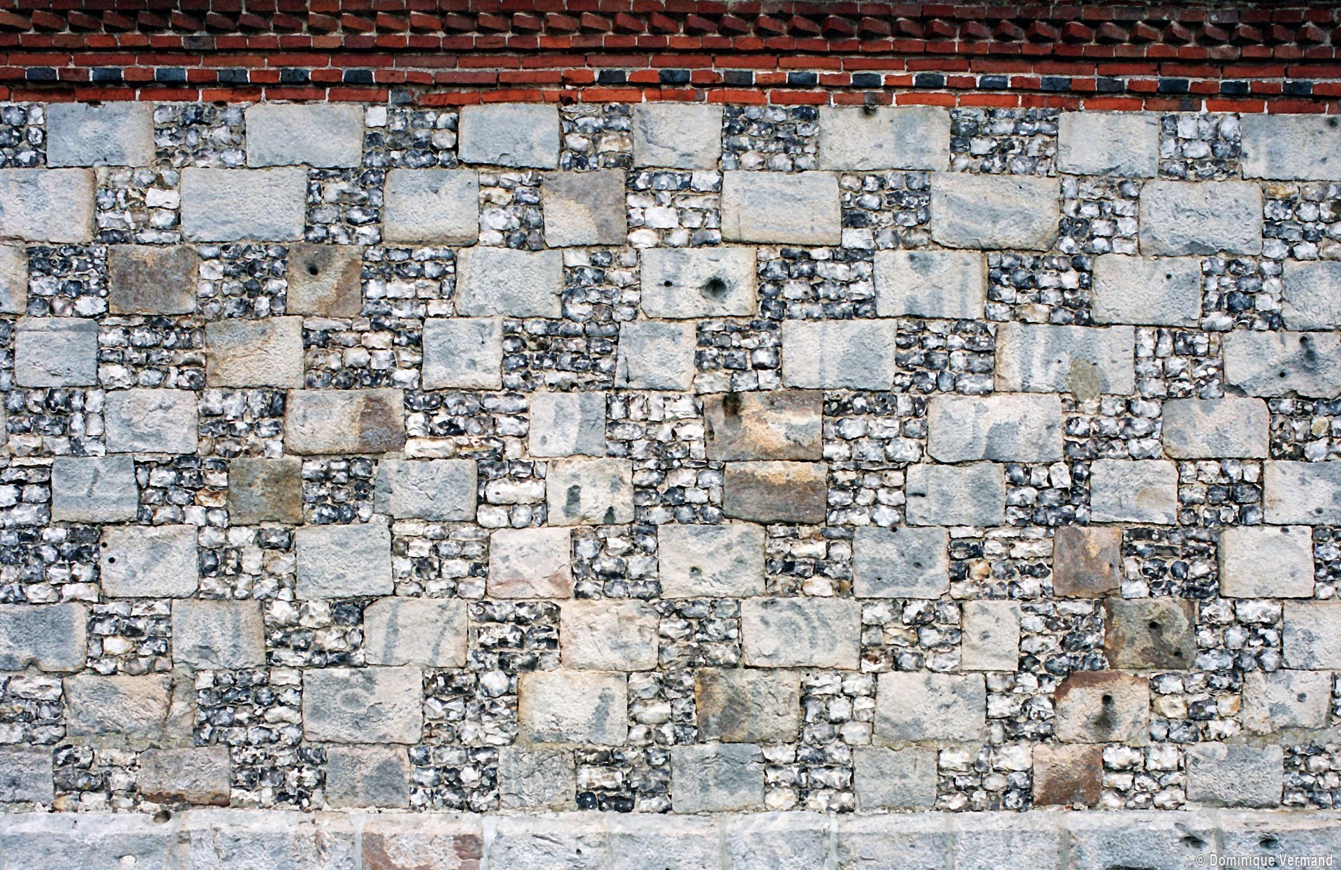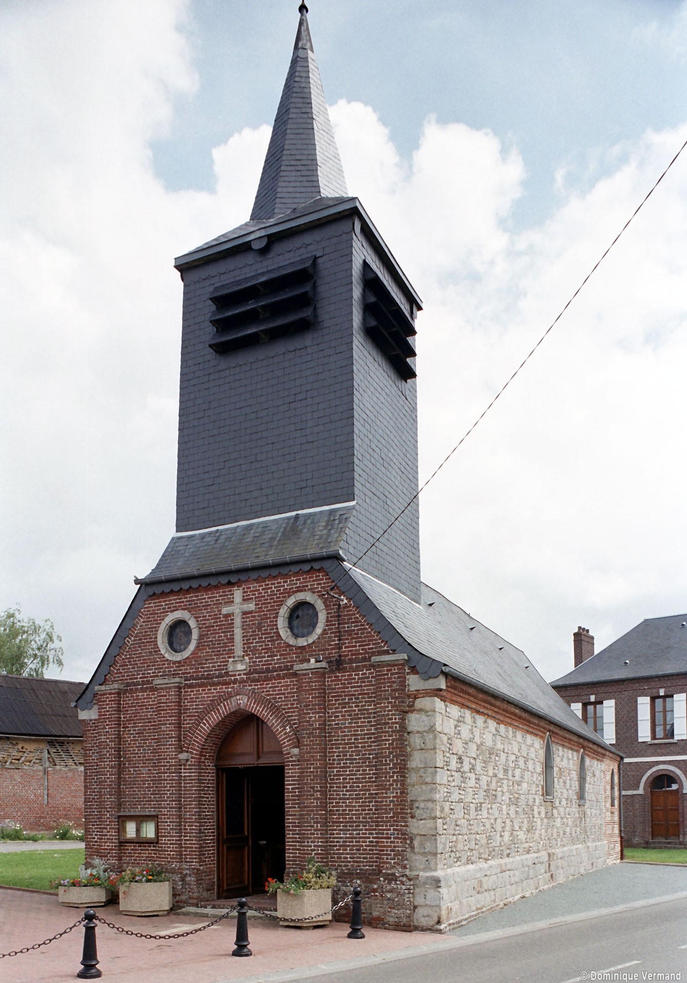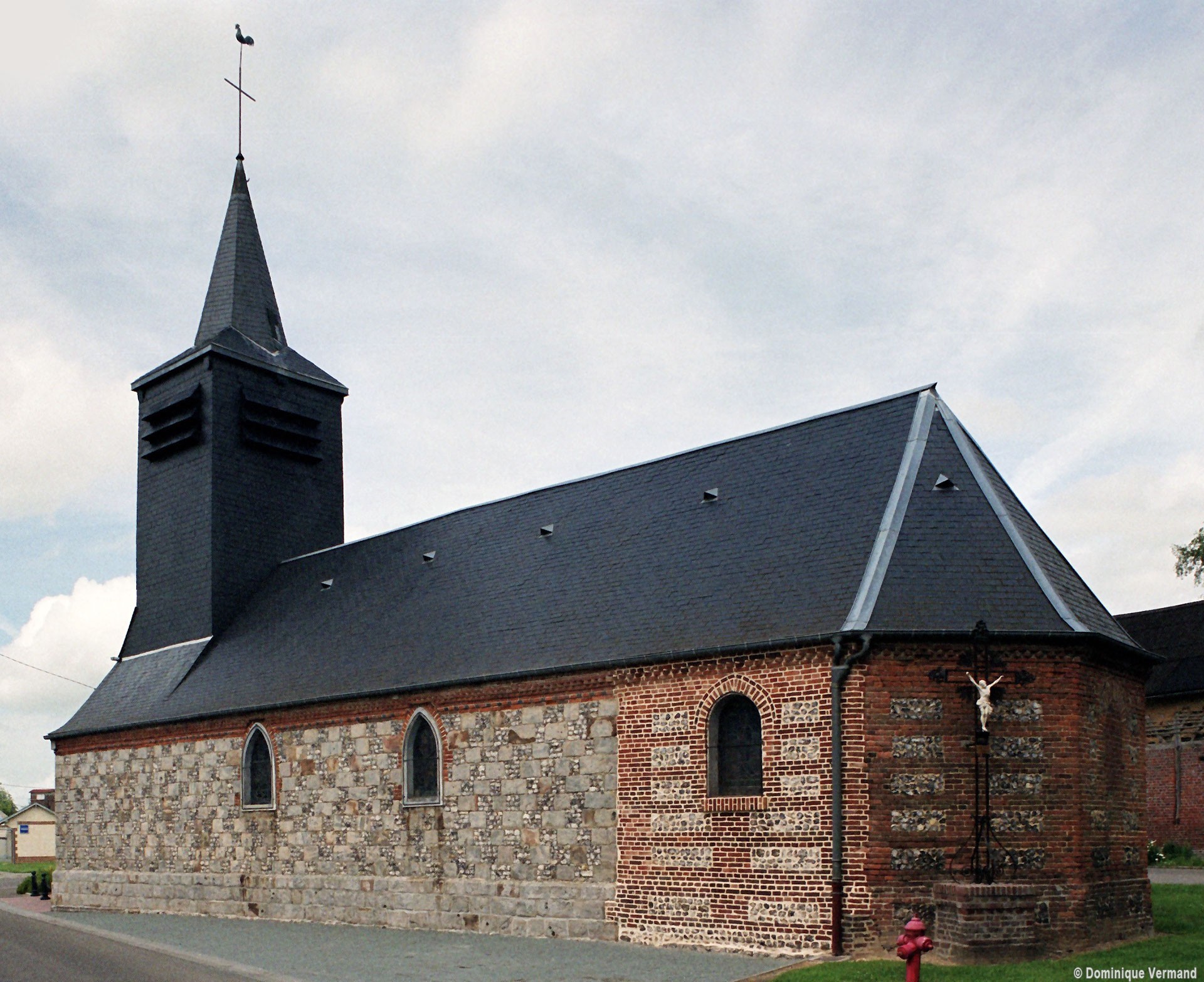 Partie la plus ancienne (16ème siècle ?), le mur sud montre un très bel exemple de damier de grés et de silex. Refaits au 17ème siècle, le choeur et le mur nord font appel à la brique, alternant avec des bandes de silex. La façade et la sacristie, enfin, sont entièrement en briques. D’une couleur rouge homogène, celles-ci sont caractéristiques de la fabrication industrielle en vigueur à partir du 19ème siècle.