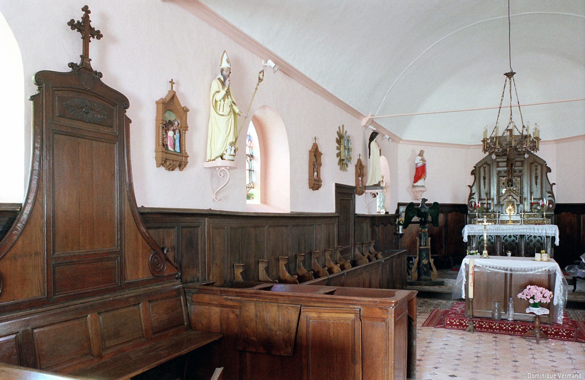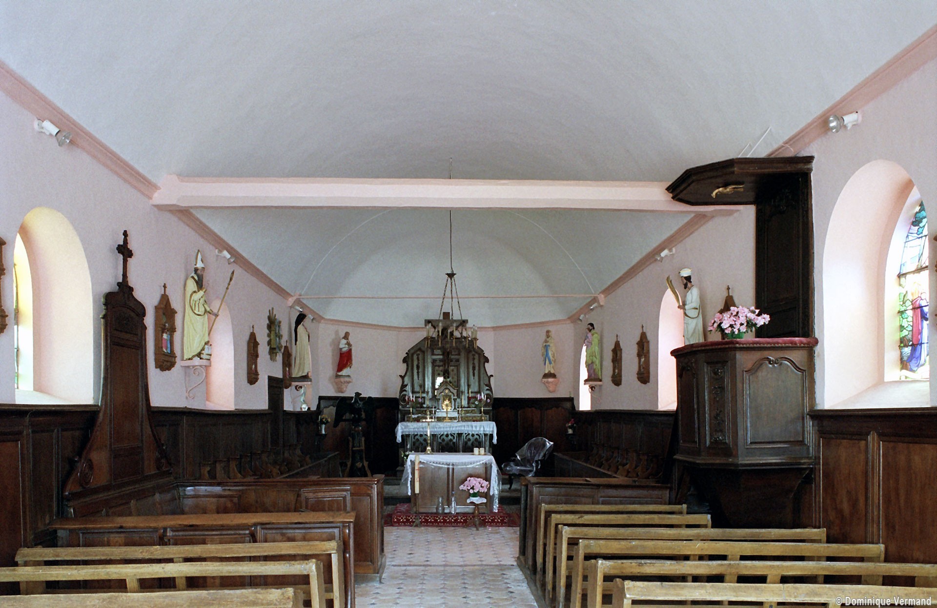 L’intérieur n’appelle pas de commentaires particuliers si ce n’est pour son mobilier du 18ème siècle, simple mais très complet : boiseries, stalles, banc d’oeuvre, retable, chaire à prêcher, lutrin, confessionnal. Plusieurs statues en bois, repeintes, peuvent être anciennes : sainte Marguerite, saint Nicolas, Vierge…On remarquera enfin, au-dessus de la porte d’accès à la sacristie, un charmant petit reliquaire des saints Côme et Damien dans une gloire en bois sculpté (2007).