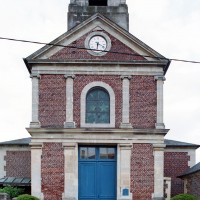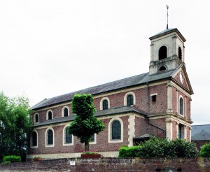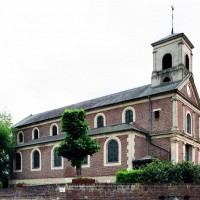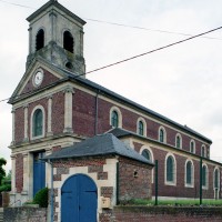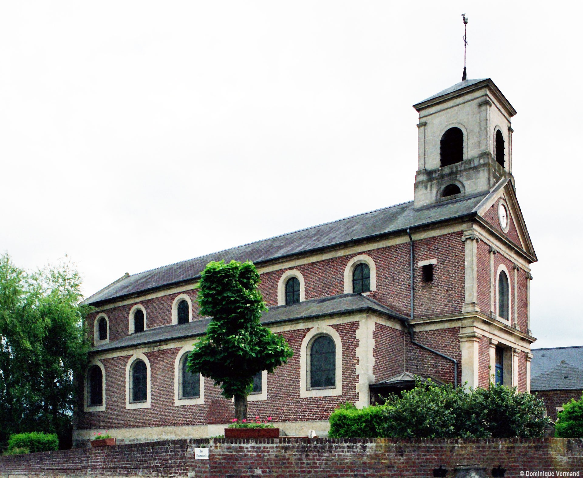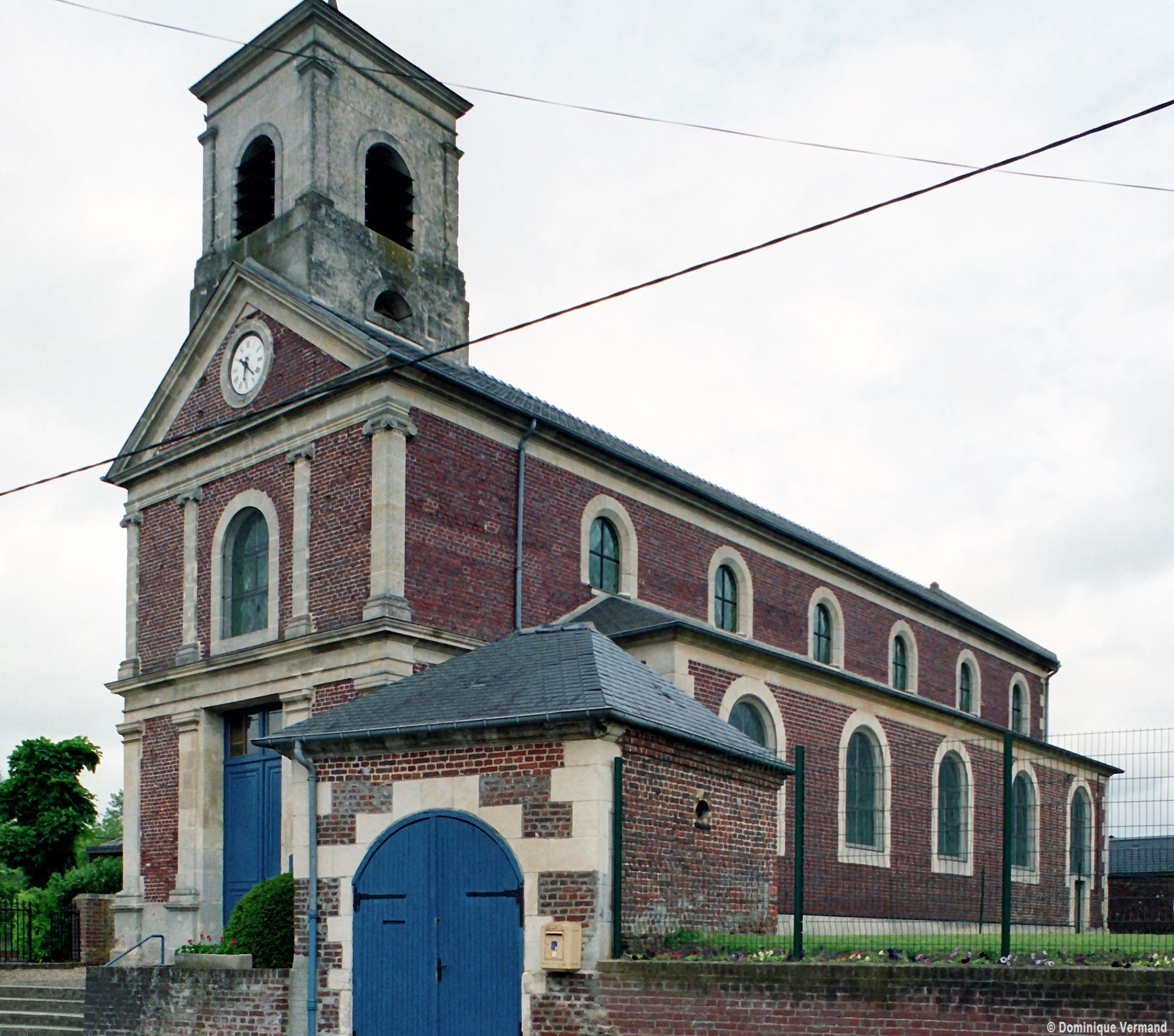 Saint-Laurent est un édifice assez vaste, construit en briques et pierre sur soubassement de grès, dont la première pierre a été posée en 1849 comme l’atteste une inscription. Son plan comprend une nef de quatre travées avec bas-côtés, terminée par un choeur à chevet plat. Une sacristie et une annexe flanquent le choeur dans le prolongement des bas-côtés et un avant-corps avec tribune, à l’ouest de la nef, porte le clocher.