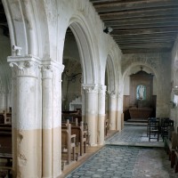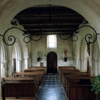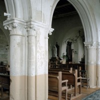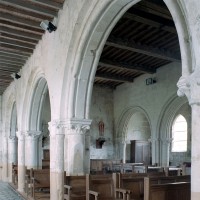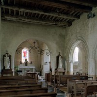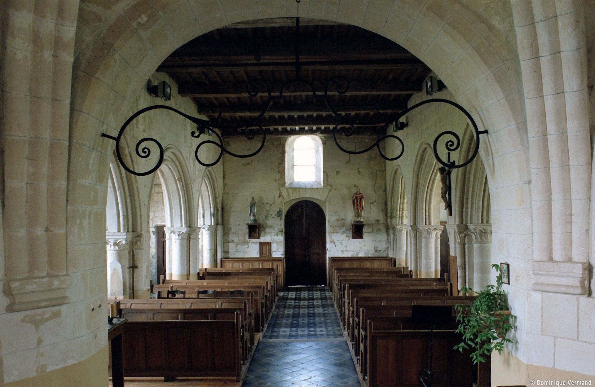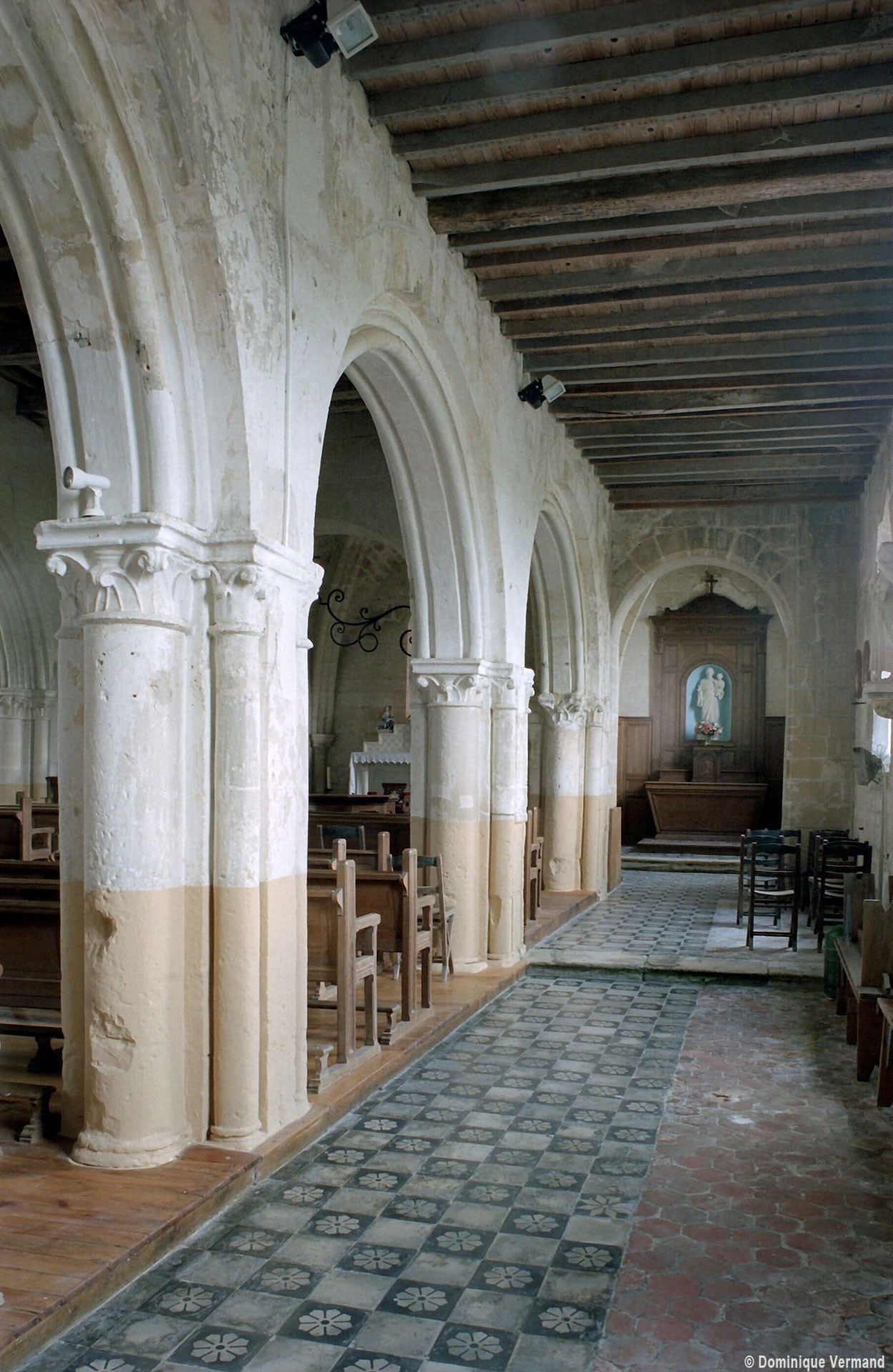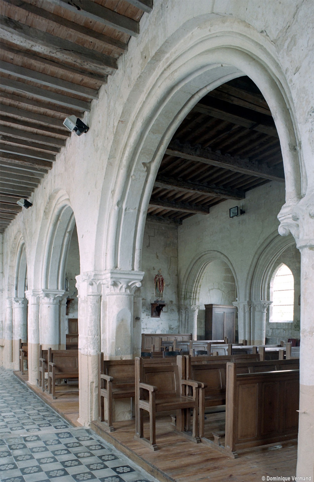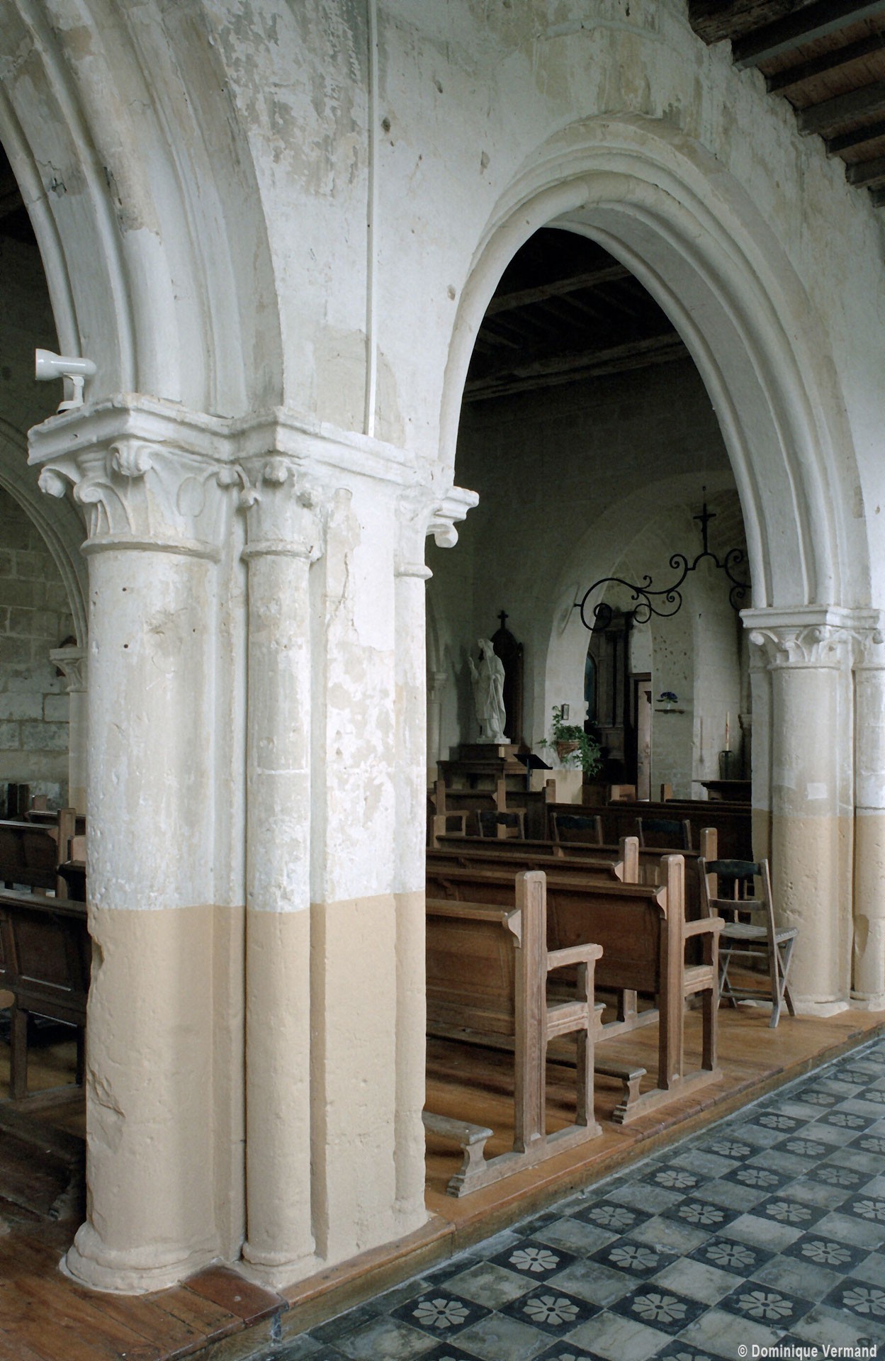 C’est vers la fin du 12ème siècle que la nef unique d’origine est modifiée pour lui adjoindre des bas-côtés. Trois arcades sont alors percées dans les murs gouttereaux nord et sud selon la technique de la reprise en sous-oeuvre, un procédé très courant à l’époque car il permettait de conserver la charpente d’origine. En plein cintre et profilées de deux tores entre un méplat, ces arcades comportent un ressaut et sont reçues sur des piles composées de deux demi-colonnes et de quatre colonnettes. Les chapiteaux sont à crochets et l’ensemble, très soigné dans sa réalisation, confère à la nef une belle élégance malgré la simplicité du parti adopté puisqu’il n’y a pas de voûtes en pierre.