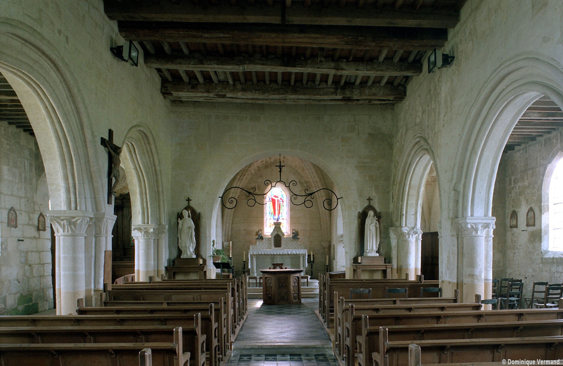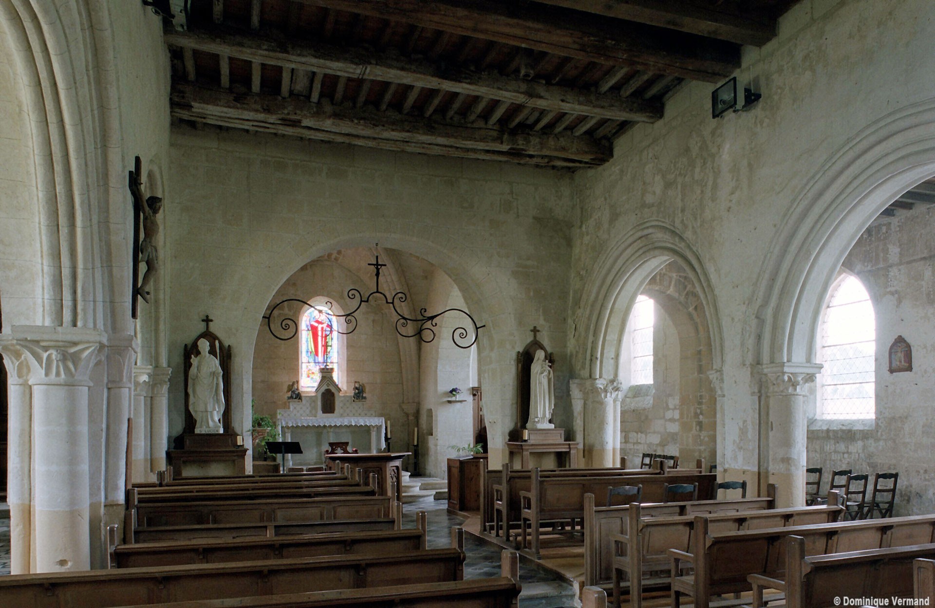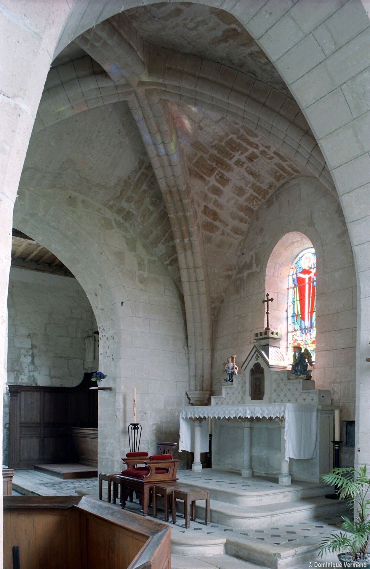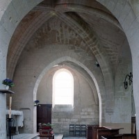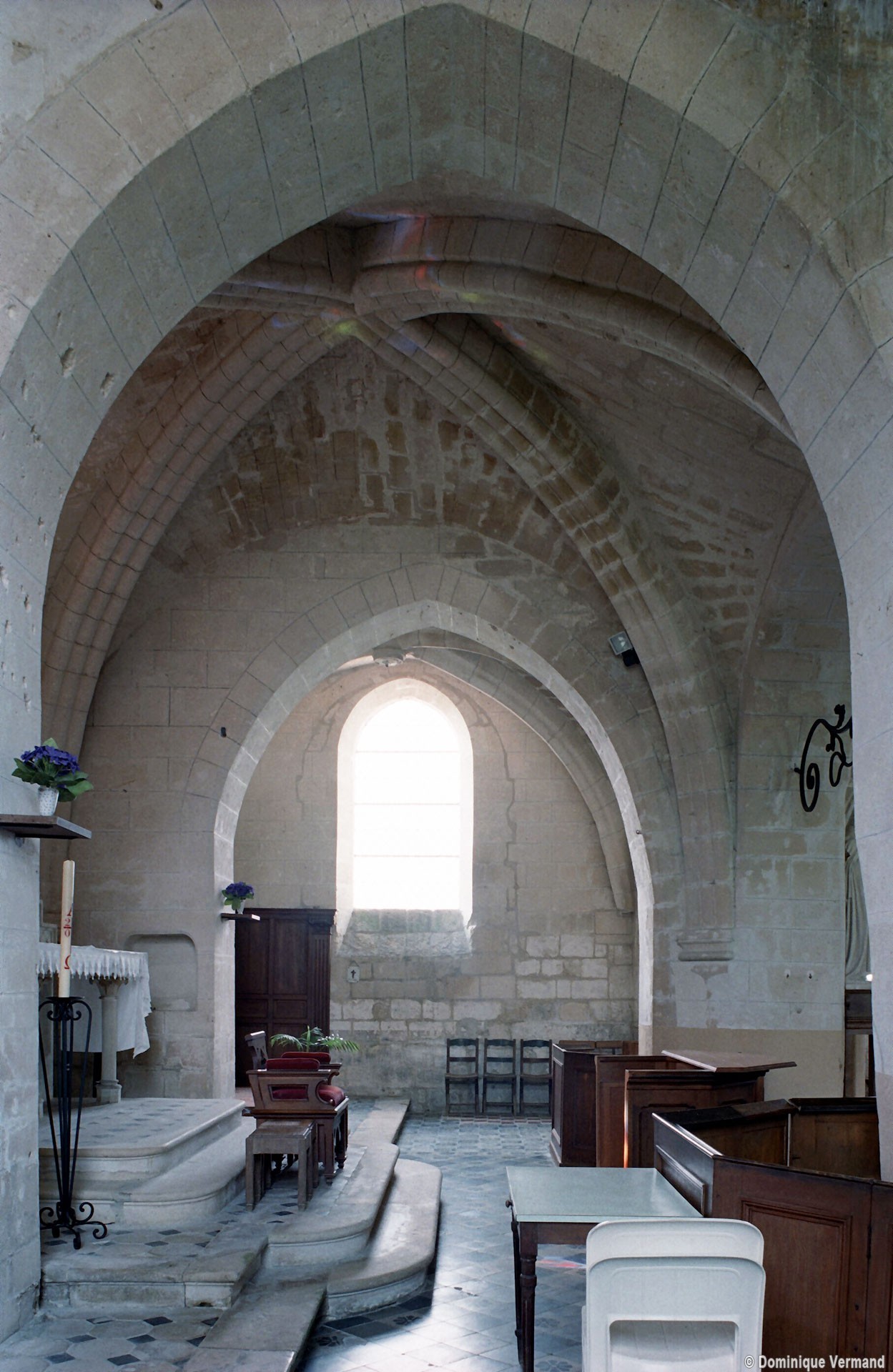 D’une première construction reste la nef du 11ème siècle. Son existence en tant que nef unique, modifiée par la suite pour lui adjoindre des bas-côtés, est attestée notamment par trois petites fenêtres bouchées visibles en partie haute des murs gouttereaux et par deux contreforts plats en façade. Un nouveau choeur d’une seule travée lui est adjoint vers les années 1120, à moins qu’il ne soit simplement modifié à cette époque. Relativement bien conservé, ce dernier se caractérise en effet par la présence d’une voûte d’ogives dont les caractéristiques – ogives épaisses à trois tores identiques, voûtains fortement inclinés, absence d’arcs formerets – l’inscrivent parmi la première génération de ce type de voûtement. Les chapiteaux ont malheureusement disparu ou ont été refaits.
