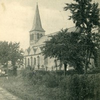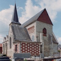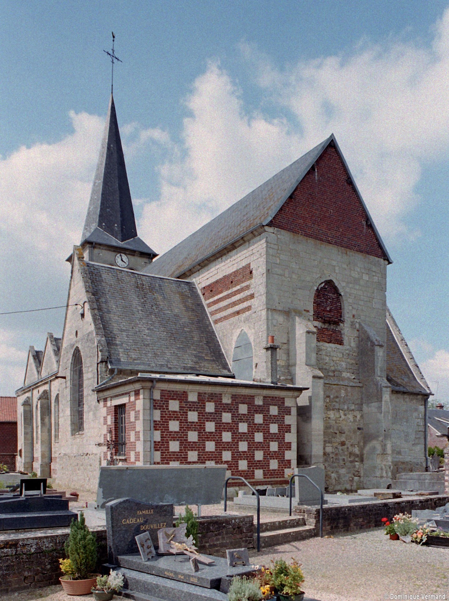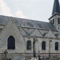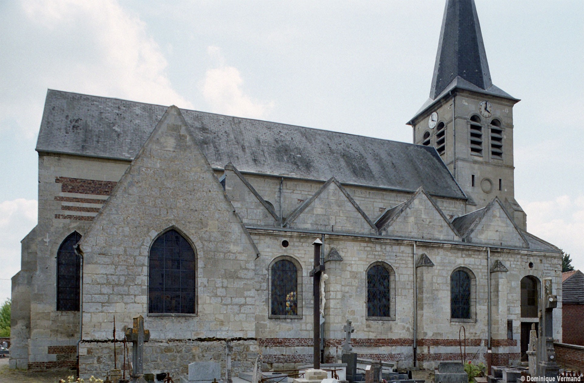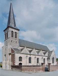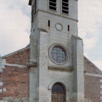 A l’extérieur, bas-côtés et croisillons reçoivent des toitures indépendantes en bâtière qui correspondent à autant de petits pignons triangulaires. Tout le côté sud a été refait après 1918. Le clocher, qui appartient également au 19ème siècle, est lui aussi de style néoclassique dans le traitement de ses baies en plein cintre. Toute sa face sud porte encore les traces de nombreux impacts de balles.