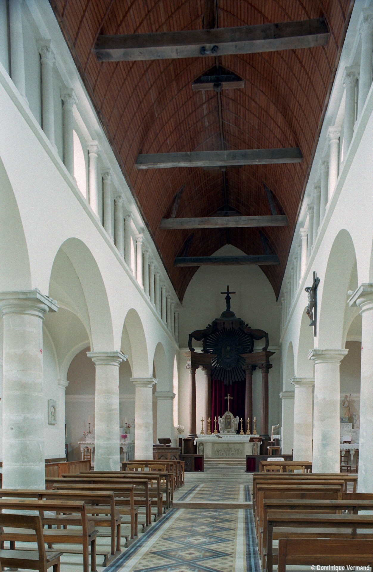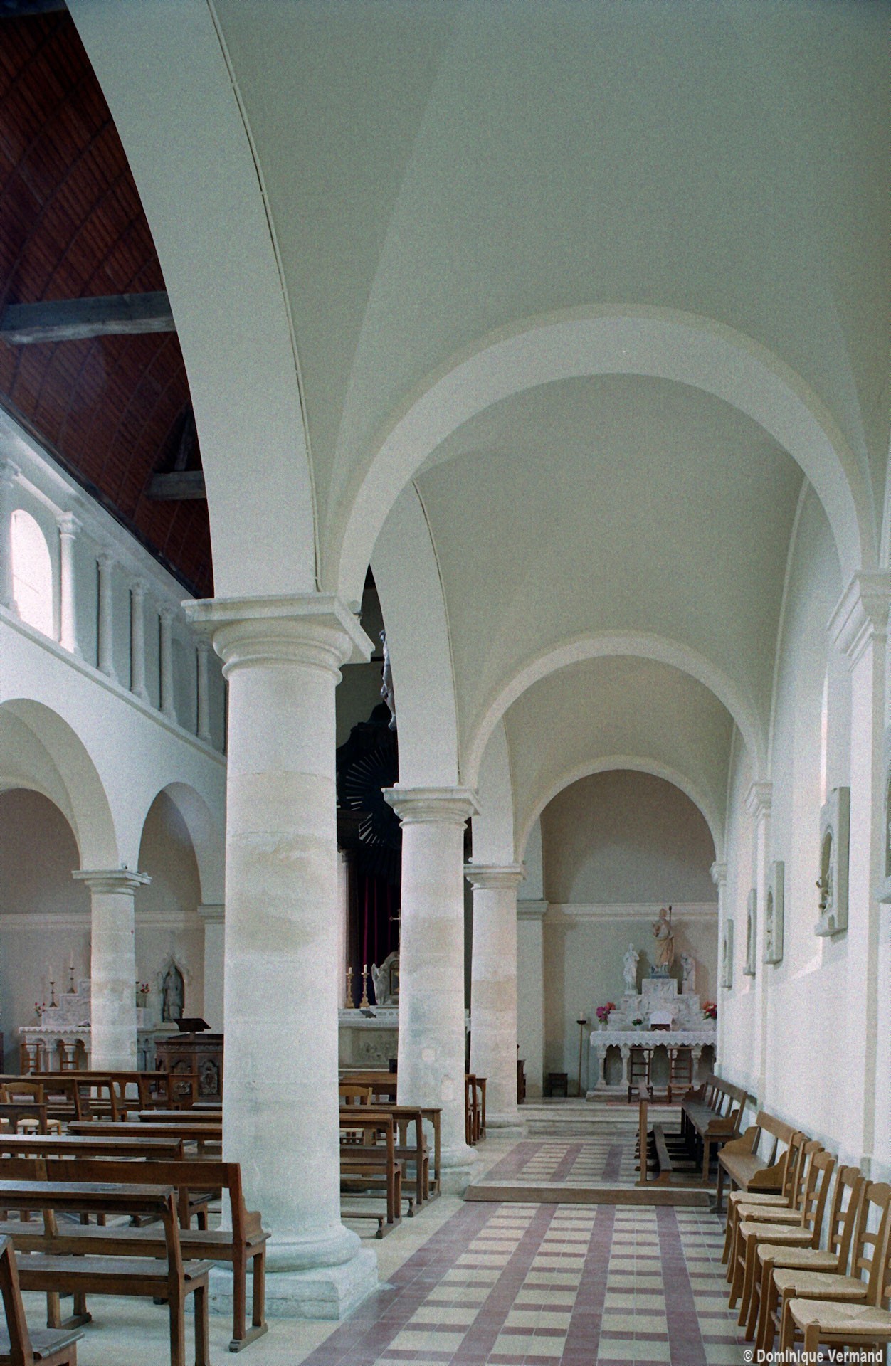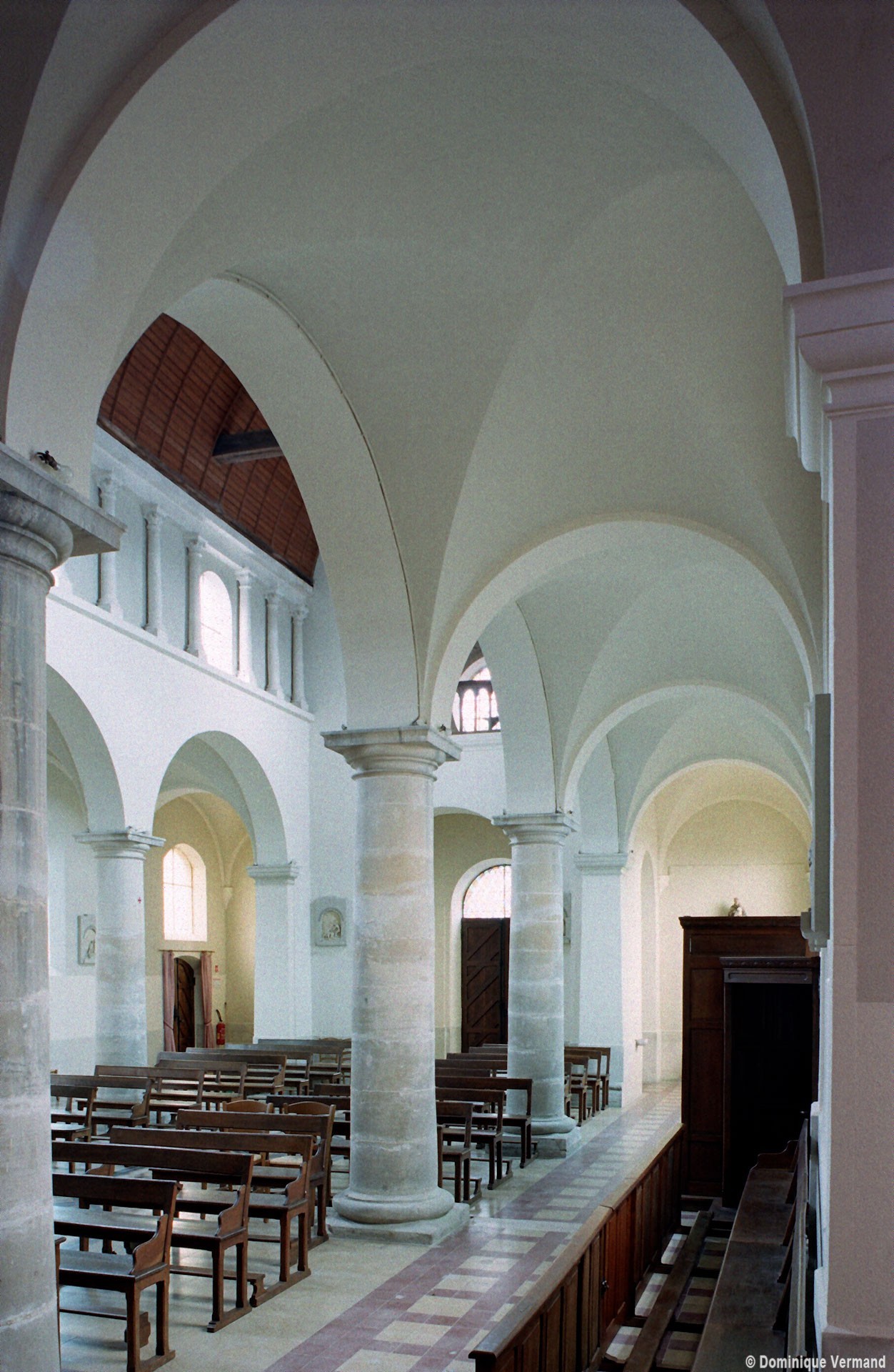 La nef est remarquable par l’ampleur de ses volumes, qui lui confère une réelle monumentalité. Les grandes arcades occupent les deux tiers de la hauteur. En plein cintre, elles sont reçues sur des piles circulaires par l’intermédiaire de chapiteaux doriques. La travée correspondant aux croisillons est semblable aux autres, renforçant ainsi l’unité de l’ensemble. Celle-ci est encore accentuée au niveau supérieur qui, par sa conception, annexe visuellement le choeur au reste de l’édifice. Très court et encadré par deux corniches, il est formé d’une suite continue de colonnettes en délit que surmonte un chapiteau. Au droit de chaque arcade, deux de ces colonnettes encadrent une petite fenêtre en plein cintre. Inspirée de l’architecture antique, cette composition est un excellent exemple de style néoclassique. Une voûte en carène recouvre cet espace central jusqu’au mur de chevet. Les bas-côtés sont couverts de voûtes d’arêtes et les croisillons d’une voûte en berceau.