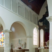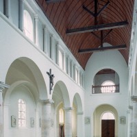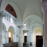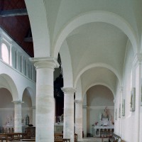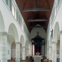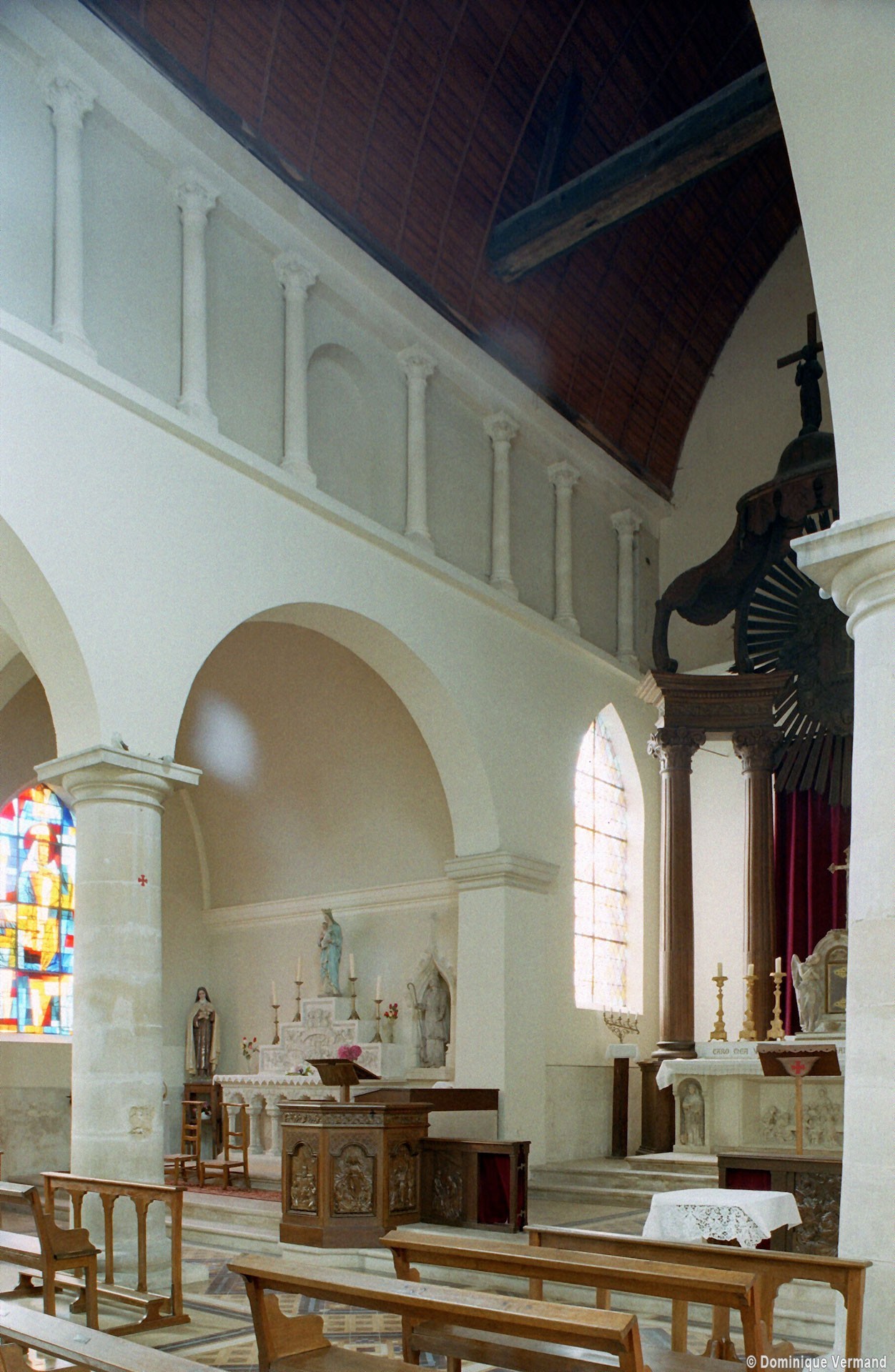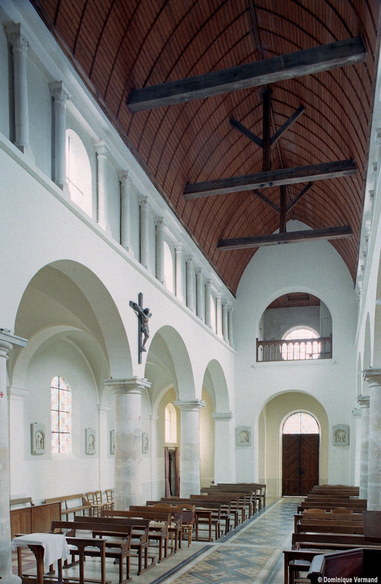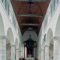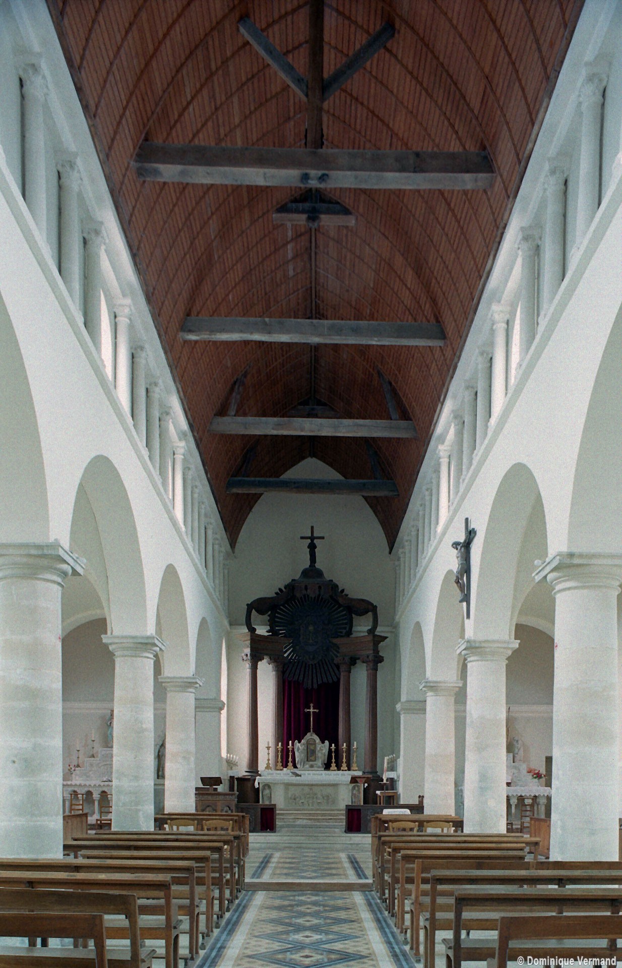 La nef est remarquable par l’ampleur de ses volumes, qui lui confère une réelle monumentalité. Les grandes arcades occupent les deux tiers de la hauteur. En plein cintre, elles sont reçues sur des piles circulaires par l’intermédiaire de chapiteaux doriques. La travée correspondant aux croisillons est semblable aux autres, renforçant ainsi l’unité de l’ensemble. Celle-ci est encore accentuée au niveau supérieur qui, par sa conception, annexe visuellement le choeur au reste de l’édifice. Très court et encadré par deux corniches, il est formé d’une suite continue de colonnettes en délit que surmonte un chapiteau. Au droit de chaque arcade, deux de ces colonnettes encadrent une petite fenêtre en plein cintre. Inspirée de l’architecture antique, cette composition est un excellent exemple de style néoclassique. Une voûte en carène recouvre cet espace central jusqu’au mur de chevet. Les bas-côtés sont couverts de voûtes d’arêtes et les croisillons d’une voûte en berceau.