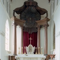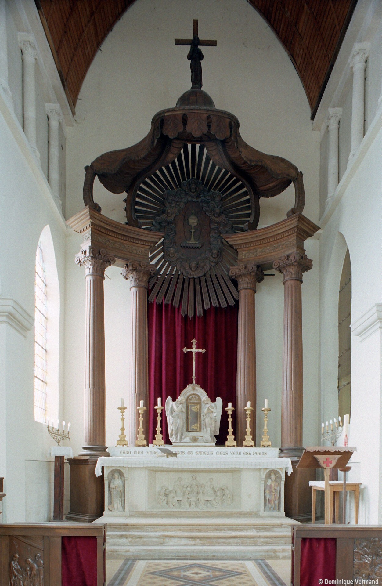 Le mobilier de l’église conserve un spectaculaire maître-autel à baldaquin. Une clôture de choeur et une chaire à prêcher, du 19ème siècle, en bois sculpté avec remplois plus anciens, méritent également l’attention (2008).