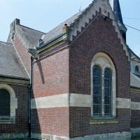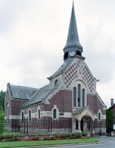 C’est un édifice de style néo-roman bâti principalement en briques, avec damier de briques et pierre en façade. Le plan comprend une nef de deux travées, un transept saillant et un court choeur à chevet plat. La nef est précédée par un massif de façade avec petit porche dont le corps central, qui abrite une tribune, domine les toitures de l’édifice et sert de base à une flèche octogonale aigue en charpente et ardoises. Les deux arcades en plein cintre de la nef sont reçues au centre sur une pile circulaire surmontée d’un chapiteau cubique.